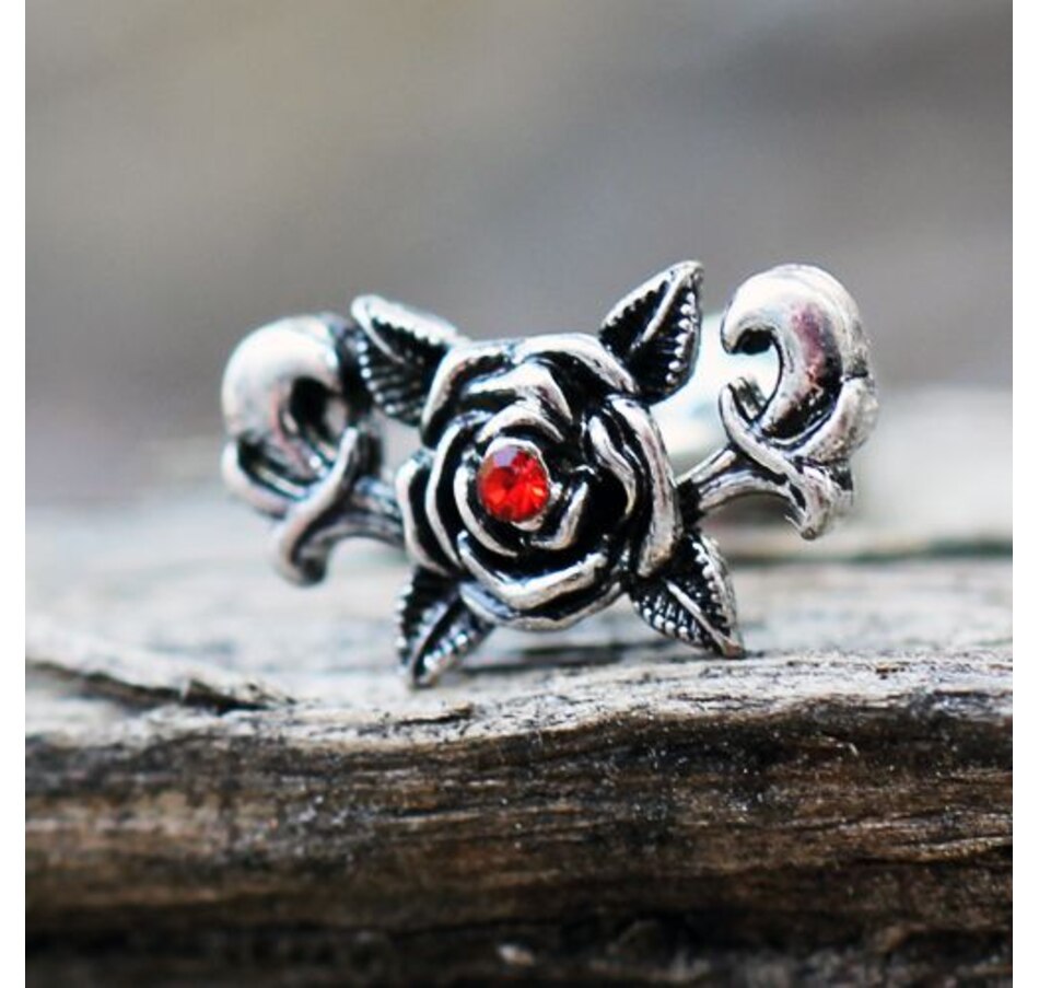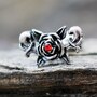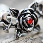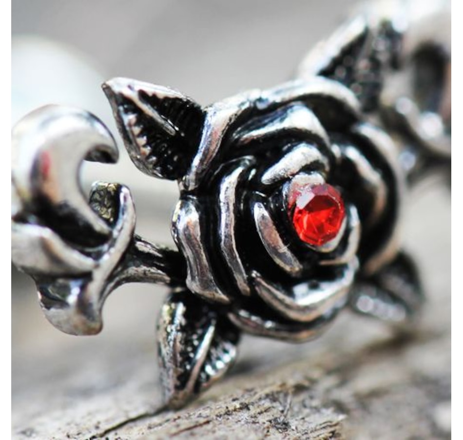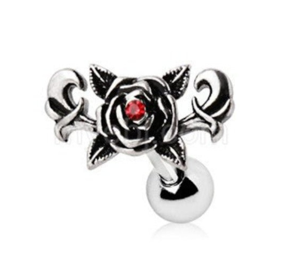 Cartilage / Tragus Earring with Rose Design‚Gothic design of a rose and leaves‚Red color CZ in the center of rose‚Jewelry is partially plated in Black‚Bar Thickness : 16GA | 1.2mm‚Bar Length : 1/4" | 6mm‚Rose Design Size : 11(L) x 6.5(W)mm‚Ball Size : 4mm‚Thread Type : Externally Threaded‚Material : 316L Stainless Steel, Zinc Alloy, Cubic Zirconia
