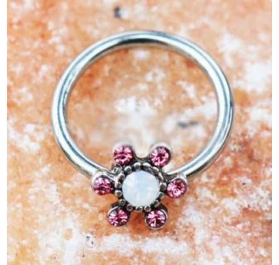 Snap-in Captive Bead Ring / Septum Ring with Flower Design‚White Synthetic Opal and Pink CZ on the flower‚Versatile jewelry can be worn as Captive Bead Ring or Septum Jewelry‚Easy Snap-in jewelry‚Ring Thickness : 16GA | 1.2mm‚Ring Diameter : 3/8" | 10mm‚Flower Size : 6.5 x 6.5mm‚Material : 316L Stainless Steel, Zinc Alloy, Synthetic Opal, Cubic Zirconia