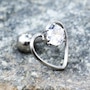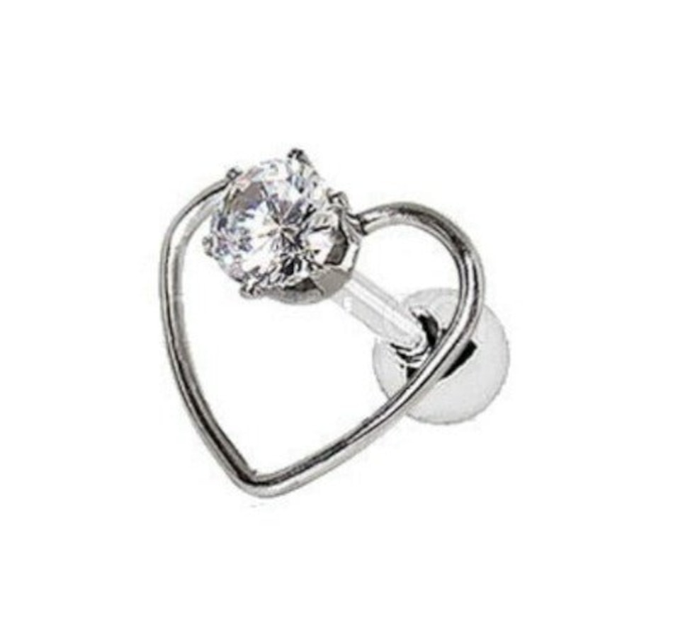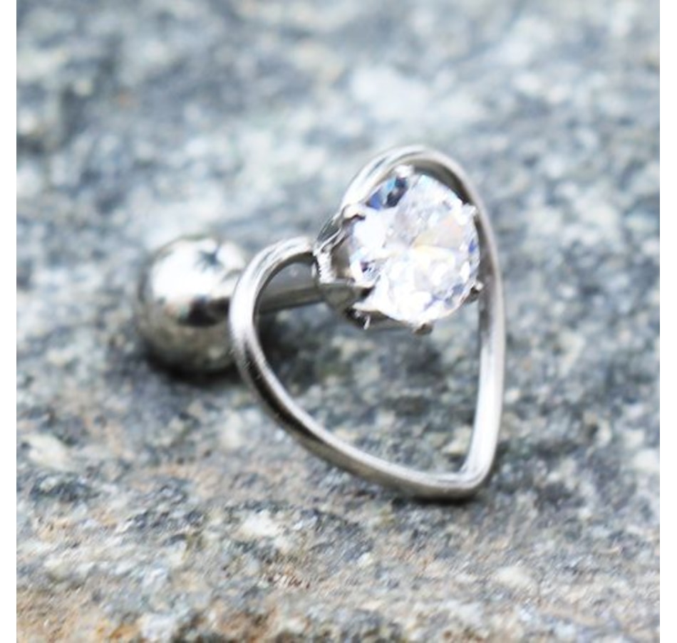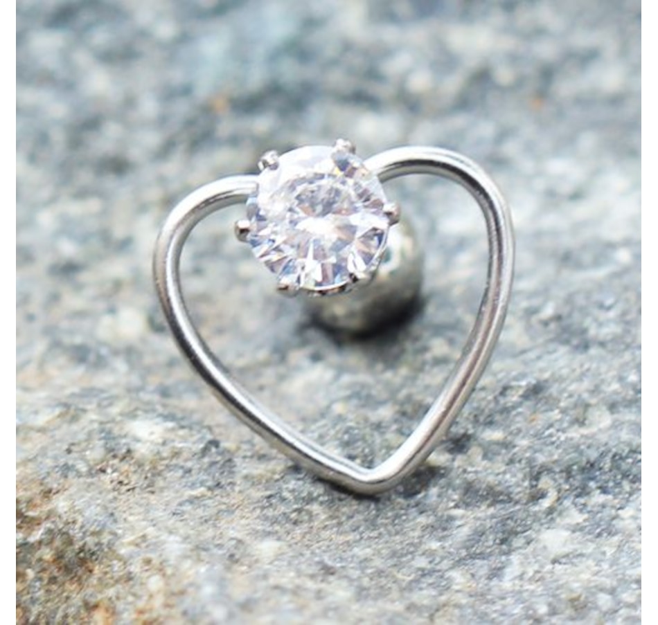 Heart Shaped Cartilage Earring with Prong Set CZ‚ ‚Prong Set 4mm round Clear CZ‚Attached heart shaped ring‚Bar Thickness : 16GA | 1.2mm‚Bar Length : 1/4" | 6mm‚Heart Size : 10.5 x 10mm‚CZ Size : 4mm‚Ball Size : 4mm‚Thread Type : Externally Threaded‚Material : 316L Stainless Steel, Cubic Zirconia