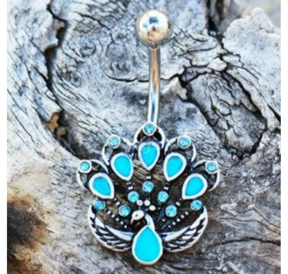 Peacock shaped Navel Ring / Belly Button Ring‚Peacock is decorated with Aqua color CZ and Teal color enamel‚Jewelry is partially plated in Black for a contrast‚Bar Thickness : 14GA | 1.6mm‚Bar Length : 3/8"" | 10mm‚Peacock Size : 19 x 19mm‚Material : 316L Stainless Steel, Zinc Alloy, Cubic Zirconia, Enamel