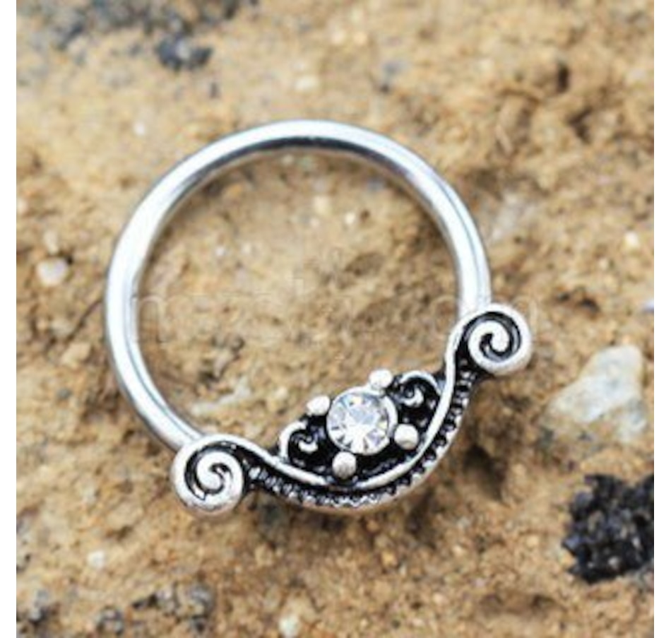316L Stainless Steel Captive Bead Ring with an Ornate design‚Antique & Ornate design Snap-In‚Clear round CZ‚Easy snap-in jewelry‚Unique jewelry can be worn as CBR or Setpum Jewelry‚Partially plated in Black for an antique apperance‚Ring Thickness : 16GA | 1.2mm‚Ring Inner Diameter : 3/8" | 10mm‚Ornate Design Size : 13x4mm‚Material : 316L Stainless Steel, Zinc Alloy, Cubic Zirconia