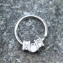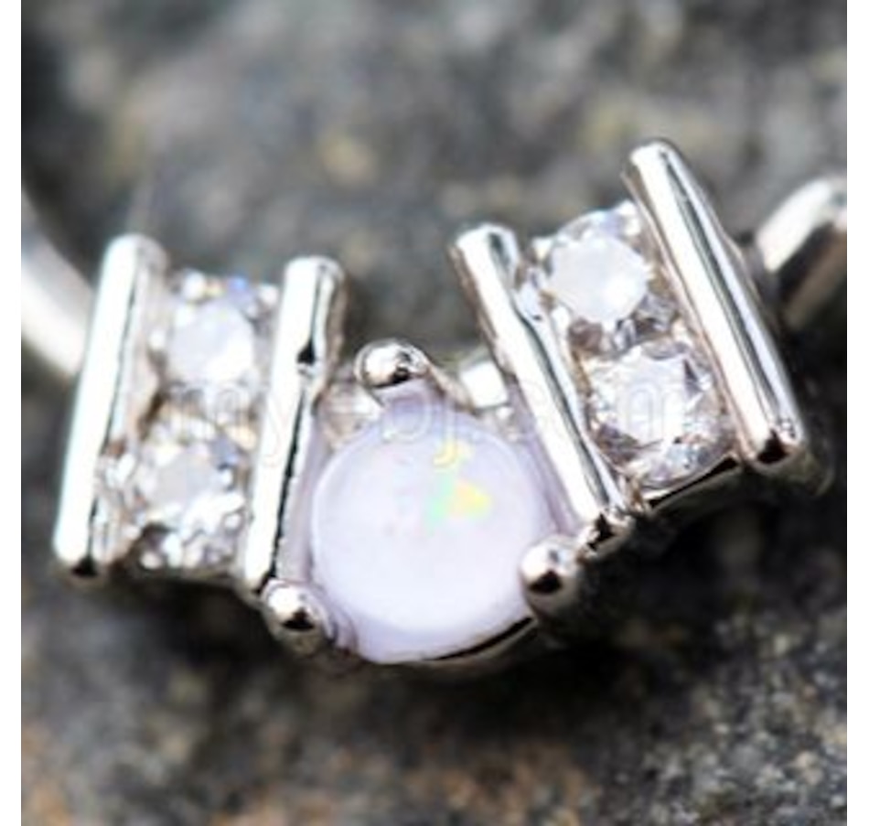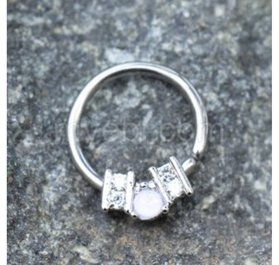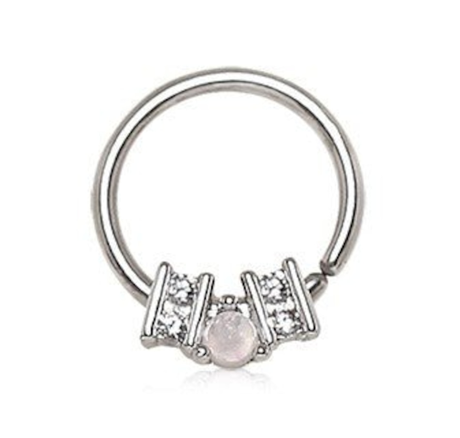 Seamless Ring / Septum Ring with Ornate Design‚Combination of Clear CZ and White Synthetic Opal‚Two (2) Clear round CZ captured in a double bar on each side‚Versatile jewelry that can be worn as Lip Ring, Septum Ring, Cartilage Earring and more‚Ring Thickness : 16GA | 1.2mm‚Ring Inner Diameter : 3/8" | 10mm‚Ornate Design Size : 8 x 5mm‚Material : 316L Stainless Steel, Zinc Alloy, Synthetic Opal, Cubic Zirconia‚ *Sold in Singles