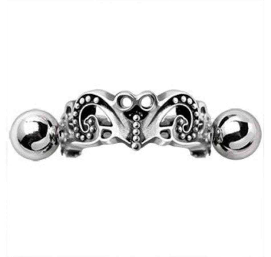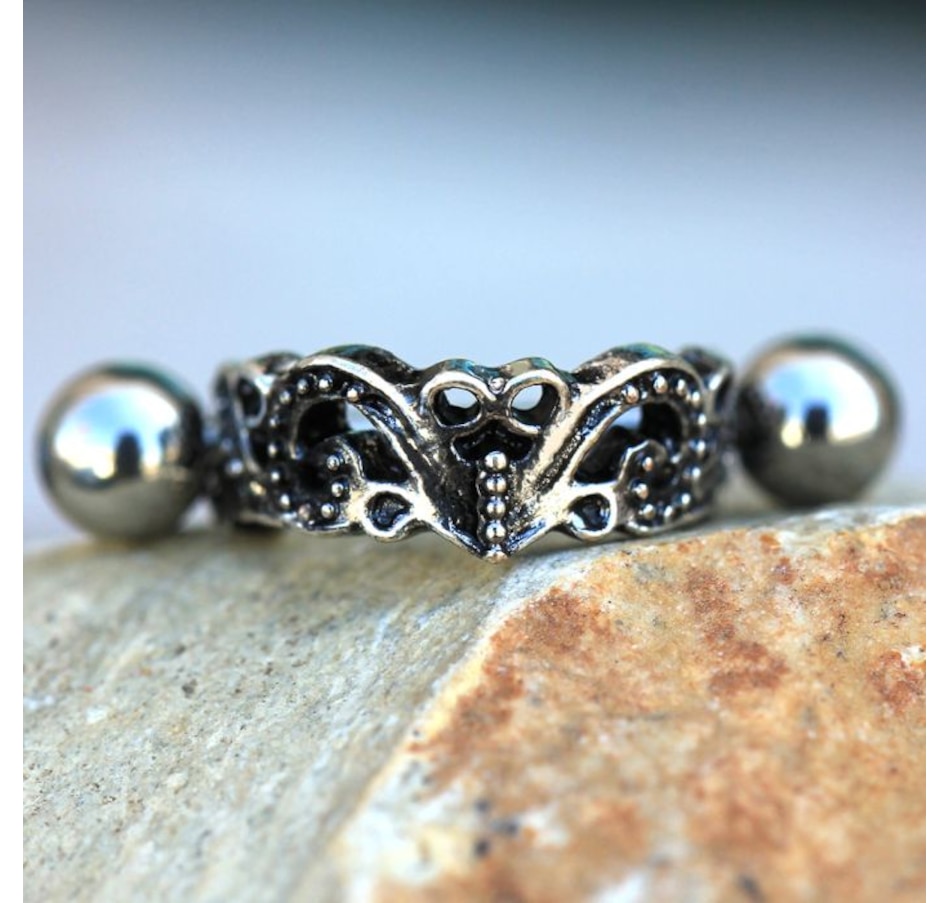 Cartilage / Helix Cuff Earring with an Ornate Tiara Design‚Ornate tiara design cuff with much details‚Barbell Thickness : 16GA | 1.2mm‚Barbell Length : 1/2" | 12mm‚Cuff Size : 11.5 (L) x 8.5(W)mm‚Ball Size : 4mm‚Thread Type : Externally Threaded‚Material : 316L Stainless Steel, Zinc AlloySOLD in SINGLES