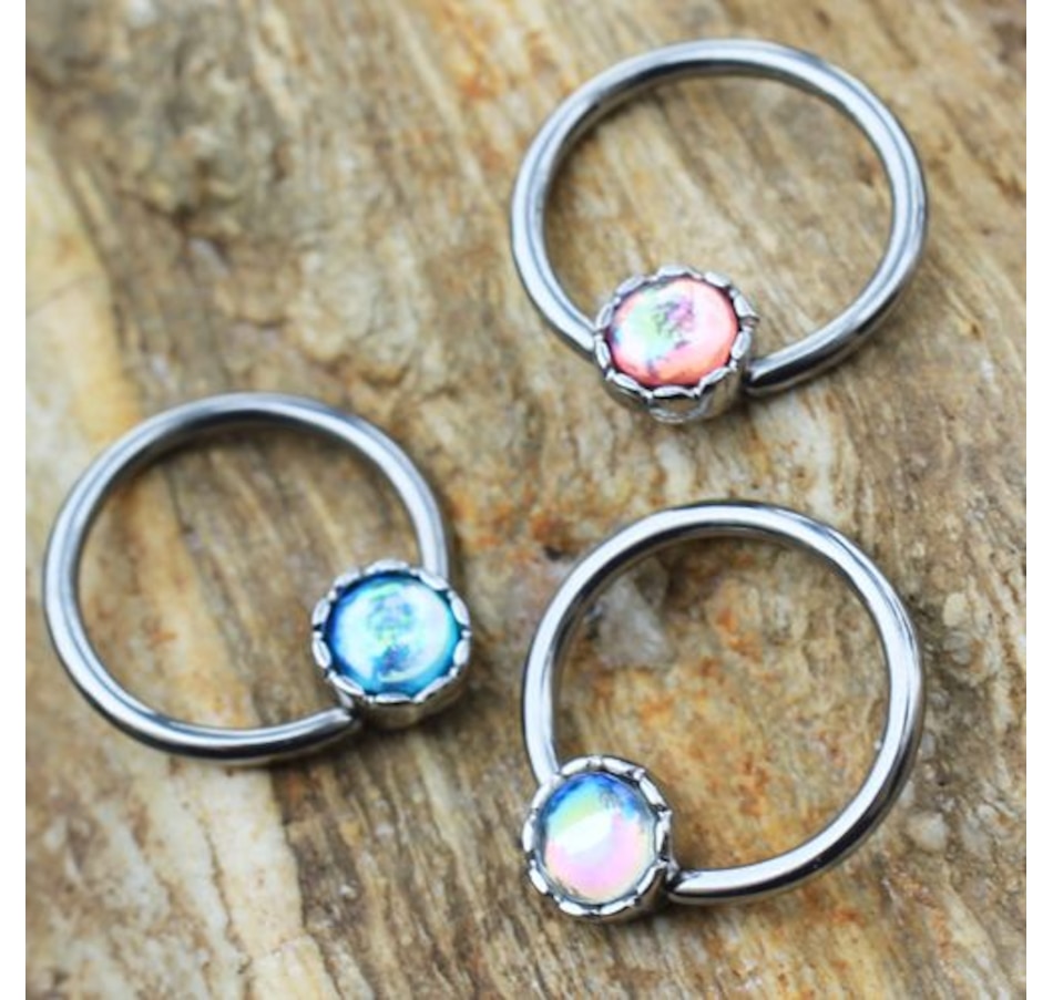 Nipple Ring / Captive Bead Ring‚Multi-color Rainbow rhinestone captured in decorative setting‚Versatile jewelry can be worn many places‚Easy to wear and remove with precise dimples‚Combined size of Opal & CZ is 6mm‚Ring Thickness : 14GA | 1.6mm‚Ring Inner Diameter : 9/16" | 14mm‚Ball Size : 6.5mm‚Available in White, Pink, and Aqua‚Material : 316L Stainless Steel, Rainbow Rhinestone