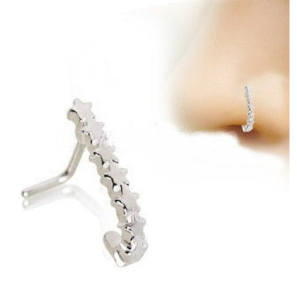 316L Stainless Steel "L" bend half nose hoop‚Multiple stars from top to bottom of the hoop‚Easy to wear "L" bend‚10mm in length from "L" band to the bottom of hoop‚Thickness : 20GA / 0.8mm‚Length : 10mm‚Material : 316L Stainless Steel, Zinc Alloy