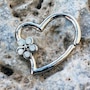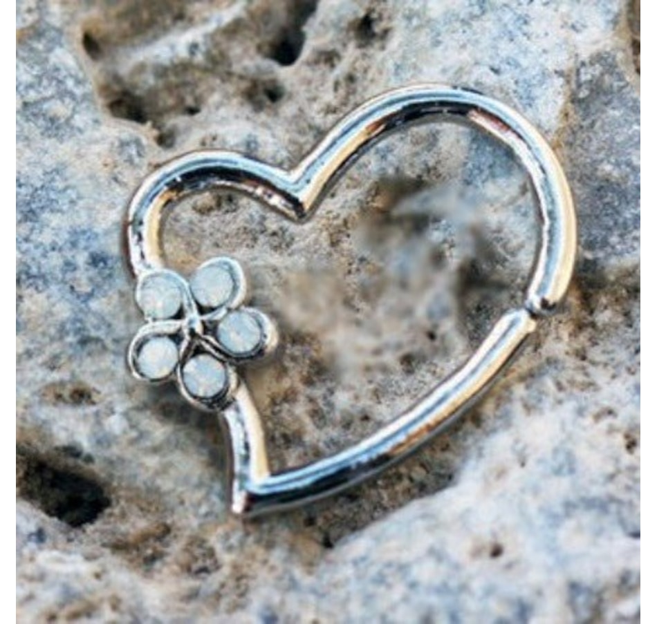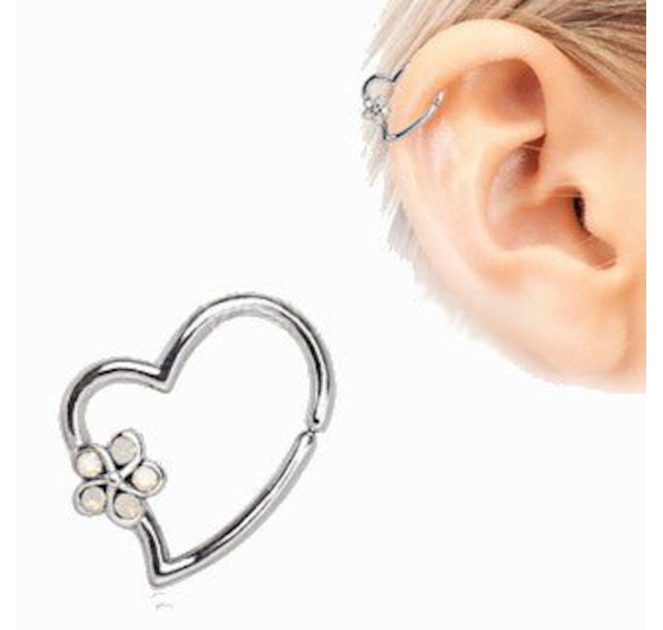Heart shaped Cartilage Earring with Flower Design‚Annealed (Flexible) 316L Stainless Steel Ring‚Five White Synthetic Opals on the flower‚Easy and comfortable to wear‚Ring Thickness : 16GA | 1.2mm‚Ring Inner Diameter : 3/8" | 10mm‚Flower Size : 4mm‚Material : 316L Stainless Steel, Zinc Alloy, Synthetic Opal