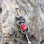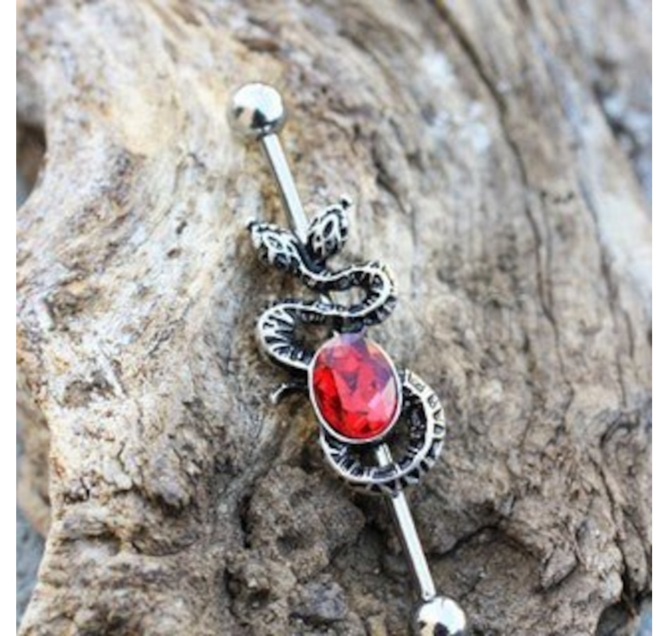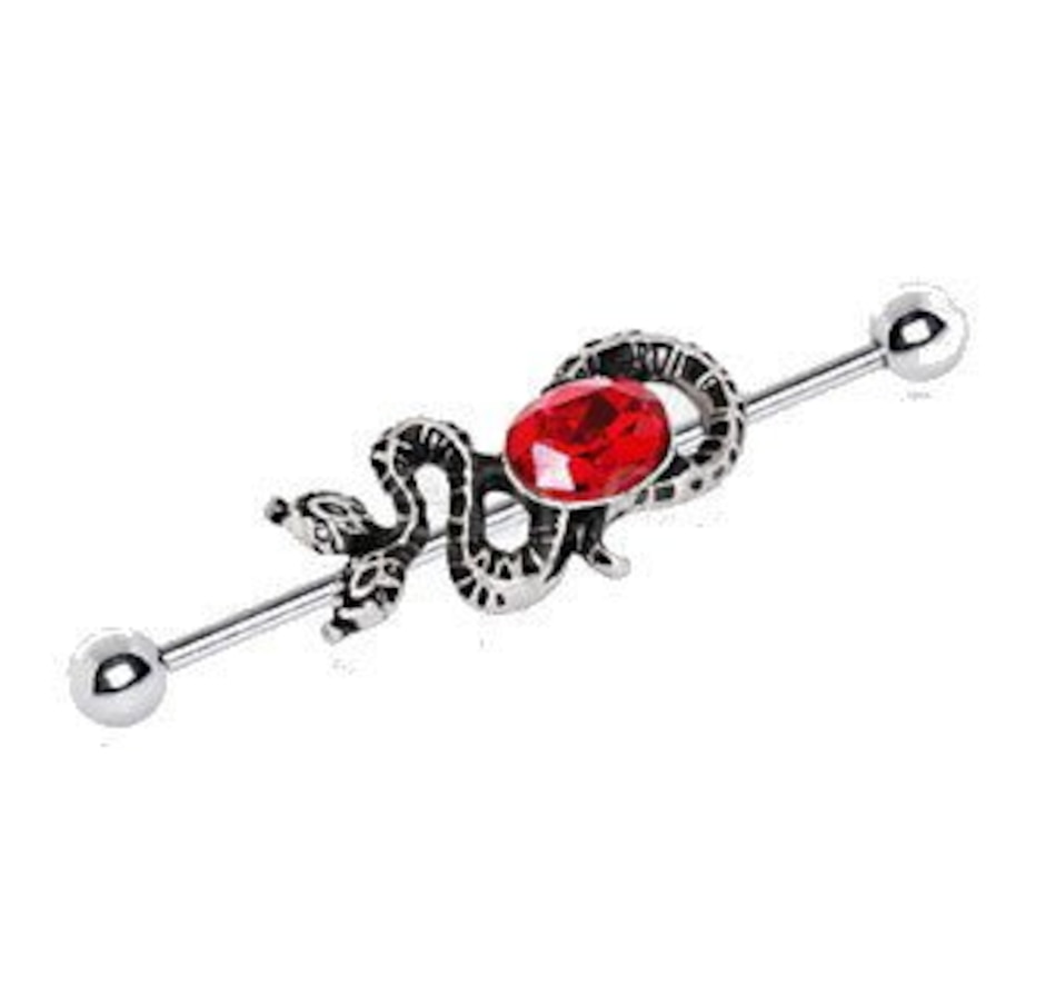 316L Stainless Steel Industrial Barbell‚Two-headed snake design with an oval shaped Red CZ‚Large size dark Red oval shape CZ‚Snake is partially plated in Black for an antique look‚A Black o-ring to hold the snake in it's place‚Red CZ size : 6.5x9.5mm‚Snake Size : 24x13mm‚Bar Thickness : 14GA | 1.6mm‚Bar Length : 1&1/2" | 38mm‚Ball Size : 5mm‚Material : 316L Stainless Steel, Cubic Zirconia
