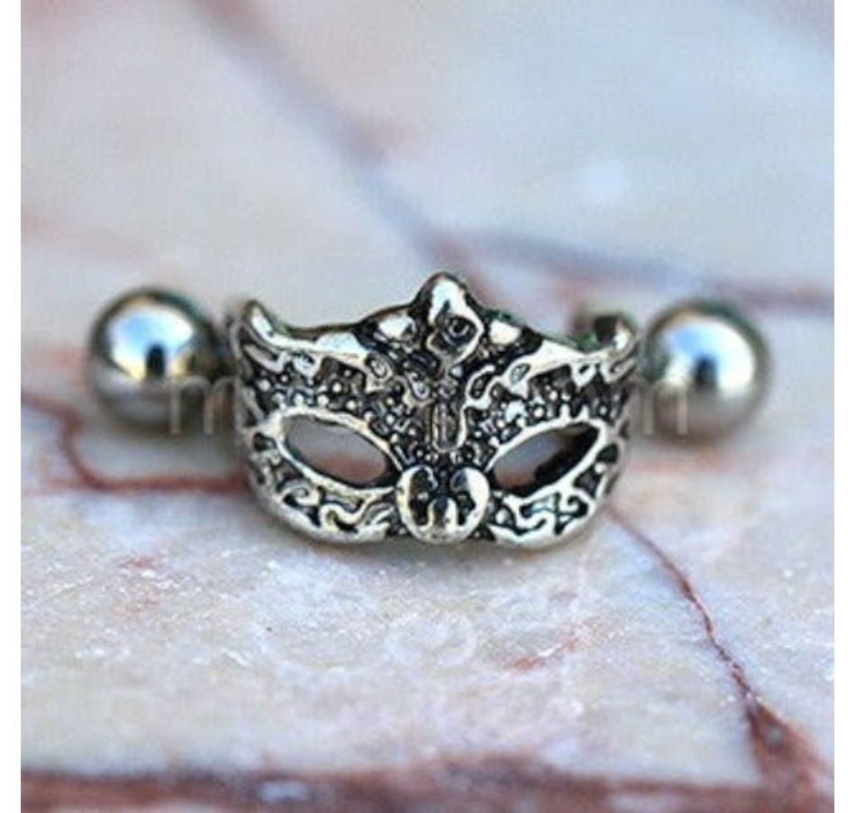 Cartilage / Helix Cuff Earring with a Venetian Mask Design‚Detailed design of a classic Venetian Mask‚Barbell Thickness : 16GA | 1.2mm‚Barbell Length : 1/2" | 12mm‚Cuff Size : 11.5 (L) x 10(W)mm‚Ball Size : 4mm‚Thread Type : Externally Threaded‚Material : 316L Stainless Steel, Zinc Alloy