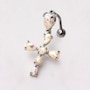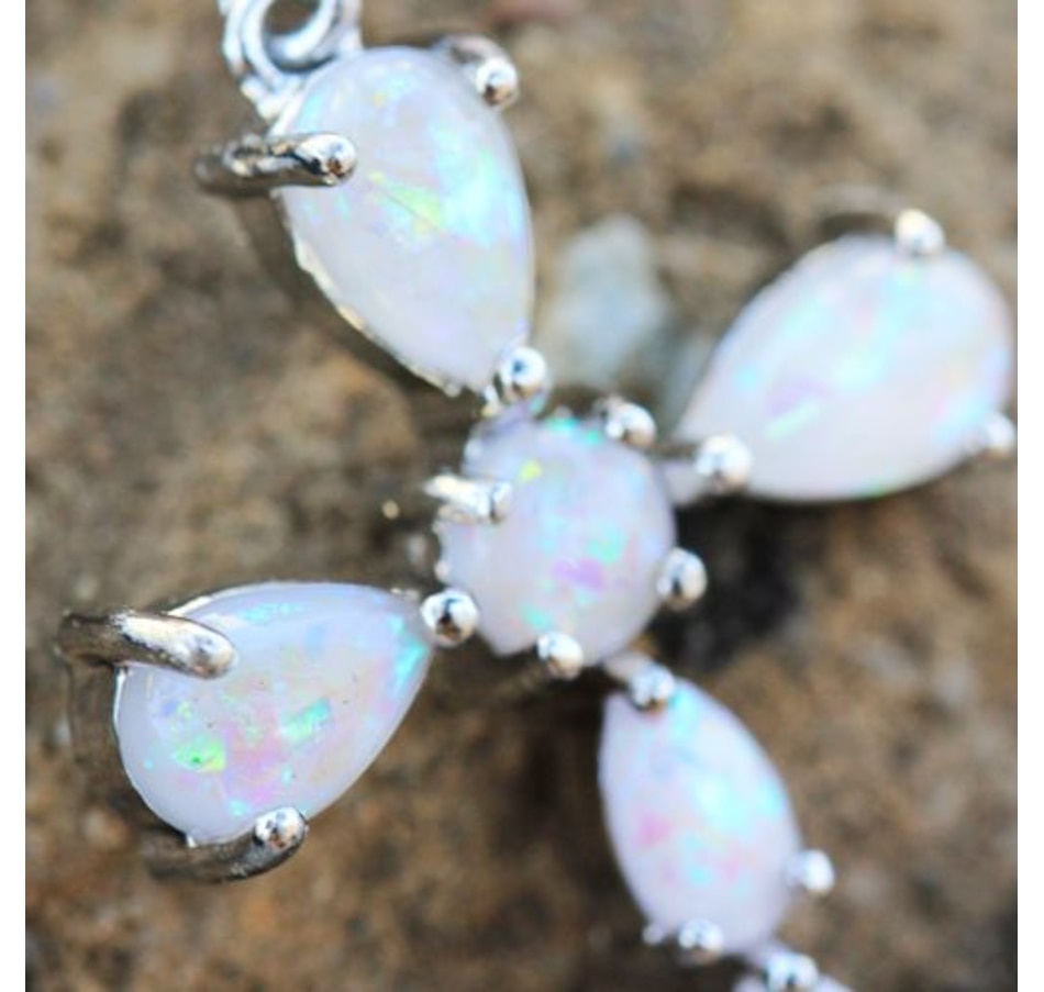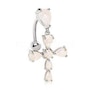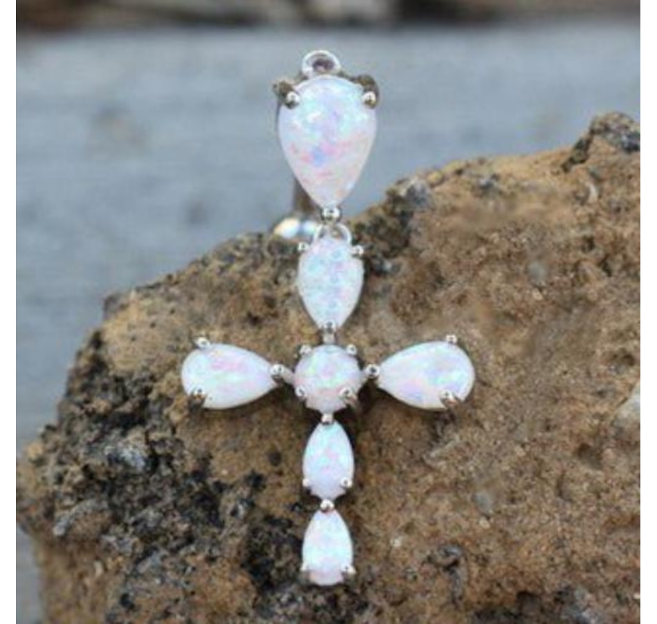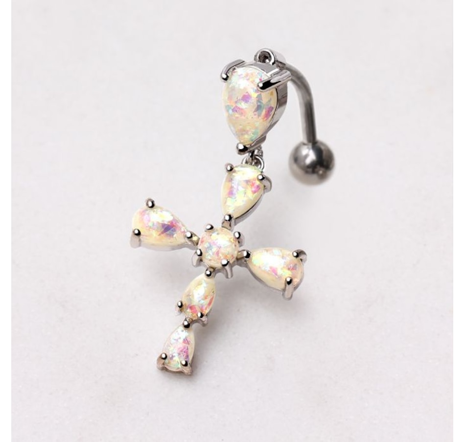 Belly Button Ring / Navel Ring with a Cross design‚White Synthetic Opal displays Rainbow-like Hues that changes with angle of observation‚Prongs Securely Holding Synthetic Opals‚Top Down Navel Ring‚Bar Thickness : 14GA | 1.6mm‚Bar Length : 3/8" | 10mm‚Cross Size : 18 x 22mm‚Material : 316L Stainless Steel, Zinc Alloy, Synthetic Opal