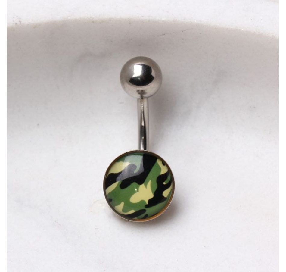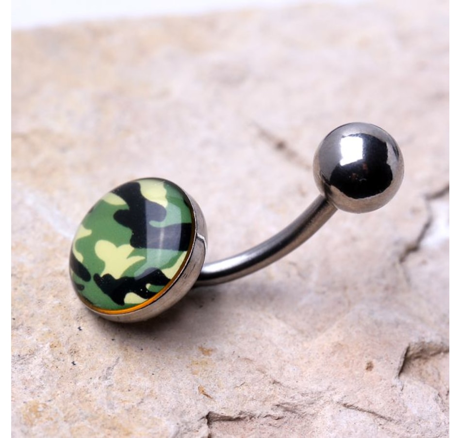 316L Surgical Steel Camouflage Navel RingAn ever popular design our Green Camo jewelry is always a best selling product! Crafted out of the highest quality 316L Surgical Steel and polished to a mirror finish this twist on a classic belly ring features a large Green, White, and Black Camo Print half dome design with enamel for the ultimate long lasting shine.‚ Thickness : 14GA / 1.6mm‚ Length : 3/8‚¬ / 10mmMaterial : 316L Surgical Steel
