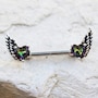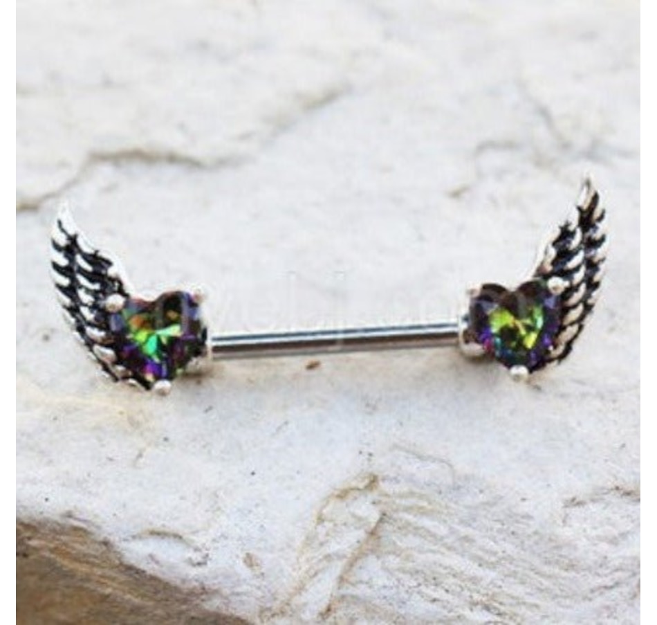 Nipple Bar / Nipple Jewelry with Winged Vitrail Medium CZ Heart‚ ‚Heart shaped Vitrail Medium CZ on each ends‚Gothic wings are designed with much details‚Jewelry is partially plated in black for a color contrast‚Bar Thickness : 14GA | 1.6mm‚Bar Length (Wearable) : 9/16" | 14mm‚Wing Size : 8 x 12mm‚Material : 316L Stainless Steel, Zinc Alloy, Cubic Zirconia