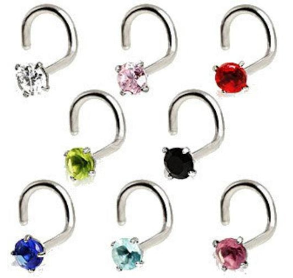 316L Surgical Steel Screw Nose Ring with Prong Set Gem.Mirror finished Implant Grade 316L Surgical Steel screw Nose Ring with 3mm prong set Cubic Zirconia.Thickness : 18GA & 20GAGem Size : 3mmAvailable in 8 colors.