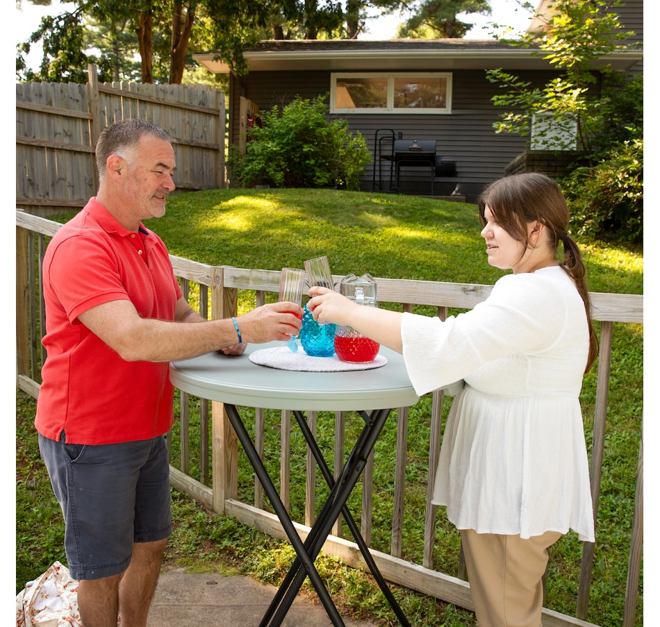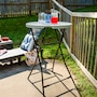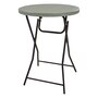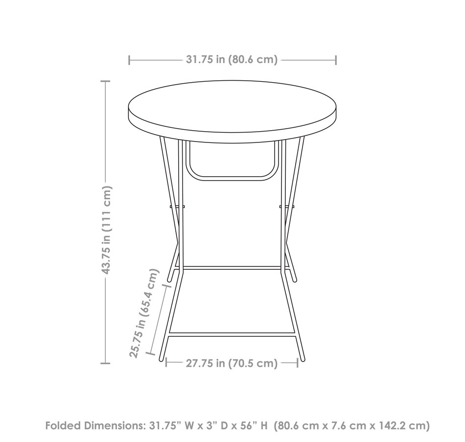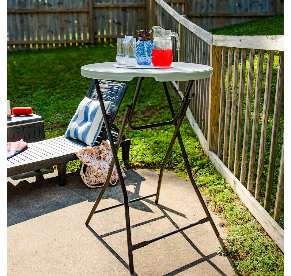 Elevate any casual dining experience or gathering with this round plastic bar-height table, designed to seamlessly transition between indoor and outdoor spaces. Crafted with foldable legs, this portable bar-height folding table offers a practical solution for easy storage and portability. Just fold the table down to store it away when not in use. The powder-coated iron legs not only provide stability but also contribute to the table's overall charm, adding a touch of sophistication to any space. The polypropylene tabletop combines aesthetic appeal with durability, ensuring a sleek and low-maintenance surface that withstands the test of time. To clean the table, use a soft cloth, warm water, and a mild detergent to wipe away dirt and debris. Whether placed in a sunlit corner of the kitchen or on a patio under the open sky, this dining table adapts effortlessly to various settings. This round indoor/outdoor bar-height dining table transcends boundaries for a timeless and practical addition to any living space.