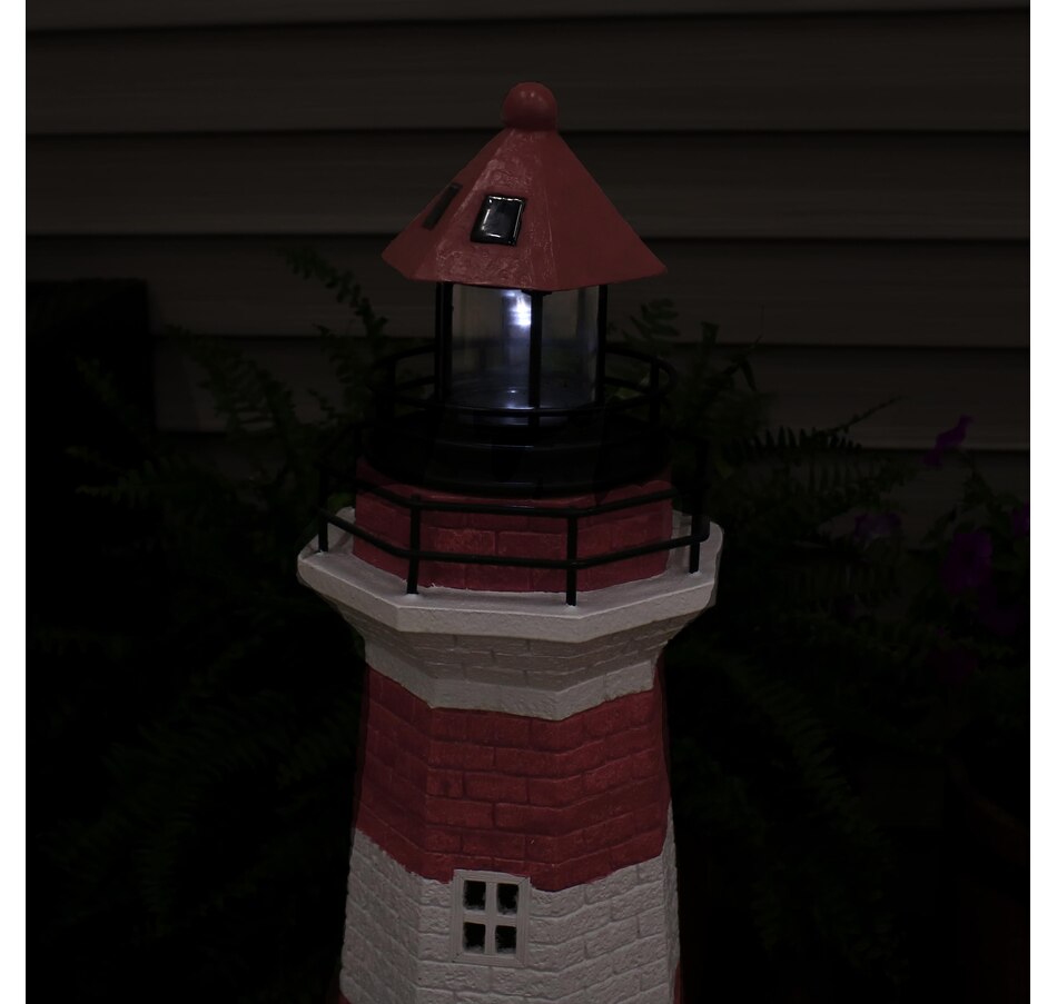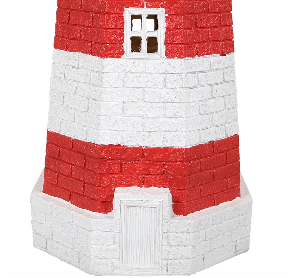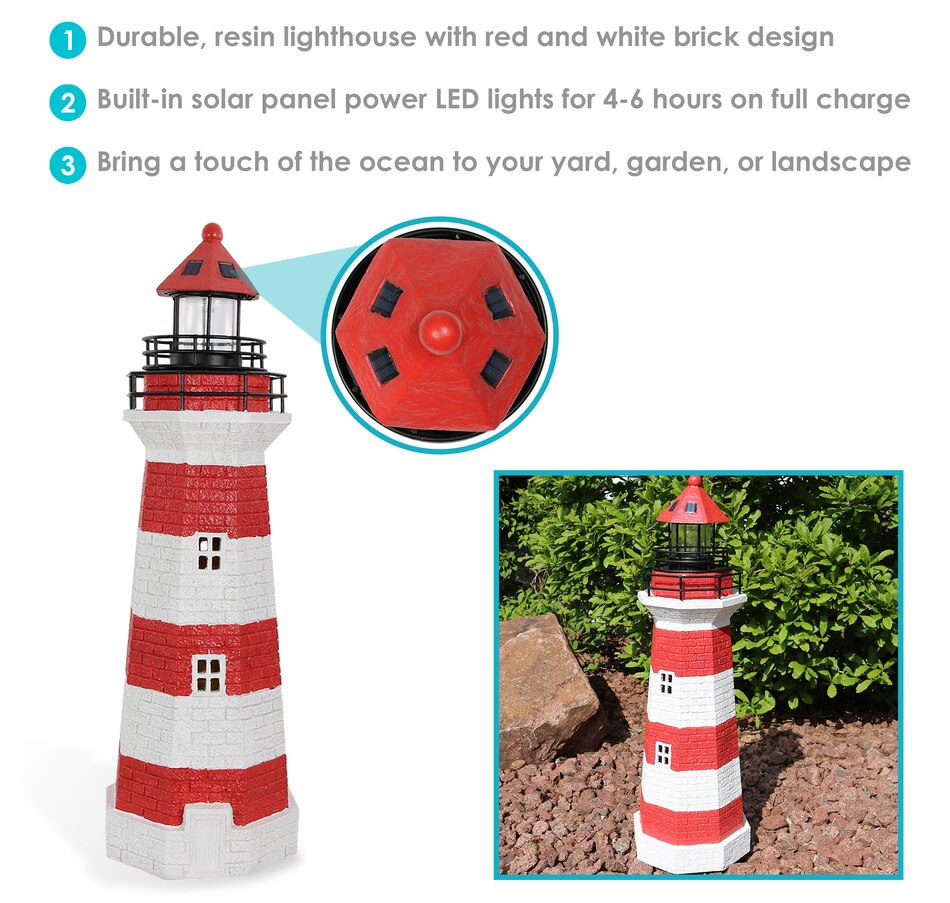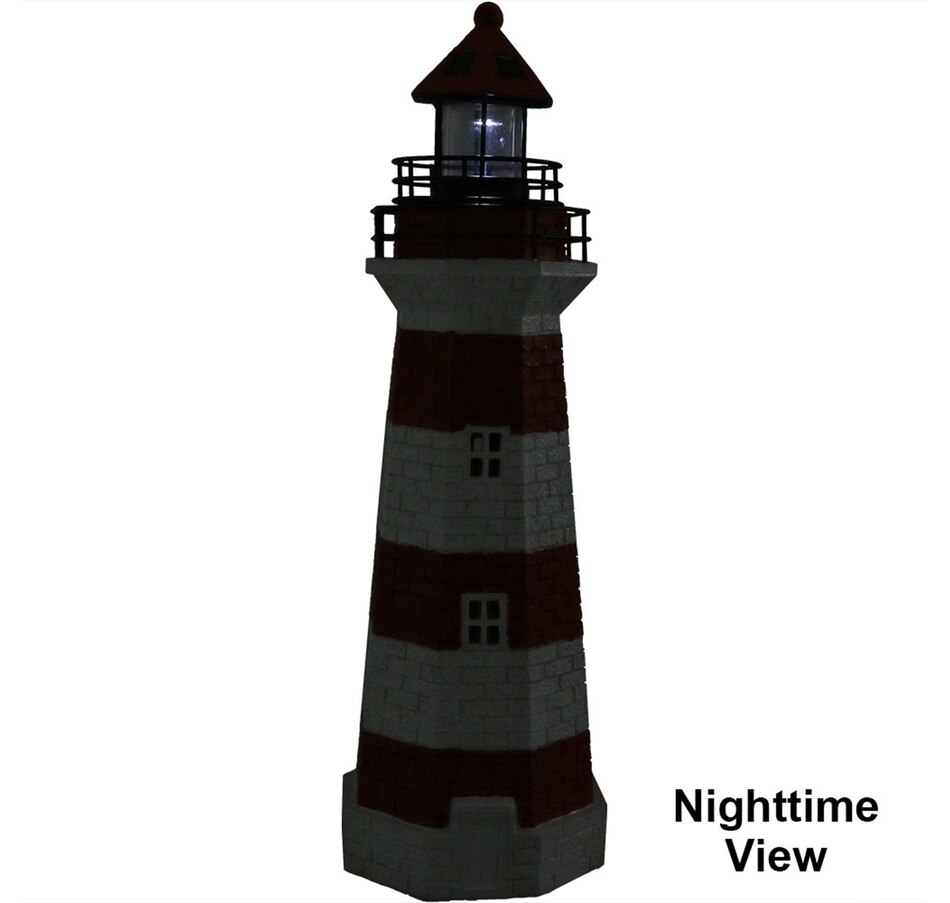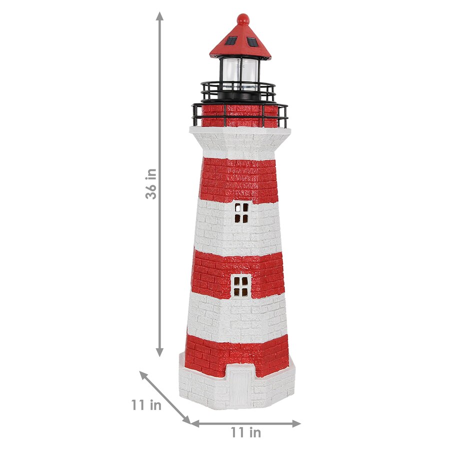 Add coastal character to any outdoor setting with this nautical-themed lighthouse statue. Crafted from a durable resin and metal blend, this lighthouse features detailed brickwork, bold stripes, and realistic door and window accents. A built-in solar panel powers an LED light at the top, charging throughout the day when placed in direct sunlight. Once charged, the light automatically activates at dusk and stays illuminated for 4 to 6 hours. The battery is conveniently housed beneath the solar panel, and a push-button switch allows for easy control. Designed to evoke the charm of classic coastal lighthouses, this piece makes a striking accent on patios, decks, porches, or garden paths. The combination of detailed design and solar-powered functionality adds both ambiance and visual interest to any outdoor landscape.