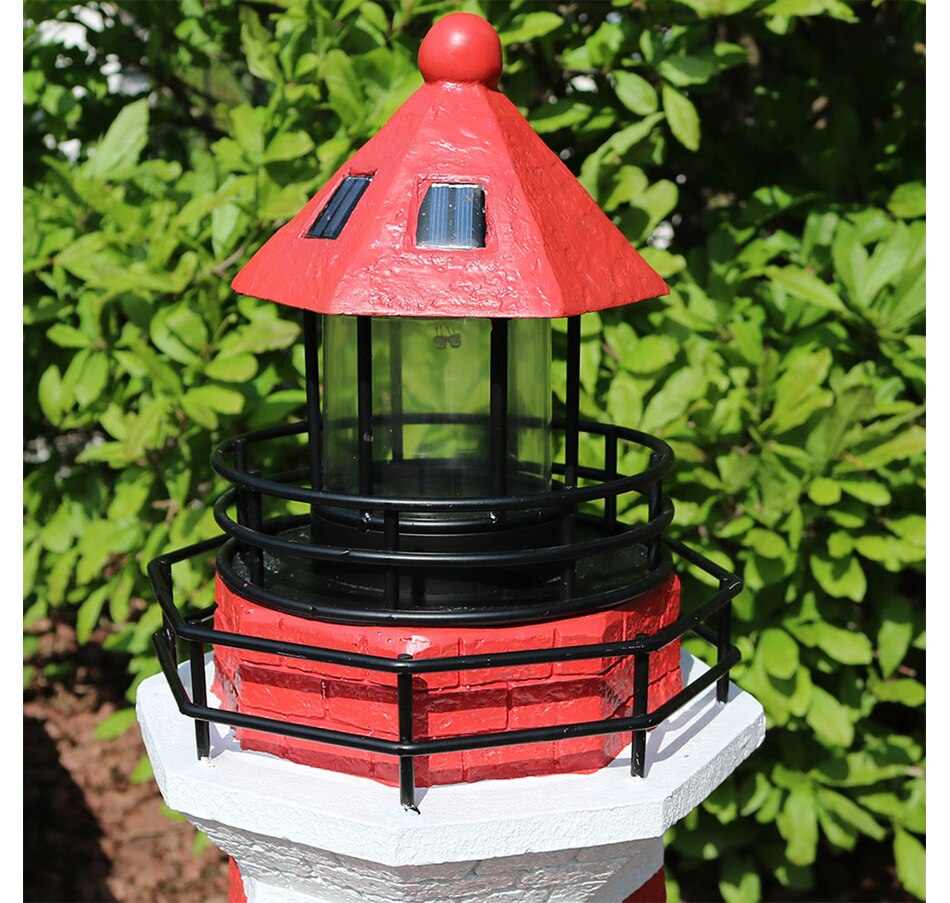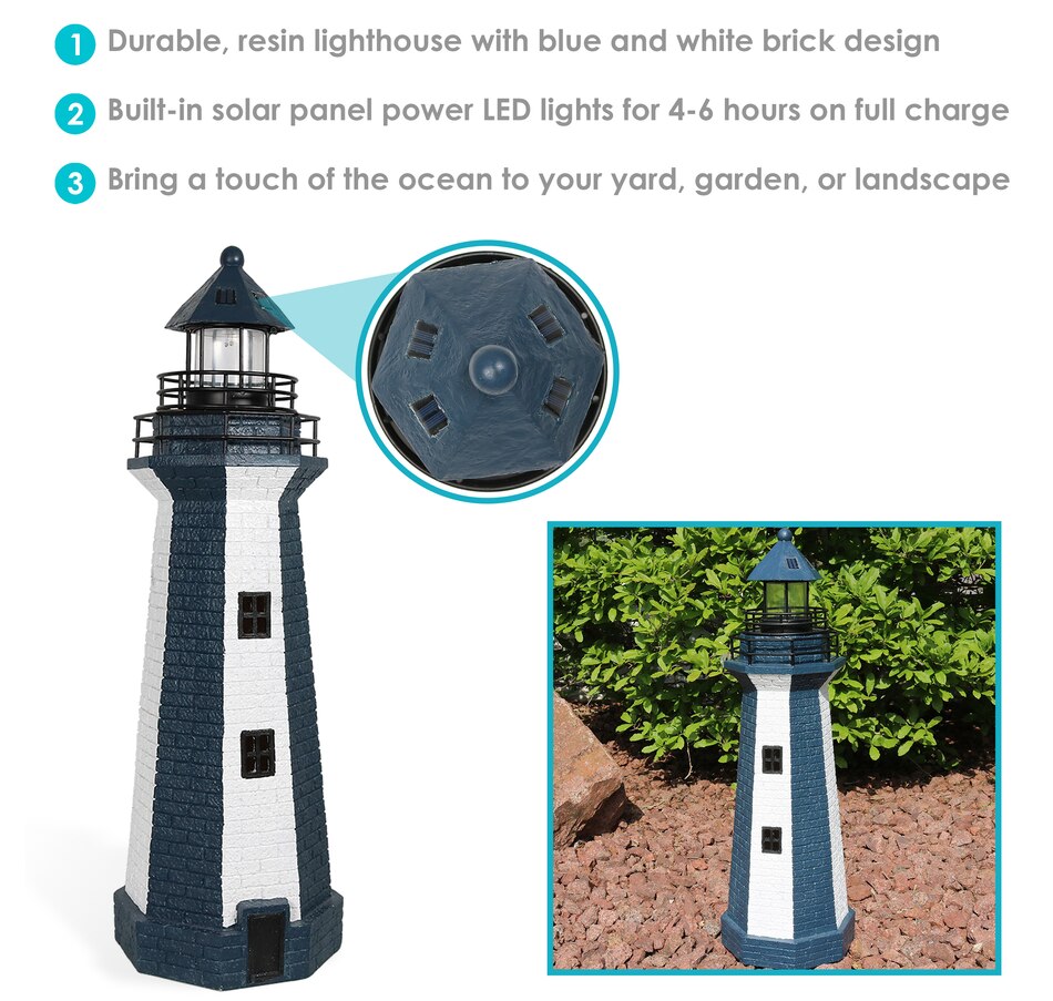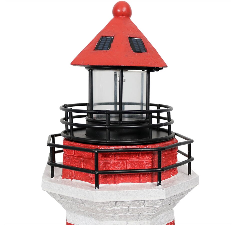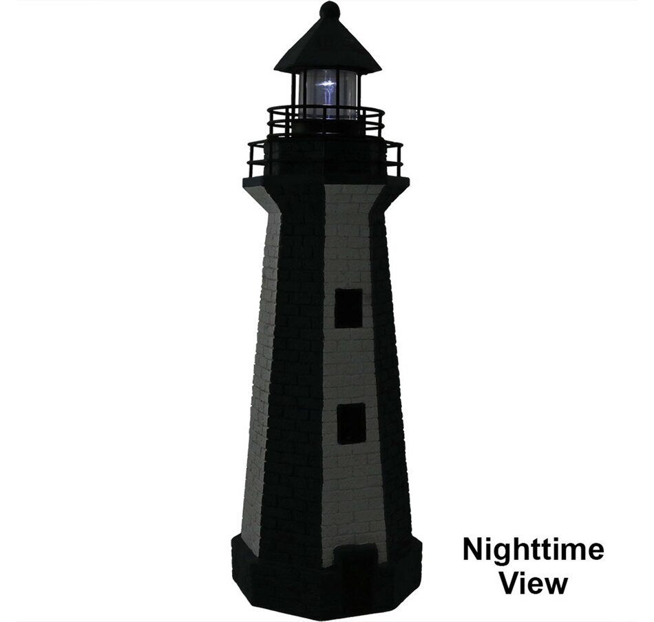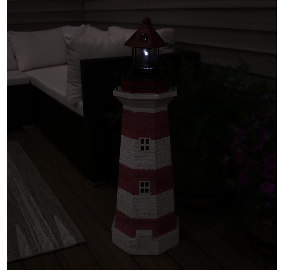 Add coastal character to any outdoor setting with this nautical-themed lighthouse statue. Crafted from a durable resin and metal blend, this lighthouse features detailed brickwork, bold stripes, and realistic door and window accents. A built-in solar panel powers an LED light at the top, charging throughout the day when placed in direct sunlight. Once charged, the light automatically activates at dusk and stays illuminated for 4 to 6 hours. The battery is conveniently housed beneath the solar panel, and a push-button switch allows for easy control. Designed to evoke the charm of classic coastal lighthouses, this piece makes a striking accent on patios, decks, porches, or garden paths. The combination of detailed design and solar-powered functionality adds both ambiance and visual interest to any outdoor landscape.