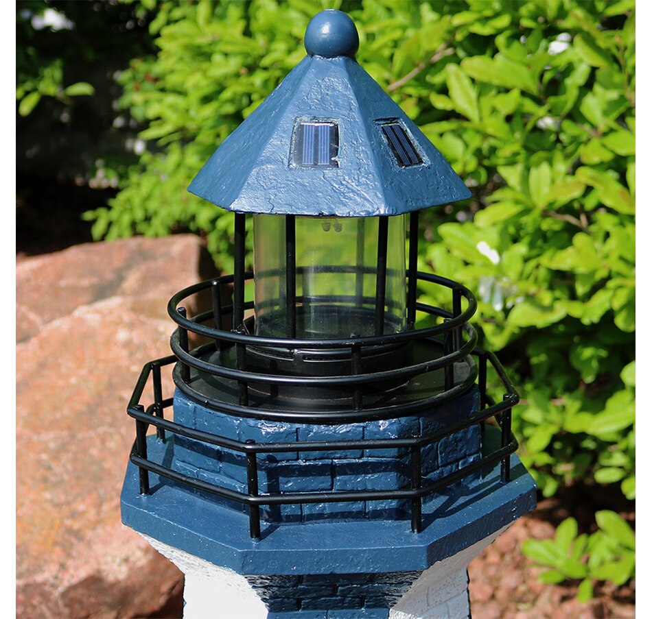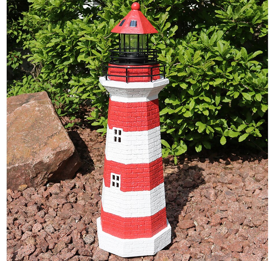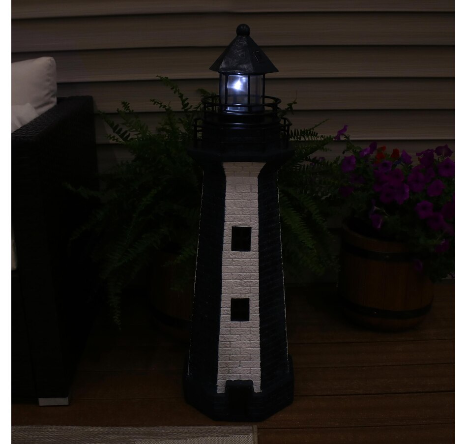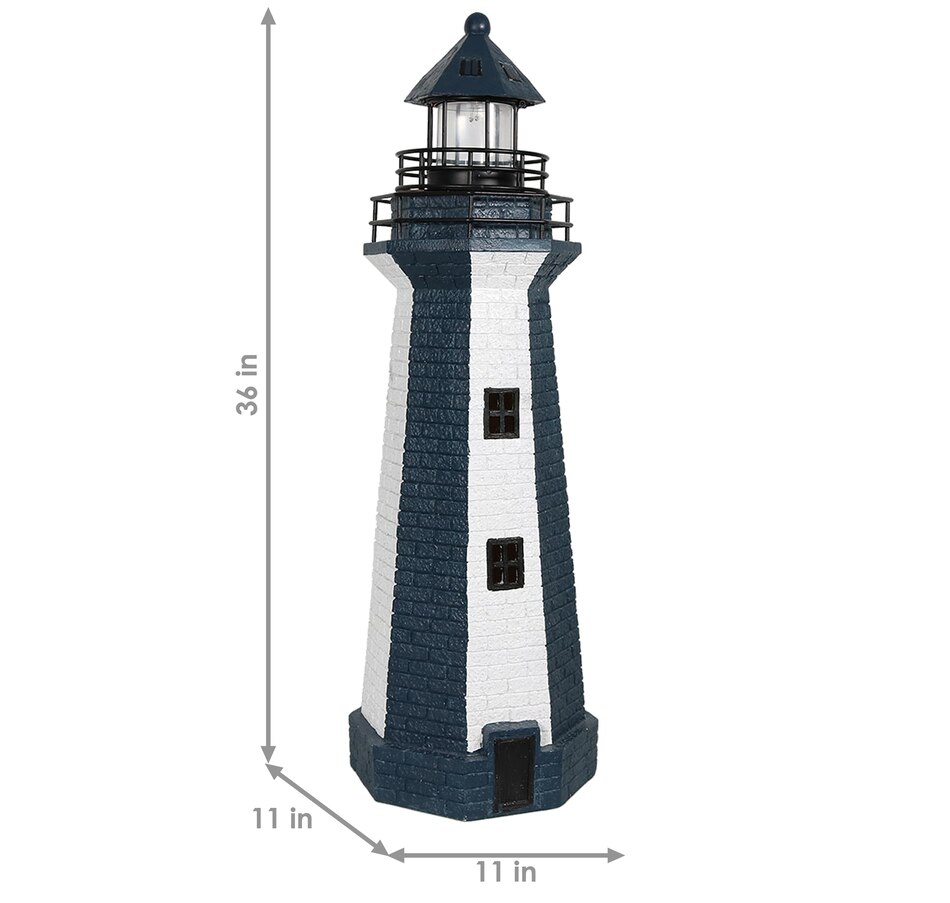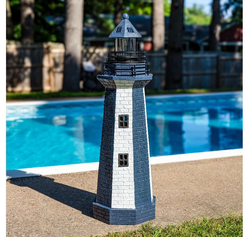 Add coastal character to any outdoor setting with this nautical-themed lighthouse statue. Crafted from a durable resin and metal blend, this lighthouse features detailed brickwork, bold stripes, and realistic door and window accents. A built-in solar panel powers an LED light at the top, charging throughout the day when placed in direct sunlight. Once charged, the light automatically activates at dusk and stays illuminated for 4 to 6 hours. The battery is conveniently housed beneath the solar panel, and a push-button switch allows for easy control. Designed to evoke the charm of classic coastal lighthouses, this piece makes a striking accent on patios, decks, porches, or garden paths. The combination of detailed design and solar-powered functionality adds both ambiance and visual interest to any outdoor landscape.