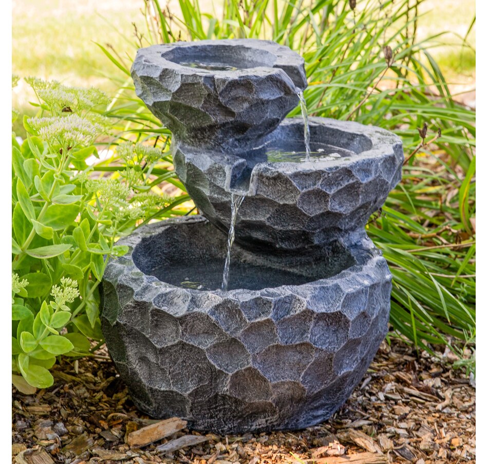 Add a nature-inspired touch to any garden, patio, porch, or backyard with this solar with battery backup water fountain. Simply connect the solar fountain pump to the tube in the fountain, connect the LED light cord and solar pump cord to the solar panel, and place the solar panel in the sun. While using solar-only mode, the pump will run using direct sunlight over the solar panel. To use the battery mode, press the Battery On/Off button and the battery will now power the pump. On the battery mode, the fountain will run for up to four hours on cloudy days or at night. The largest bottom level measures 15.5" diameter x 8.5" tall with a 4" bowl depth, the middle level measures 12.5" diameter x 5.5" tall with a 3" bowl depth, and the top level measures 10.5" diameter x 4.5" tall with a 2.5" bowl depth.