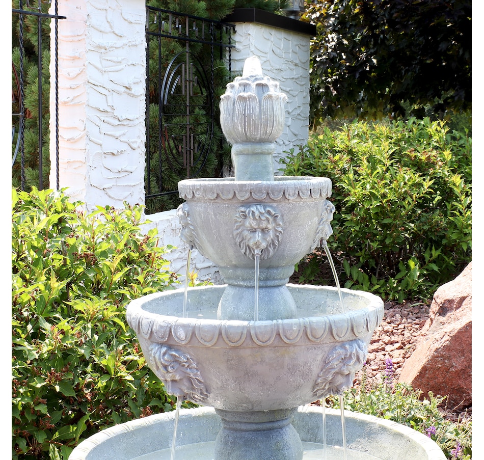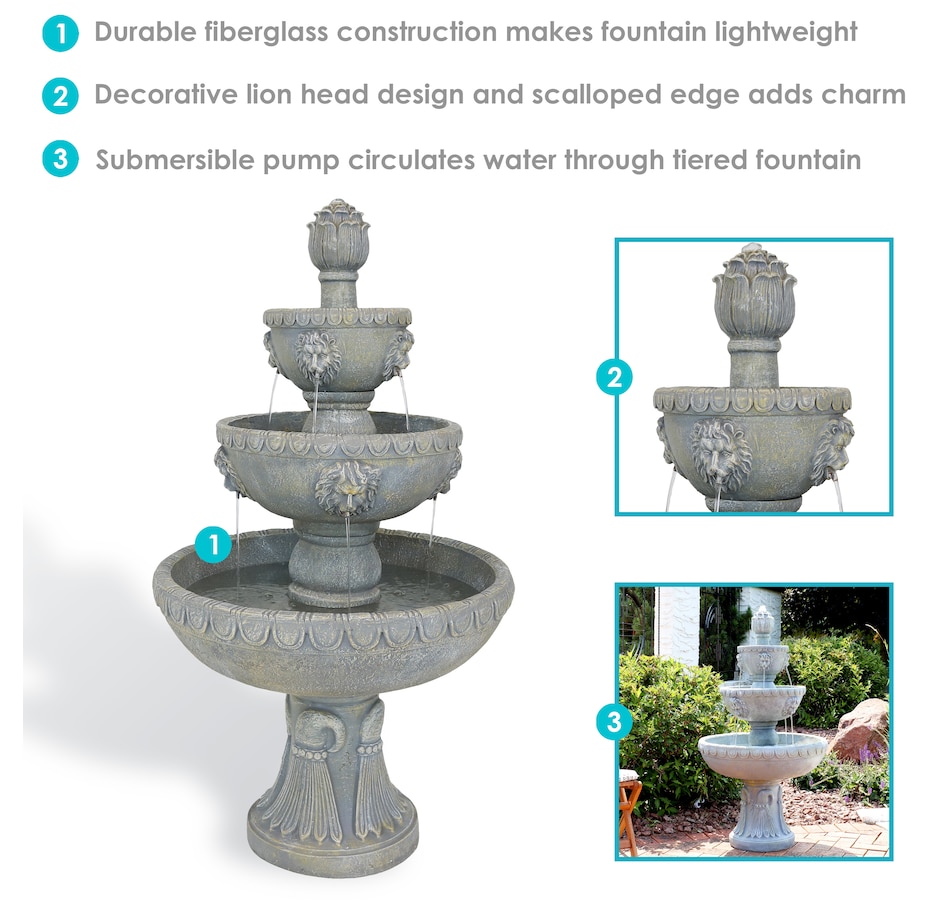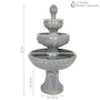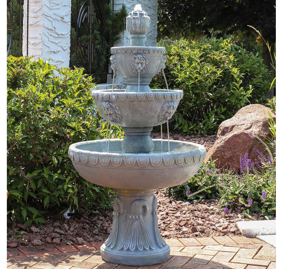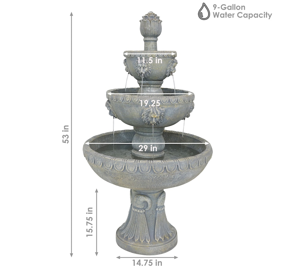Add a regal yet relaxing touch to any outdoor space with this 3-tier fountain. Designed to look like real stone but much more durable, this fountain is sure to last through many seasons. Whether placed in the yard, garden, patio, deck, or front porch, this masterpiece will get noticed and be appreciated by all who view it. The fountain features 3 tiers. The larger lower tier has a diameter of 29" and is 7.5" deep. The middle tier has a 19.25" diameter and is 6.5" deep and the top tier has an 11.5" diameter and is 5.5" deep. Plus, the gentle sounds of the flowing water down the 3 tiers circulate back to the top effortless to create a soothing atmosphere that is sure to make a statement. Just set where you'd like it to go, fill with water, plug in to a standard electrical outlet, and watch the outdoor space transform into a relaxation hot spot.