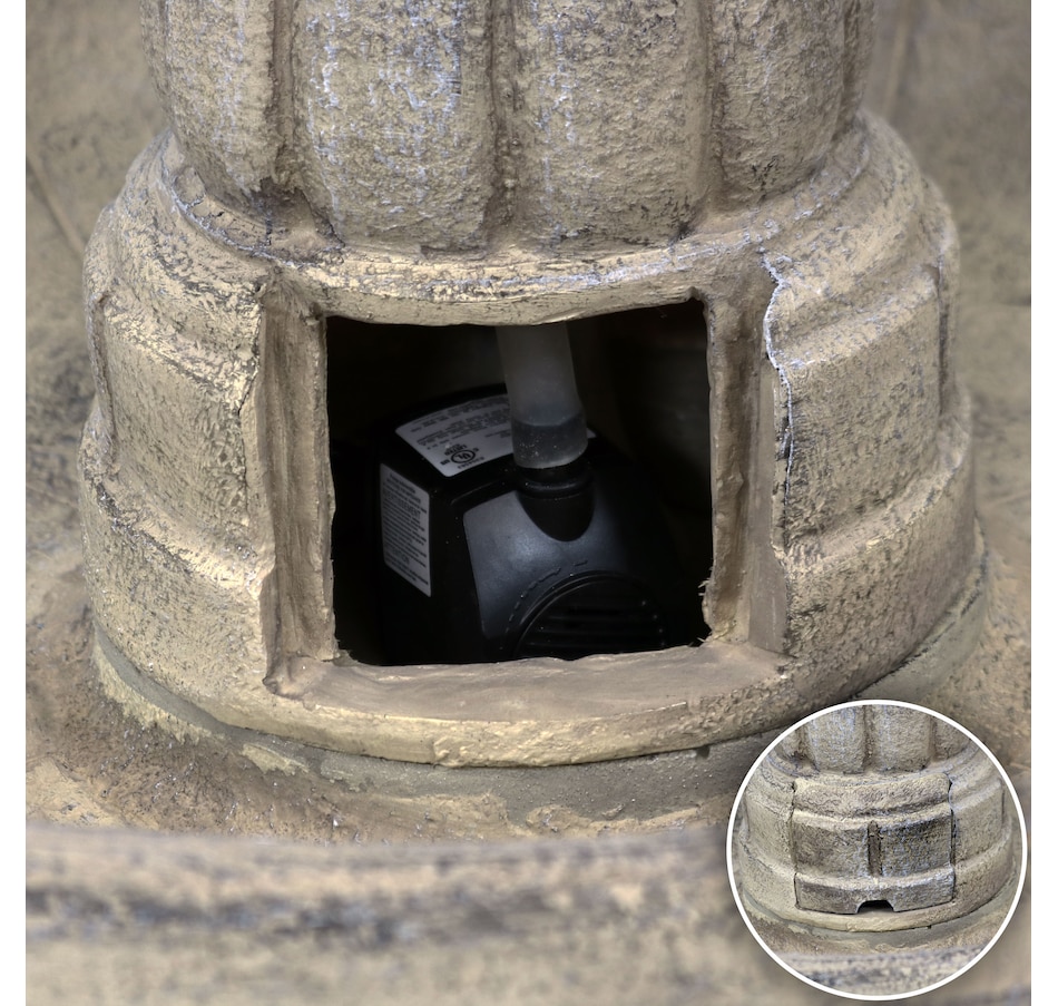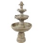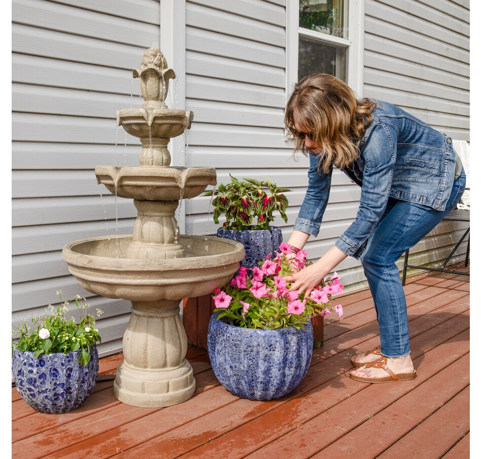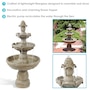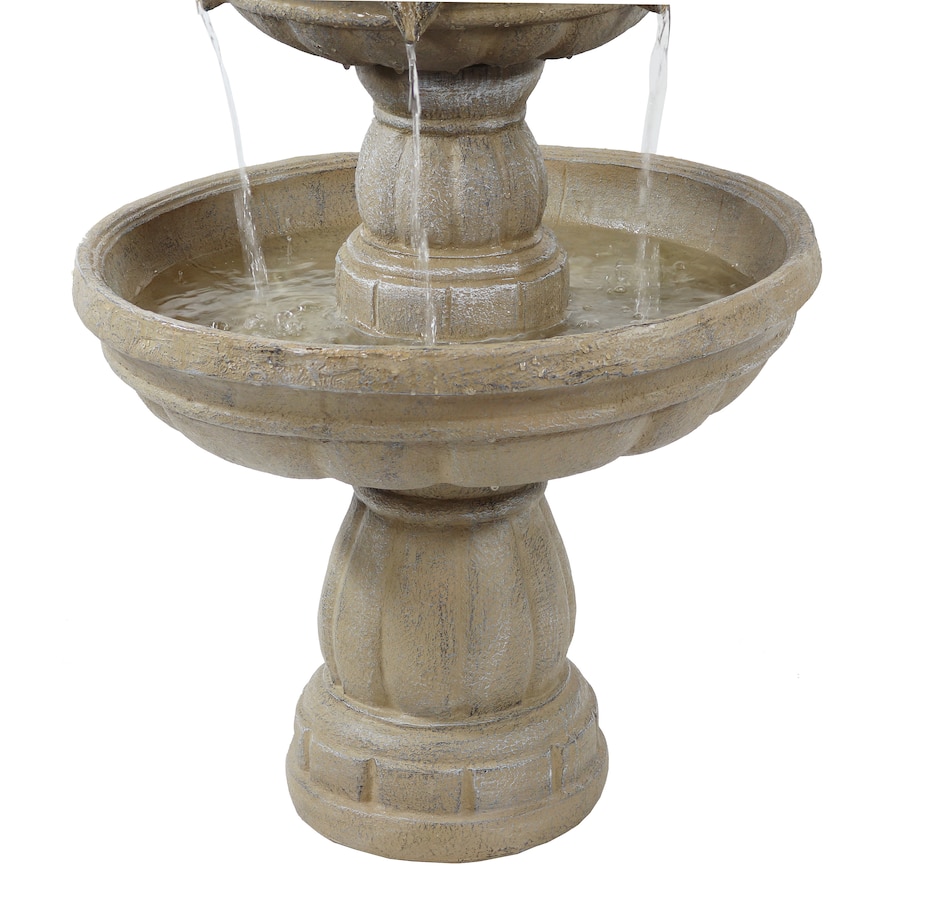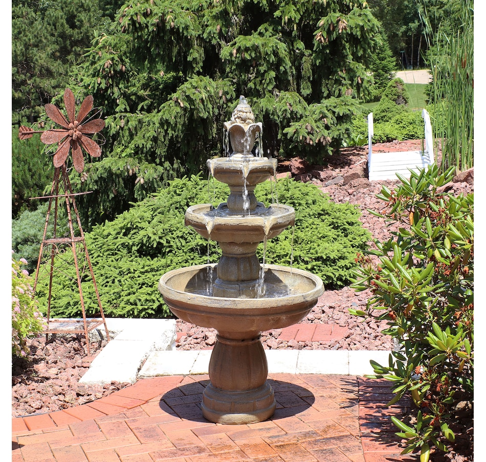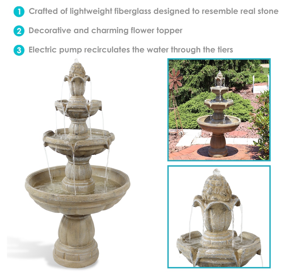 This 3-tier outdoor fountain adds elegance and tranquility to any garden, patio, or courtyard. Standing 48 inches tall with a 26-inch diameter, it serves as a stunning focal point while creating the soothing sound of cascading water. Water flows gracefully from the top finial, spilling over each tier in a continuous, calming motion. Crafted from durable fiberglass, this outdoor freestanding fountain is built to withstand outdoor elements while maintaining a lightweight structure for easy placement. A submersible water pump keeps the water circulating efficiently, ensuring a steady and serene flow. Simply plug the pump into a standard electrical outlet for hassle-free operation. With its classic tiered design and weather-resistant construction, this patio water fountain enhances outdoor spaces with movement, sound, and timeless beauty. Whether placed among lush greenery or as a centerpiece on a patio, it brings a touch of serenity to any setting.