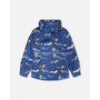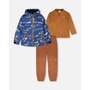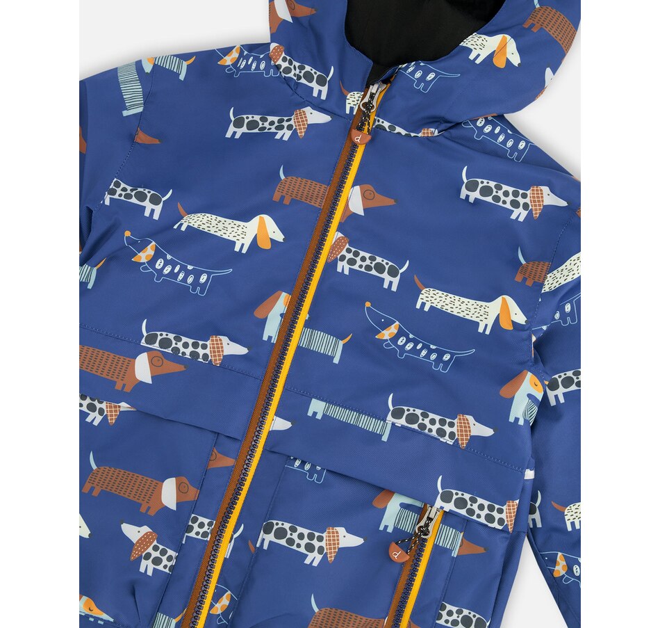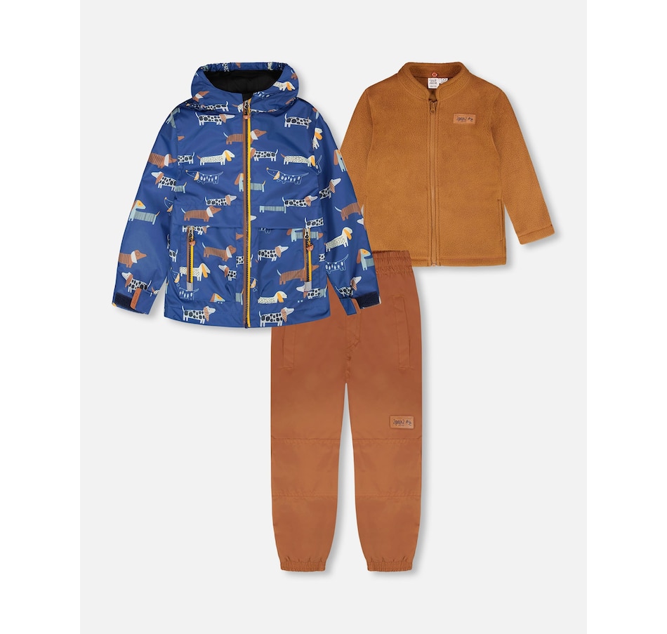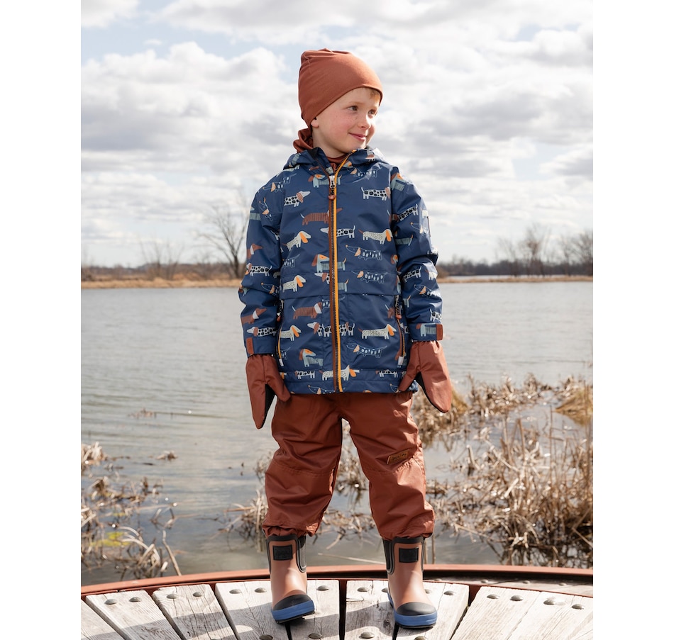 Rugged and reliable, this 3-in-1 mid-season outerwear set in blue with dog print is perfect for boys and baby boys ready for adventure. It includes an outer jacket, removable polar fleece jacket, and matching pants, all crafted with recycled materials and treated with a fluorocarbon-free BIONIC-FINISH® ECO coating for durable water and dirt repellency. Reinforced knees, reflective accents, and a fleece-lined hood make this eco-conscious set both practical and comfortable for outdoor play.