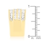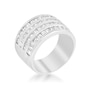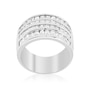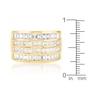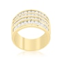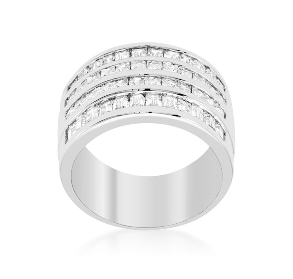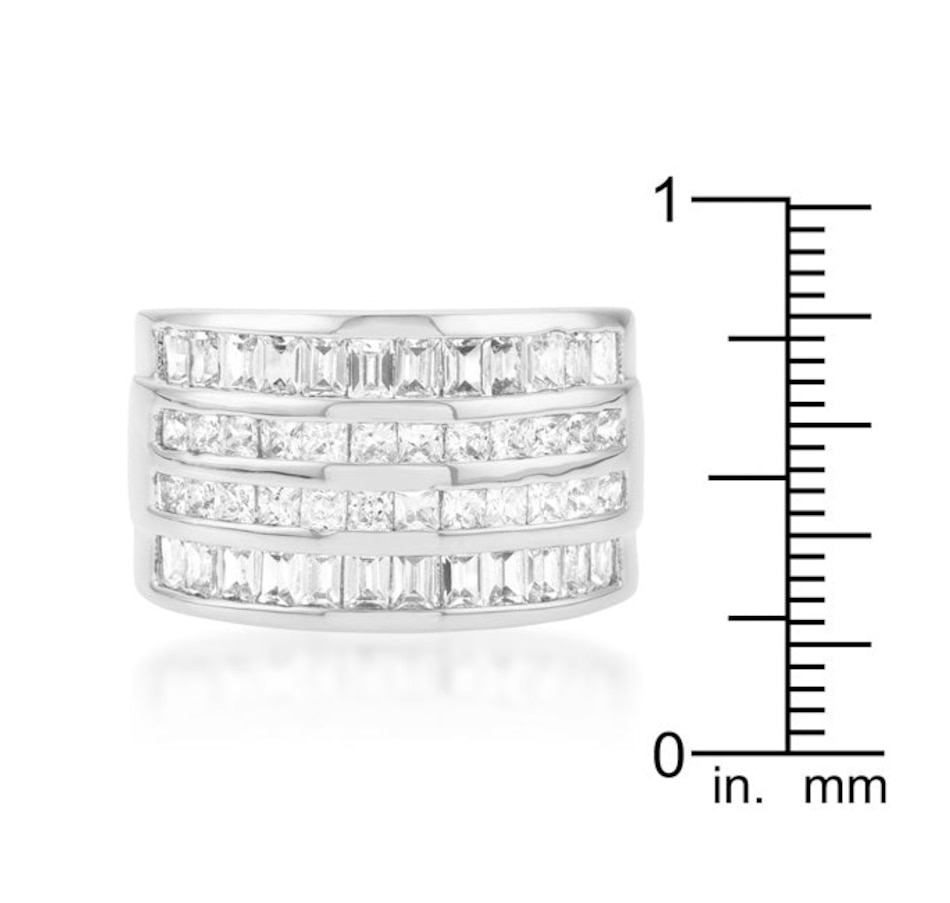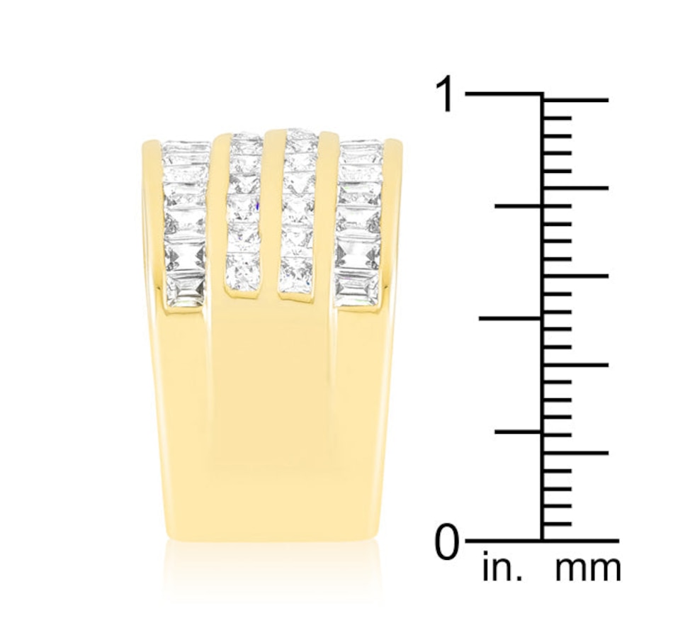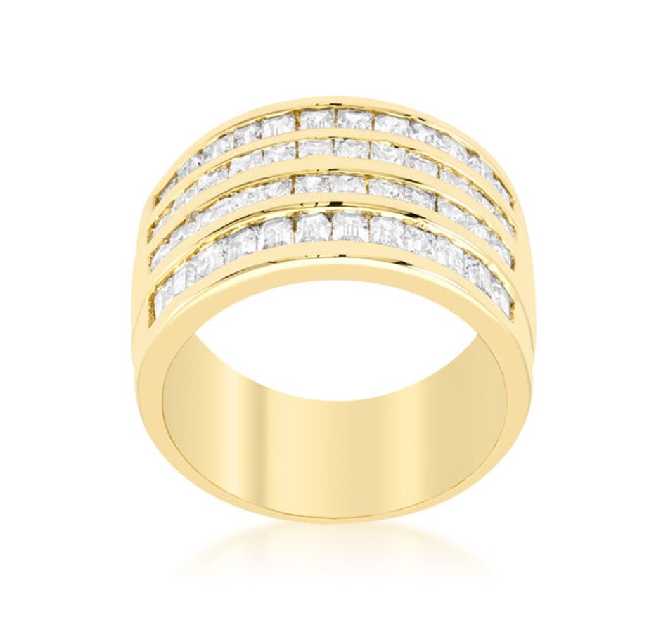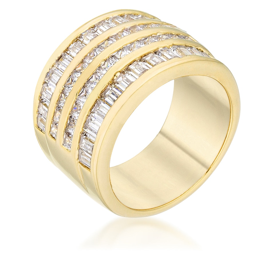 Four rows of baguettes and princess cut cubic zirconia line the front of this gorgeous cocktail ring. 18k plated gold is achieved using an electroplating process that coats the item with heavy layers of 18k Gold and color-treated to display a perfect 14k Hamilton gold color.