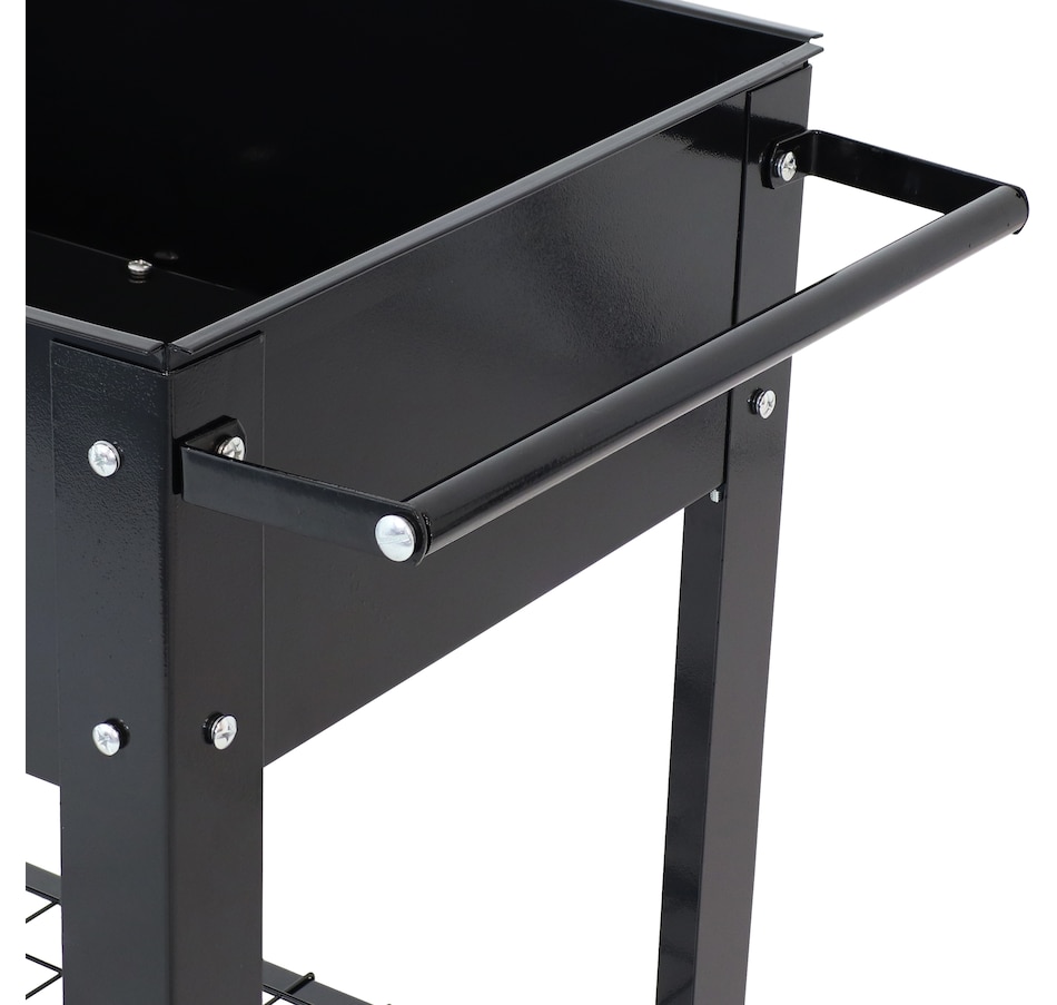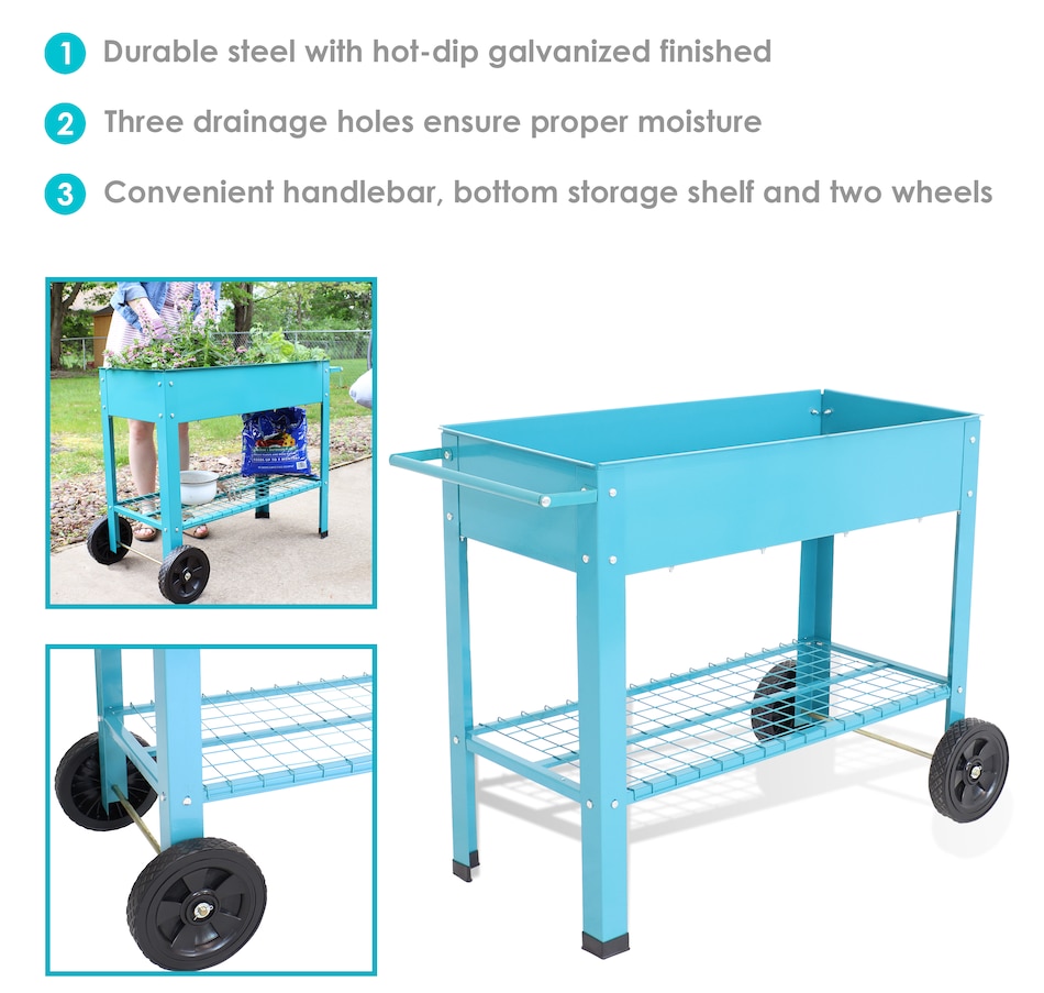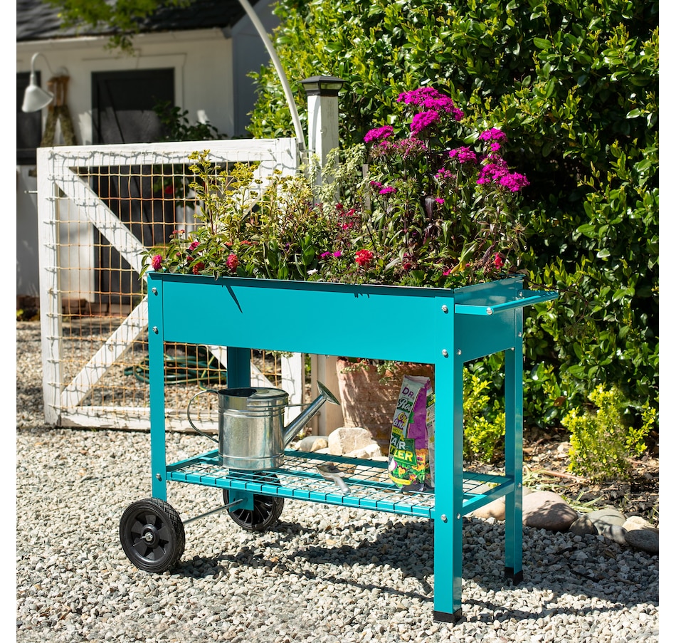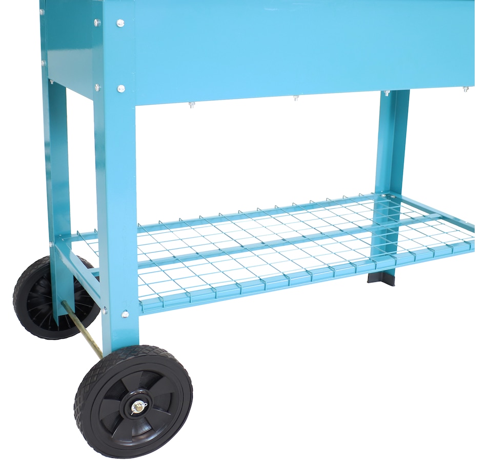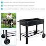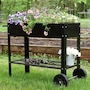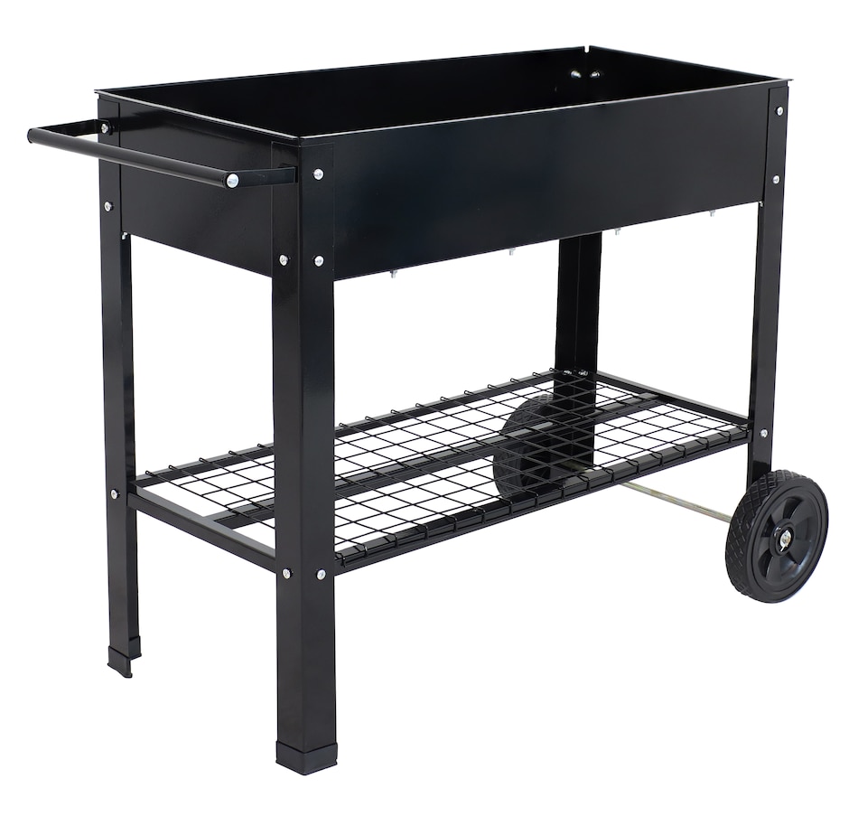 This raised garden bed cart offers mobility, convenience, and durability for planting and storage in one compact design. Constructed from strong 1.5mm thick steel, it withstands regular outdoor use. The built-in handlebar and two wheels allow for easy repositioning, whether shifting to a sunnier spot or creating space on a patio or balcony. The upper planter section holds up to 2.25 cubic feet of soil and includes 1" drainage holes to support proper water flow. Beneath the bed, a lower steel shelf provides a sturdy 65-pound weight capacity—an efficient place to store tools, pots, or gardening supplies. Designed to streamline small-space gardening, this elevated planter cart combines functionality with strength. Its portable structure makes it well suited for spaces that benefit from flexibility, while the dual-level design maximizes vertical storage and growing area. Whether used for flowers, herbs, or vegetables, this garden bed cart keeps plants accessible and essentials close at hand.
