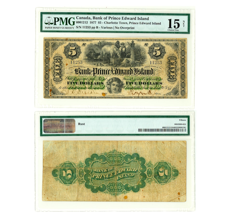 • $5 1877 Bank of Prince Edward Island PMG Certified Choice Fine 15 (Serial Number 11253 pp B - Various No Overprint)