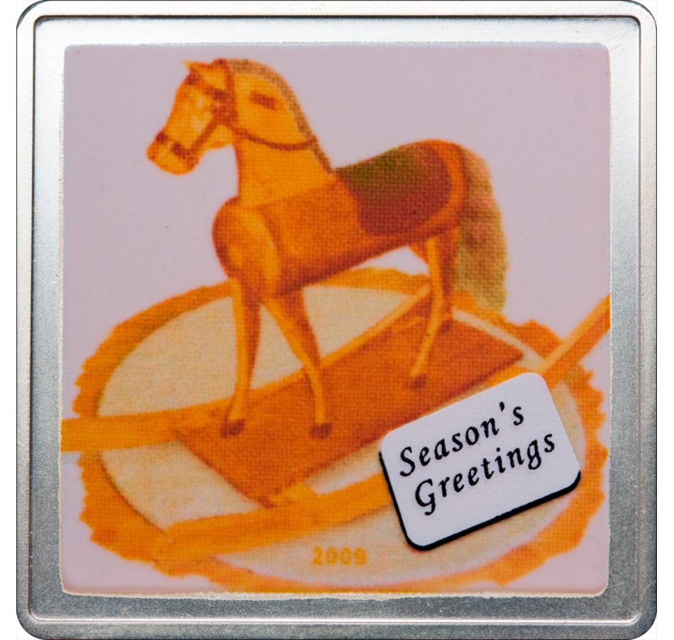 There is nothing more exciting than the anticipation of opening presents, and the pleasure of watching children opening presents on Christmas morning. This innovative and fun sterling silver coin re-creates the magic of revealing what is inside the wrapped present through the use of thermocolour technology. The coin is itself a square, representing a wrapped gift box. As the coin is warmed either by hands or a warm light, the red wrapping disappears to reveal a toy rocking horse hidden inside. As the coin cools back to normal room temperature, the red wrapping returns to allow the process to be repeated. The coin is dated 2009 and has a legal tender value of five dollars in Cook Islands.