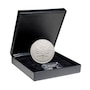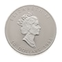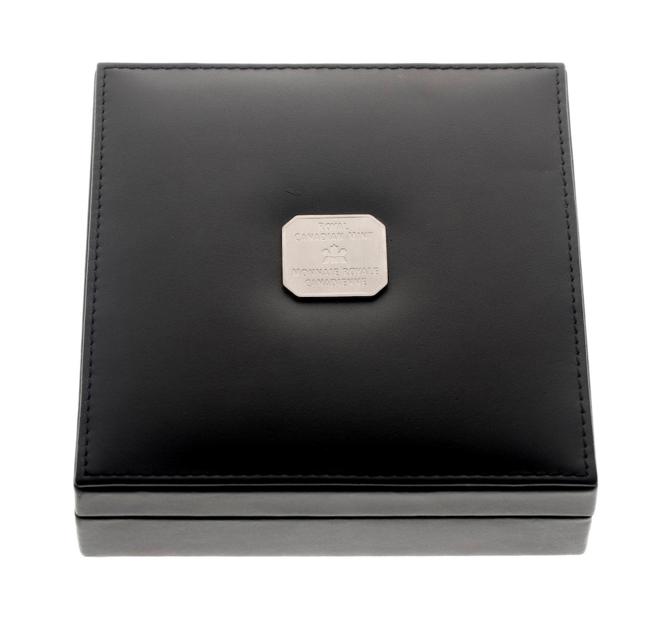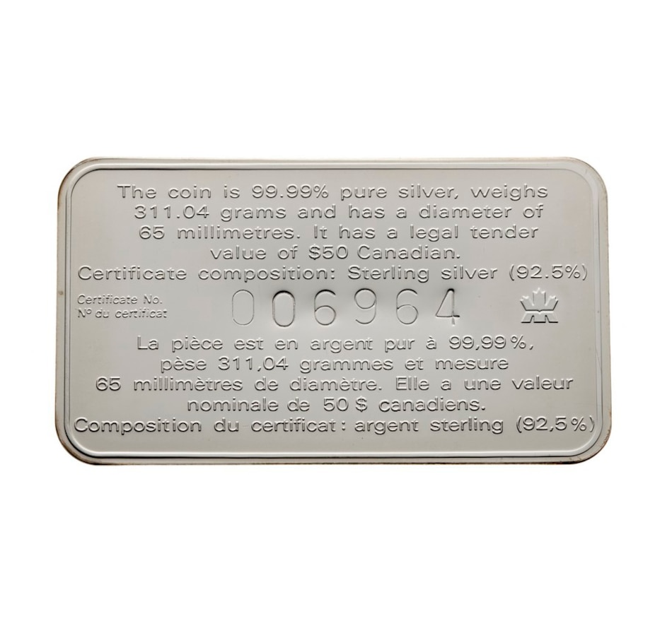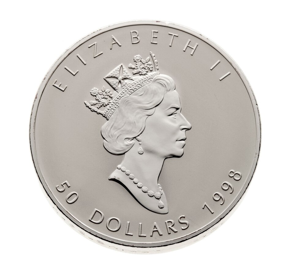 This large 10-ounce reverse proof $50 fine silver maple leaf coin was issued in 1998 to celebrate the 10th anniversary of the silver maple leaf bullion coin. The coin is accompanied by a solid sterling silver certificate of authenticity, and a black leather case with a metallic "Royal Canadian Mint" plaque. This is the Royal Canadian Mint's first-ever 10-ounce silver coin and remains the only 10-ounce $50 denomination coin.