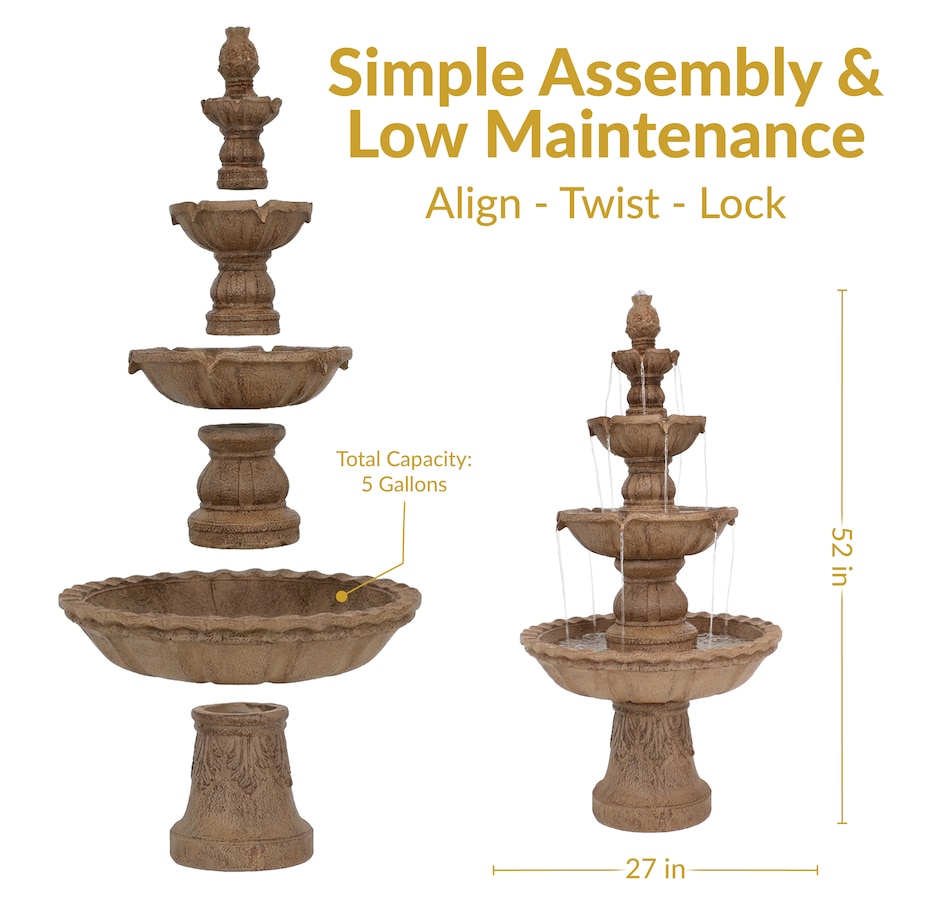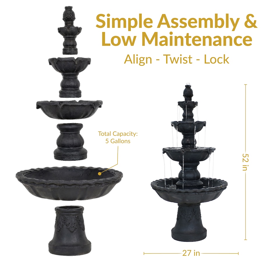 Enhance any outdoor space with this elegant 4-tier patio water fountain, topped with a classic pineapple design that symbolizes warmth and hospitality. Standing at 52 inches tall, it serves as a striking focal point while delivering the soothing sounds of cascading water. Crafted from durable fiberglass resin, this outdoor freestanding fountain is built to withstand outdoor elements while remaining lightweight for easy repositioning. A submersible water pump keeps 5 gallons of water in continuous motion, creating a serene atmosphere. Simply plug it into a standard electrical outlet for effortless operation. The twist-and-lock design allows for quick and secure assembly. With its timeless appeal and weather-resistant construction, this fountain adds elegance and tranquility to gardens, patios, or courtyards. Whether nestled among greenery or placed on a paved terrace, it brings movement and a calming presence to any outdoor setting.