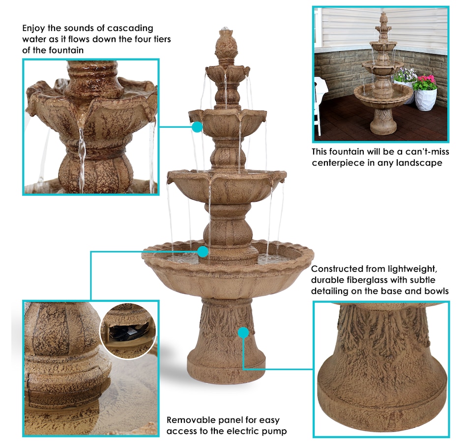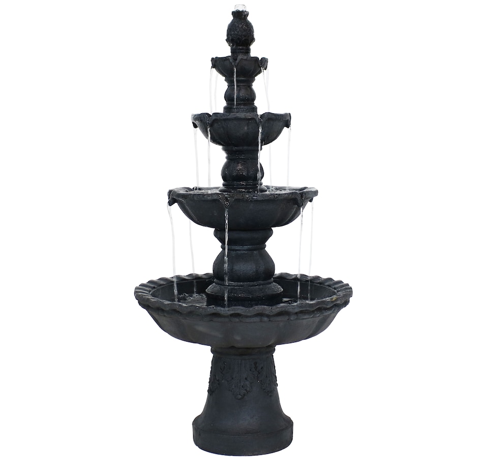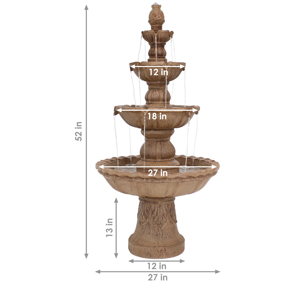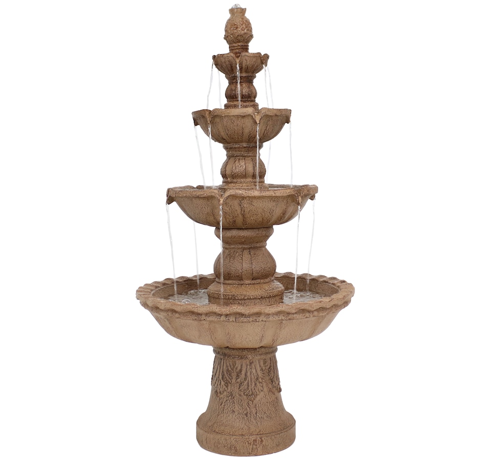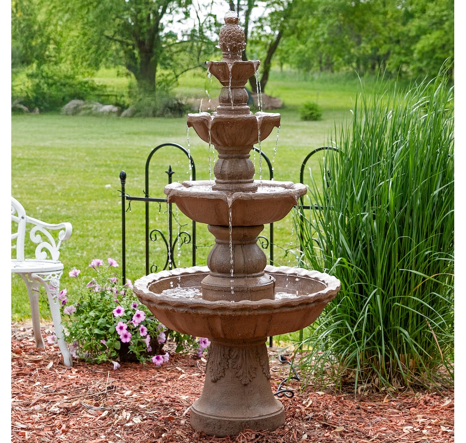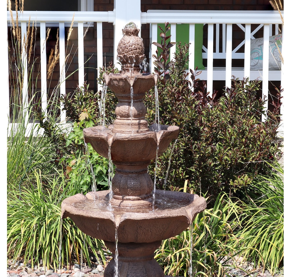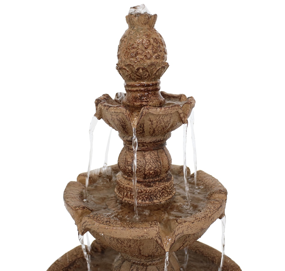 Enhance any outdoor space with this elegant 4-tier patio water fountain, topped with a classic pineapple design that symbolizes warmth and hospitality. Standing at 52 inches tall, it serves as a striking focal point while delivering the soothing sounds of cascading water. Crafted from durable fiberglass resin, this outdoor freestanding fountain is built to withstand outdoor elements while remaining lightweight for easy repositioning. A submersible water pump keeps 5 gallons of water in continuous motion, creating a serene atmosphere. Simply plug it into a standard electrical outlet for effortless operation. The twist-and-lock design allows for quick and secure assembly. With its timeless appeal and weather-resistant construction, this fountain adds elegance and tranquility to gardens, patios, or courtyards. Whether nestled among greenery or placed on a paved terrace, it brings movement and a calming presence to any outdoor setting.