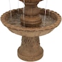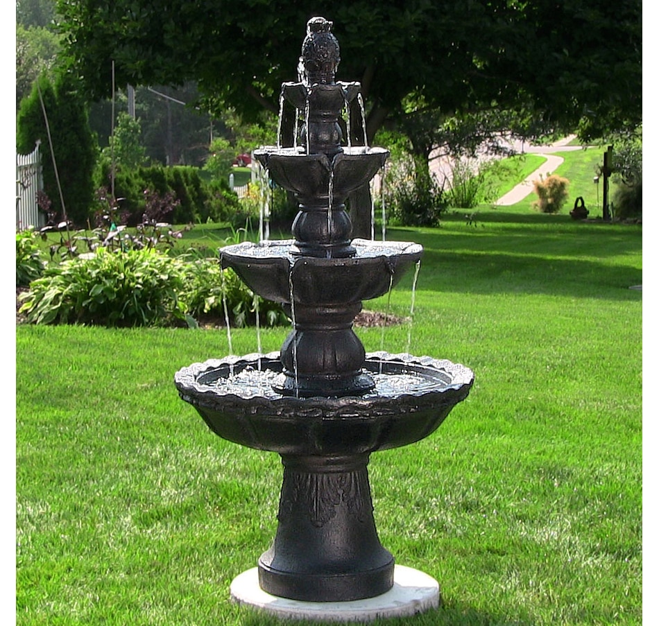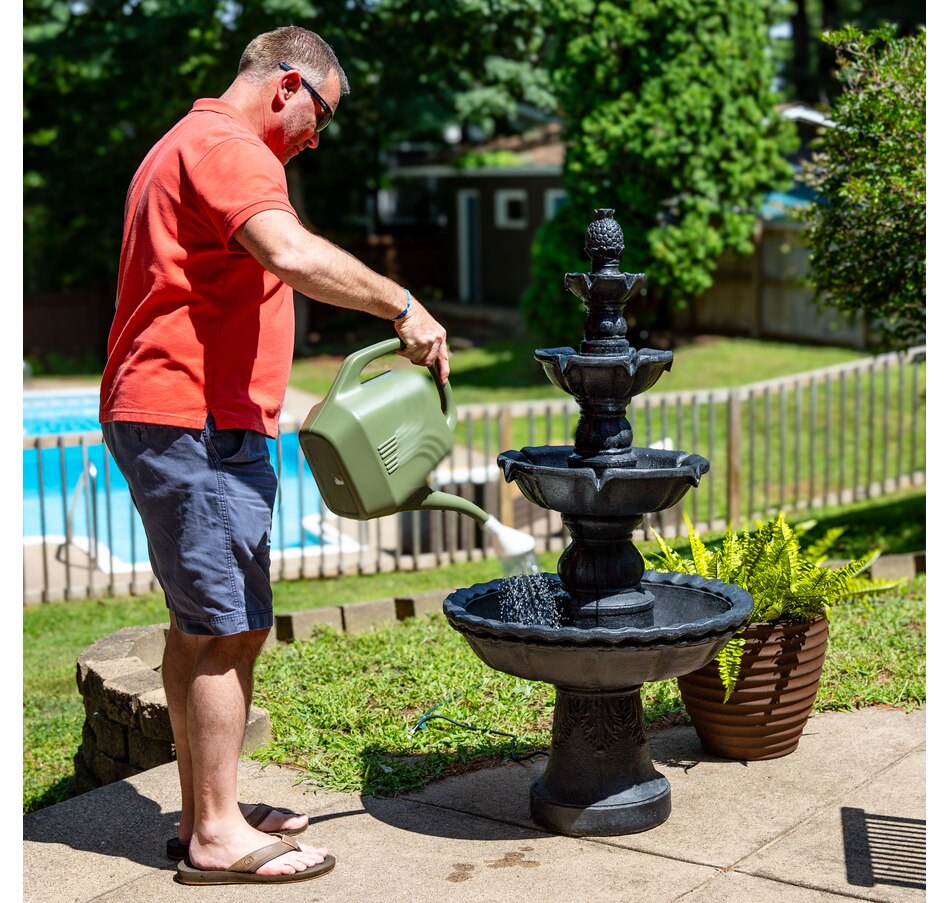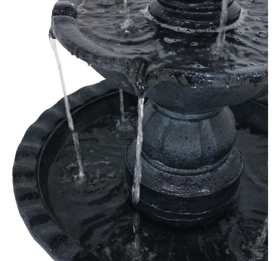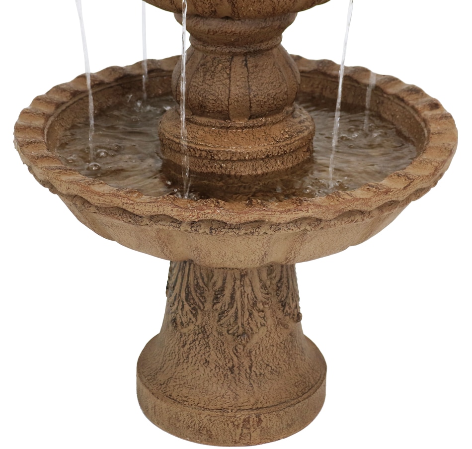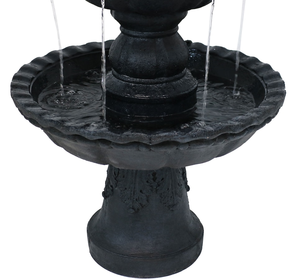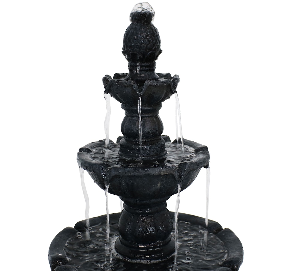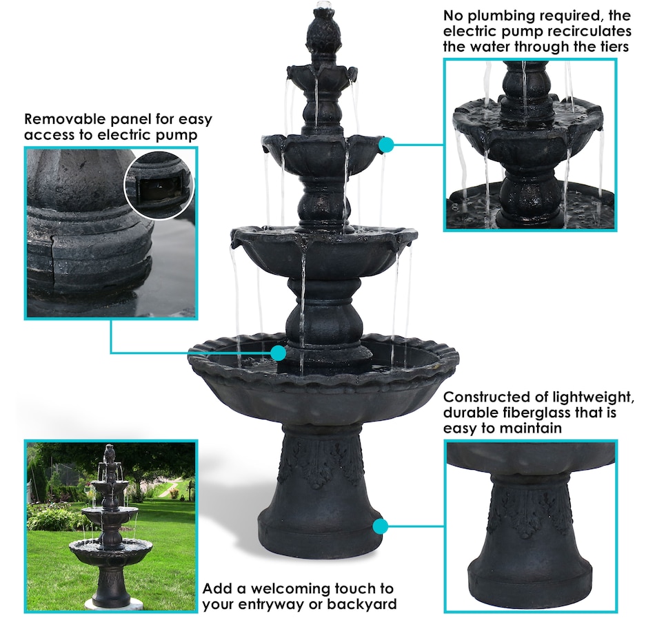 Enhance any outdoor space with this elegant 4-tier patio water fountain, topped with a classic pineapple design that symbolizes warmth and hospitality. Standing at 52 inches tall, it serves as a striking focal point while delivering the soothing sounds of cascading water. Crafted from durable fiberglass resin, this outdoor freestanding fountain is built to withstand outdoor elements while remaining lightweight for easy repositioning. A submersible water pump keeps 5 gallons of water in continuous motion, creating a serene atmosphere. Simply plug it into a standard electrical outlet for effortless operation. The twist-and-lock design allows for quick and secure assembly. With its timeless appeal and weather-resistant construction, this fountain adds elegance and tranquility to gardens, patios, or courtyards. Whether nestled among greenery or placed on a paved terrace, it brings movement and a calming presence to any outdoor setting.