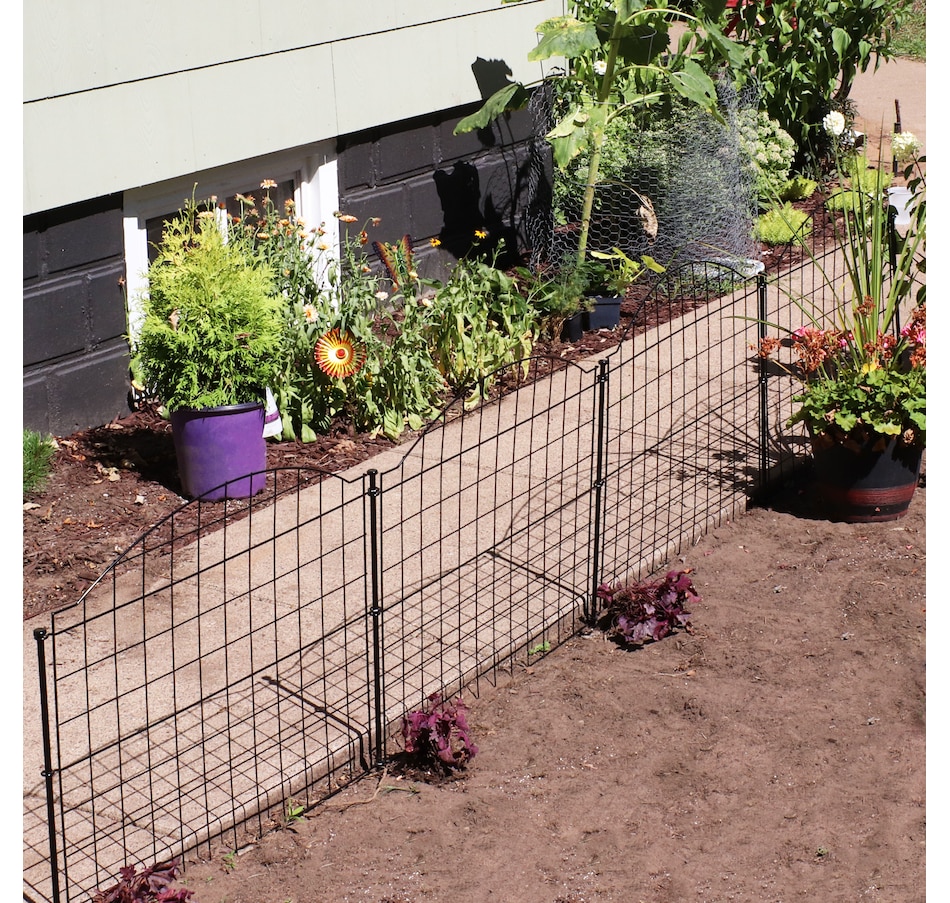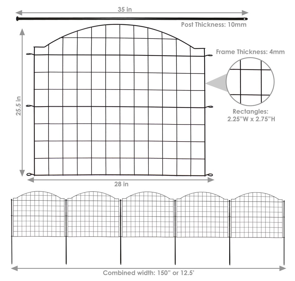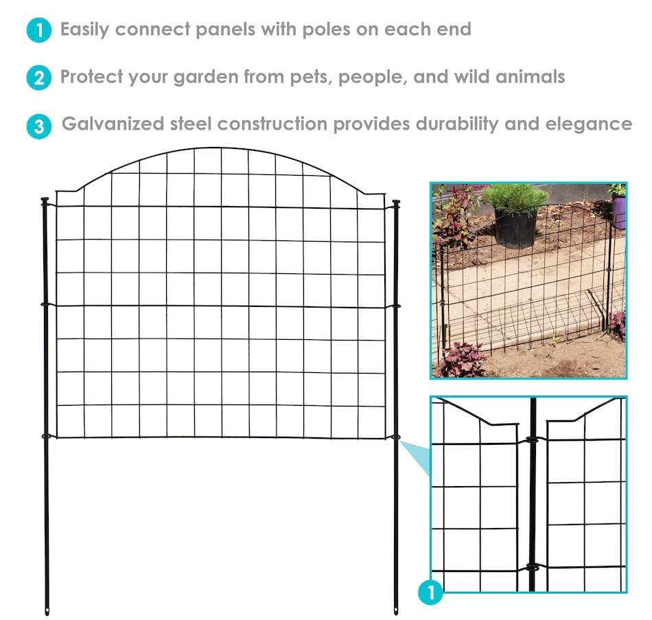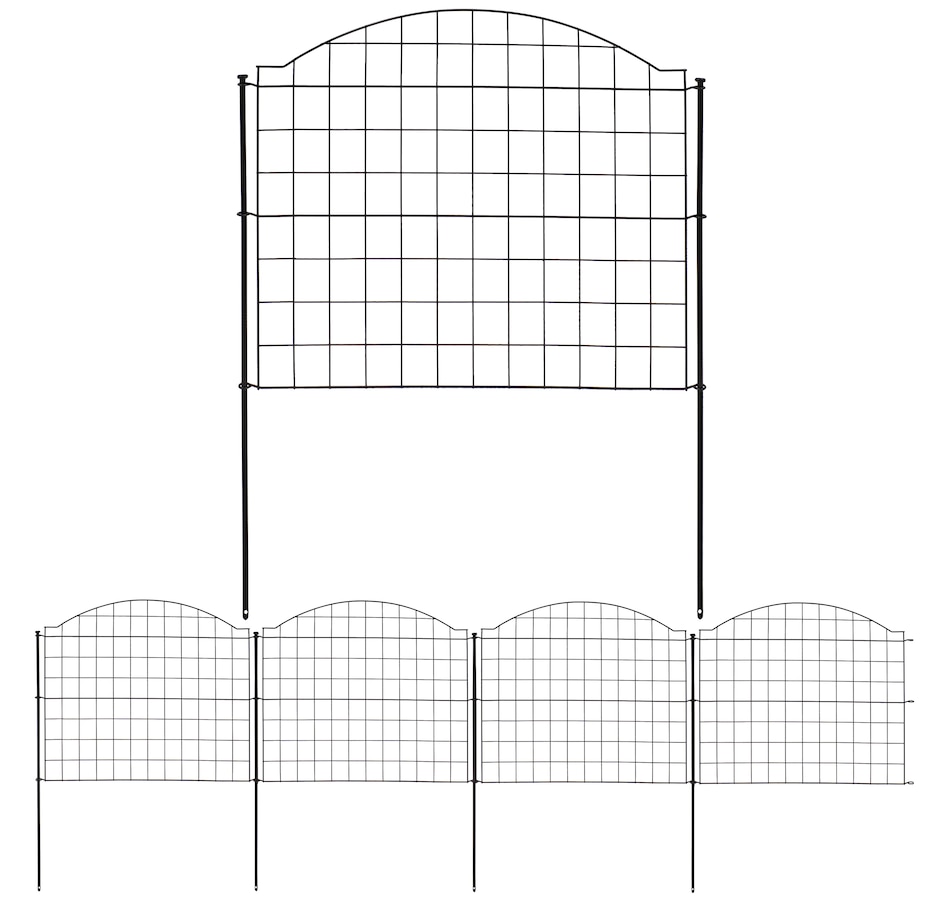 Revitalize the garden with this set of 5 metal garden fence panels. Crafted with high-quality galvanized steel wire, this decorative garden fencing is a great combination of durability and elegance. Measuring 12.5 feet in total length, they provide ample coverage to enclose and define any outdoor space. The charming arched design of each panel adds a touch of sophistication to the garden while still allowing the natural beauty of plants to shine through. These fence panels are incredibly versatile and can be used for a variety of purposes. Create a boundary around flower beds, protect delicate plants from curious critters, or simply add a decorative element to any landscape. Installing these panels is a breeze, thanks to their lightweight and easy-to-handle nature. Simply insert the fence panels in the ground by carefully pushing the legs into firm soil one panel at a time and linking the next panel to the one before it before pressing it down into the soil.