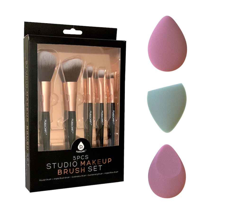 Your Ultimate Makeup Toolkit for Professional-Quality ResultsElevate your makeup routine with the perfect combination of tools: the Pursonic 5-Piece Studio Makeup Brush Set and the 3-Pack Beauty Makeup Sponge Blenders. This bundle has everything you need to achieve a flawless, airbrushed look with ease.What’s Included:Pursonic 5-Piece Studio Makeup Brush Set (Black):Versatile Brushes: Includes brushes for foundation, powder, blush, eyeshadow, and contouring.Premium Synthetic Bristles: Designed for durability and easy cleaning, ensuring smooth application every time.Chic Design: Sleek black handles with gold-finish accents bring style and functionality to your beauty setup.Comfortable Grip: Studded handles provide a secure hold for precise application.3-Pack Beauty Makeup Sponges – Multi-Shape Blenders:Round Egg Sponge: Perfect for blending makeup on larger areas like the cheeks, neck, and full face.Egg with Angled Bottom: Ideal for contouring around the nose, forehead, and other hard-to-reach spots.Egg with Flat Side: Best for concealing blemishes and perfecting under-eye coverage.Skin-Friendly Foam: Non-latex material is soft, durable, and suitable for all skin types.Wet or Dry Use: Use damp for a dewy finish or dry for full coverage.Key Benefits of the Bundle:Complete Makeup Solution: Includes everything you need for a professional-quality makeup application.Flawless Coverage: Brushes and sponges work seamlessly to blend liquid, cream, and powder products for a streak-free, airbrushed finish.Hygienic and Reusable: Brushes with synthetic fibers and washable sponges ensure clean, long-lasting performance.Portable and Stylish: Compact tools with a sleek design, perfect for use at home or on the go.Why This Bundle is a Must-Have:Effortless Precision: Use brushes for detailed applications and sponges for blending and finishing touches.Versatile Tools: Designed for foundation, blush, contouring, concealing, and more.Perfect for Any Skill Level: Whether you’re a makeup pro or a beginner, this bundle makes it easy to achieve a flawless look.How to Use:Brush Set:Choose the appropriate brush for your product and area of application (e.g., foundation brush for base makeup, blush brush for cheeks).Apply product evenly for smooth, professional results.Beauty Sponges:Use damp for liquid foundations or dry for powders.Blend in dabbing motions to achieve a flawless, streak-free finish.Transform Your Makeup Game with These EssentialsAchieve a polished, radiant look every day with the Pursonic 5-Piece Studio Makeup Brush Set and 3-Pack Beauty Makeup Sponge Blenders. Whether it’s a casual day or a special occasion, this bundle ensures your makeup routine is effortless and effective.