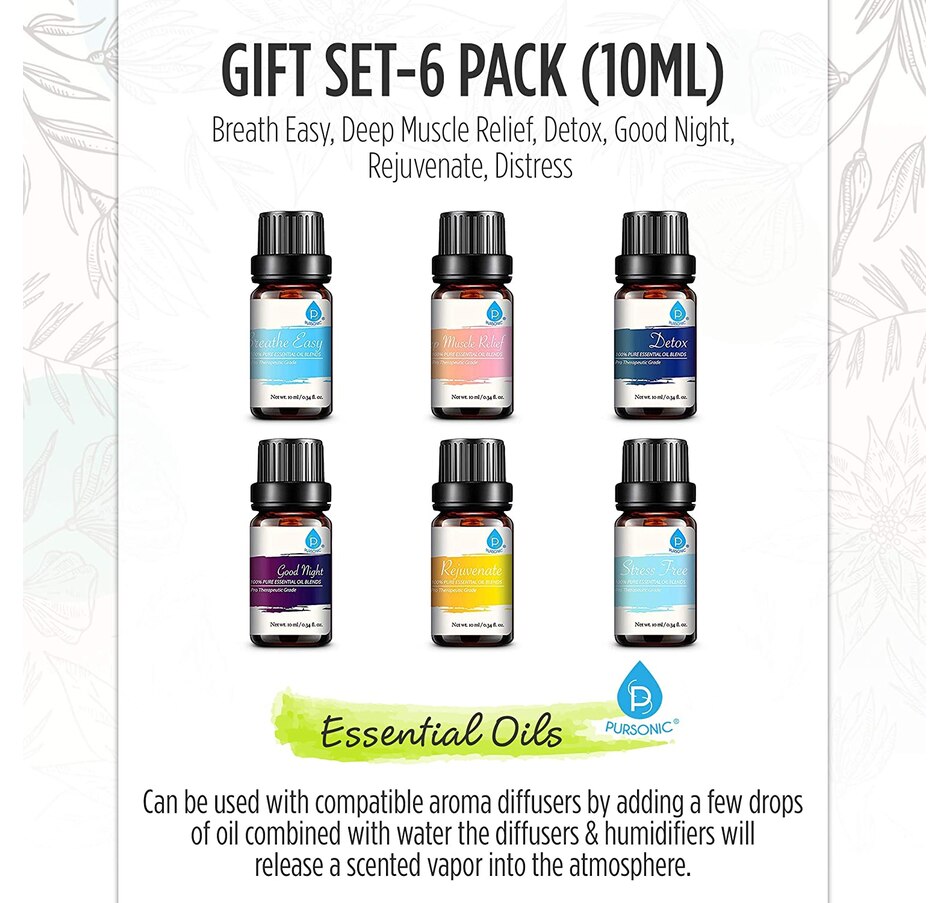 Experience the healing power of aromatherapy with this 6-pack of therapeutic essential oil blends! Each blend contains 100% pure essential oils, with no fillers, additives, or carriers added for a truly all-natural and effective experience. From Breath Easy to Good Night, this collection has something for every need. Enjoy the benefits of aromatherapy as a custom massage oil, vaporizer, diffuser, oil burner and more. Rejuvenate, relax, and detox your body with these pure and effective essential oil blendsFeatures:The Pursonic 6-Pack collection includes 10ml: Breath Easy, Deep Muscle Relief, Detox, Good Night, Rejuvenate, Distress100% Pure Therapeutic Essential Oil Blends - no fillers, additives, bases or carriers addedUses: Aromatherapy, Custom Massage and Body Oils, Vaporizer, Diffusion, Oil Burner, Inhalation, Compress, Perfume, Blends, Spa and Home Care, Cleaning ProductsIngredients: Blends Are Made Of 100% Pure Essential OilsModel Number:Â AOB6
