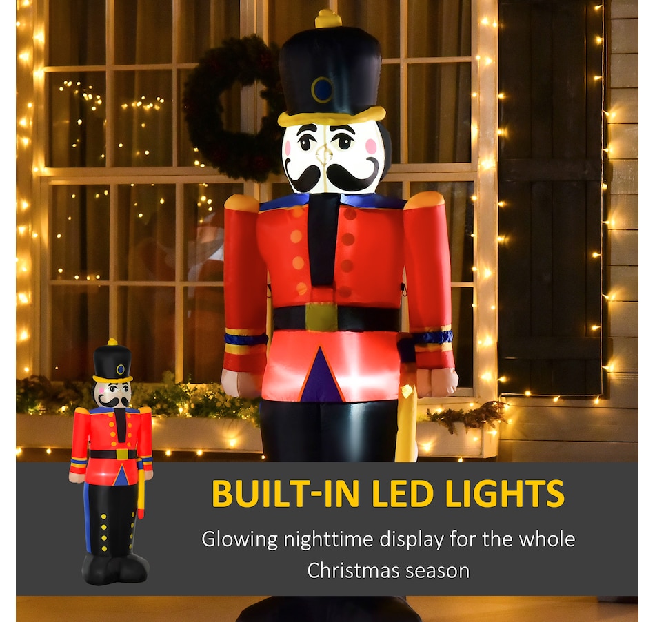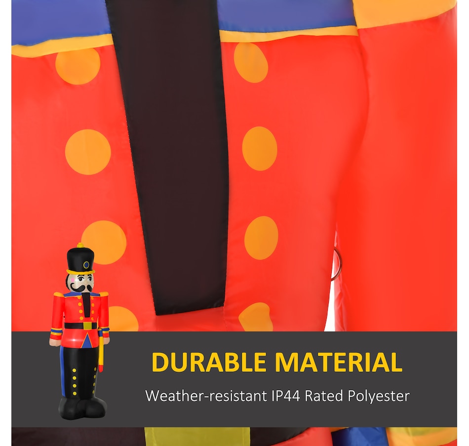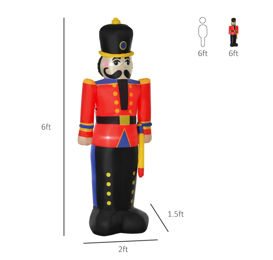 Create the ultimate festive Christmas display in your yard this holiday season with our large 6ft tall Nutcracker Toy Soldier inflatable from HomCom. Designed with ultra-durable, weather-resistant, waterproof polyester and featuring an internal white LED glow, this holiday tree will create a festive focal point in your yard, invoking the holiday spirit for years to come. Self-inflating in minutes, this display plugs into any standard outlet creating a super simple set-up process. Build the perfect holiday yard display this year to outdo the neighbors and bring holiday cheer in classic Christmas fashion.Features: