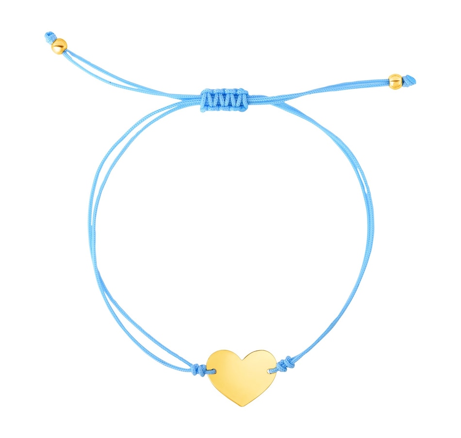 A sweet heart charm in spectacular 14k yellow gold is suspended beautifully from versatile, attractive blue cord. Bracelet is 9 1/4 inches long and is adjustable.