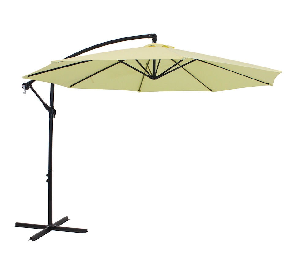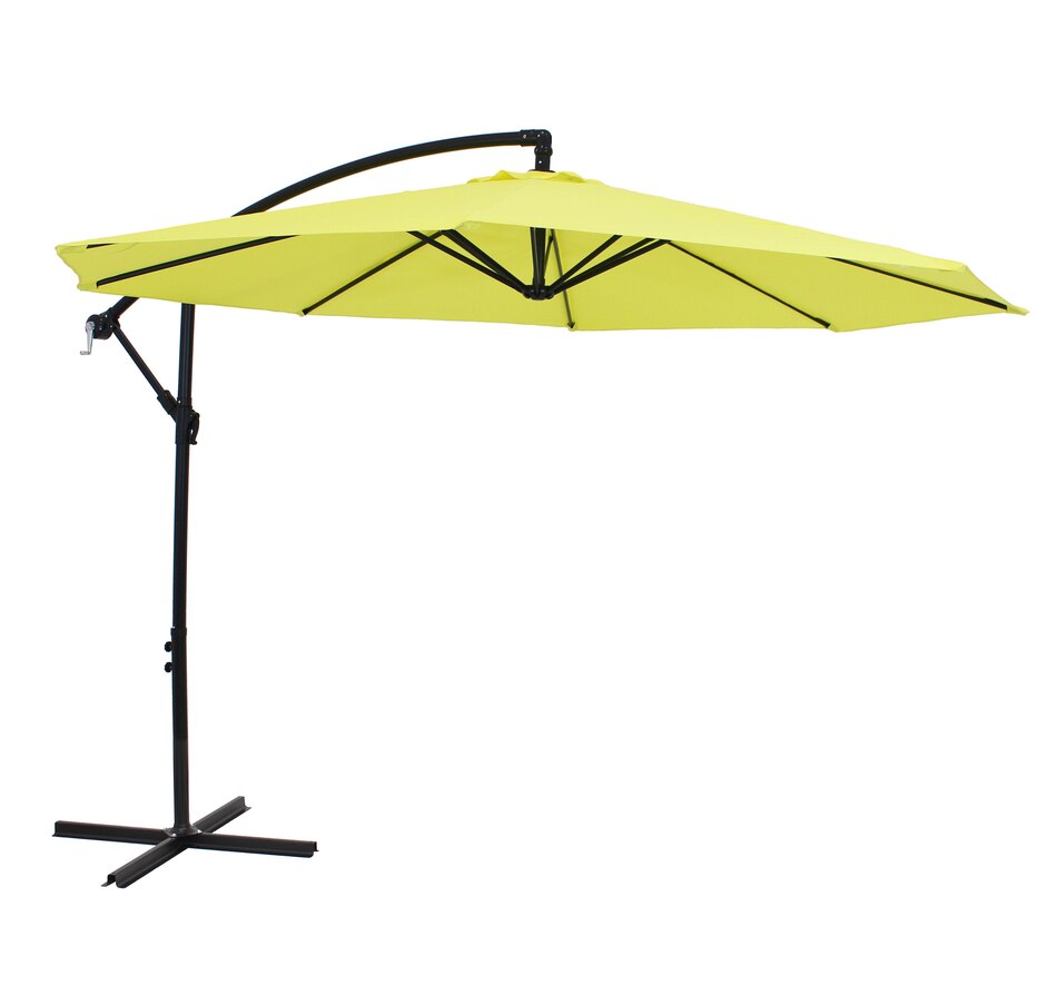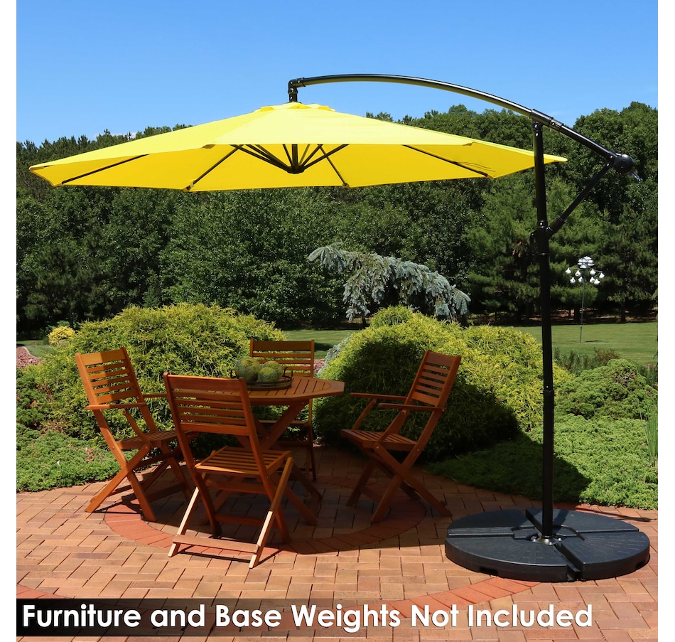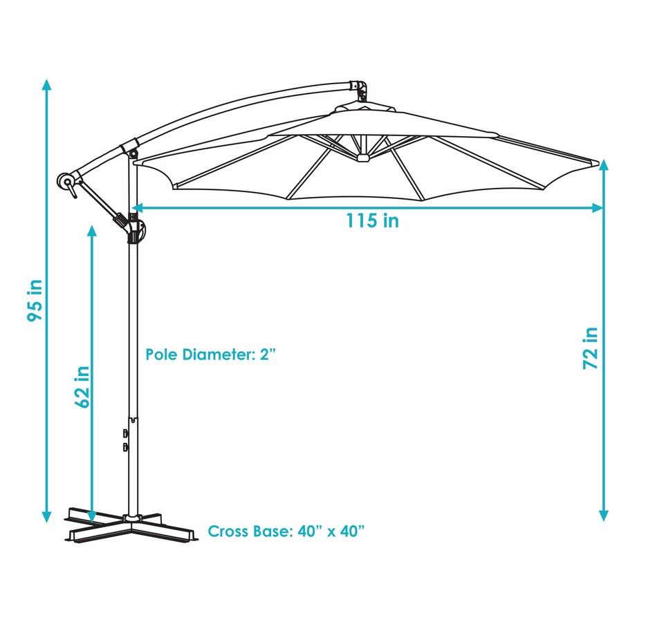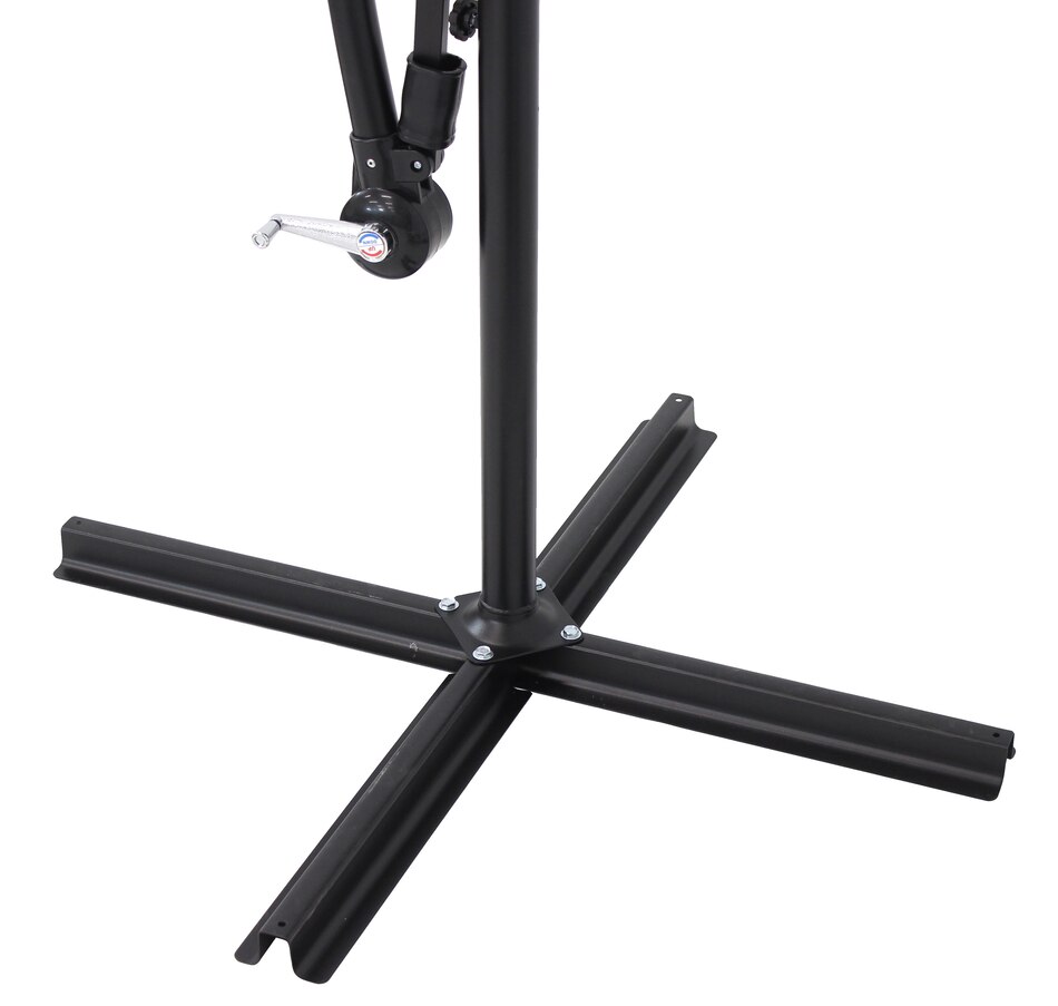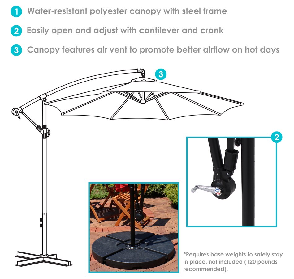 Provide style and shade for outdoor living spaces with this offset cantilever patio umbrella featuring a crank for easy accessibility. Constructed of water-resistant polyester, the umbrella canopy is designed for durability and lasting use. The umbrella features a steel base and pole that provide a sturdy frame for resistance to wind. This outdoor patio accessory is easy to set up and adjust with the cantilever and crank. This umbrella is a great addition to any patio, deck, backyard, or any other outdoor living space to keep cool on hot days. A heavy base is required to properly support the cross base to keep this umbrella securely in place (base not included).