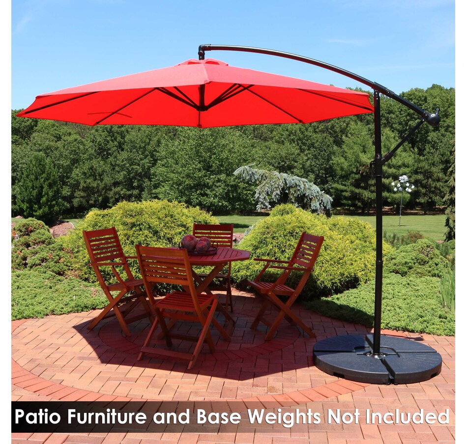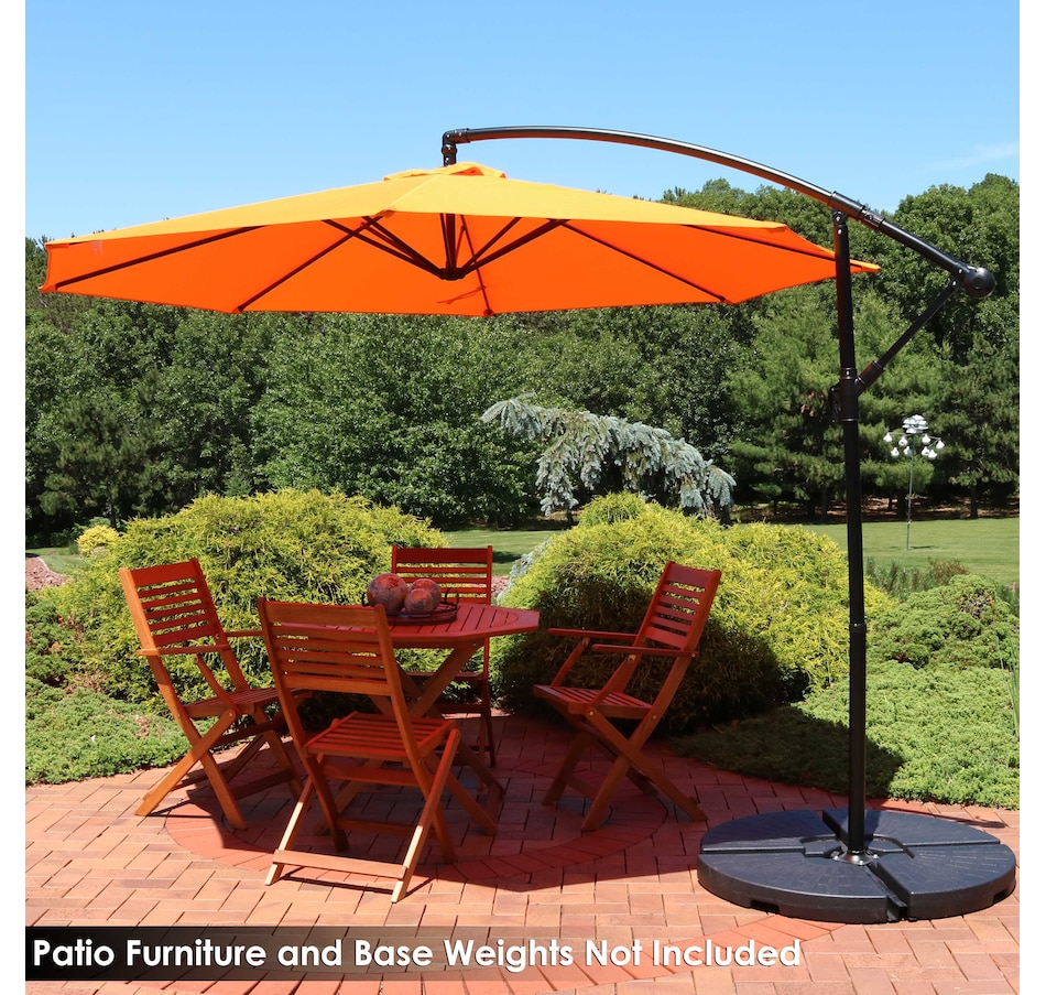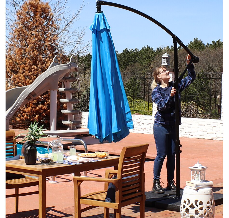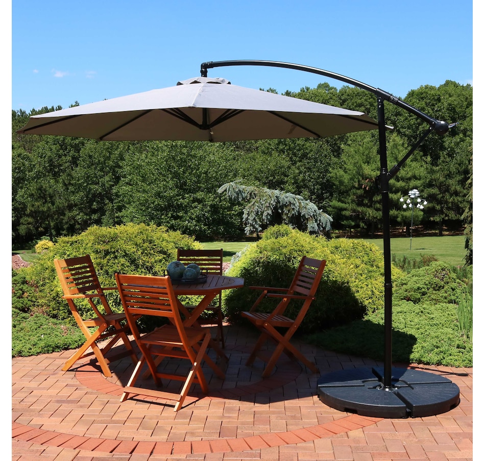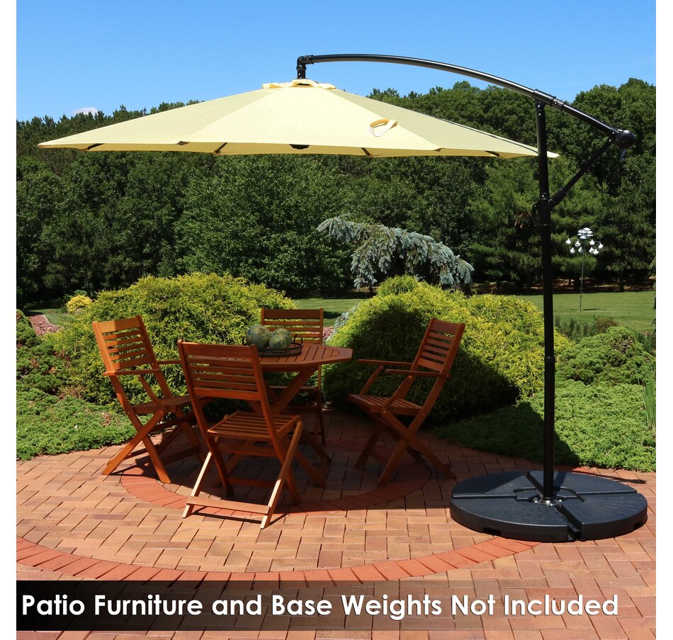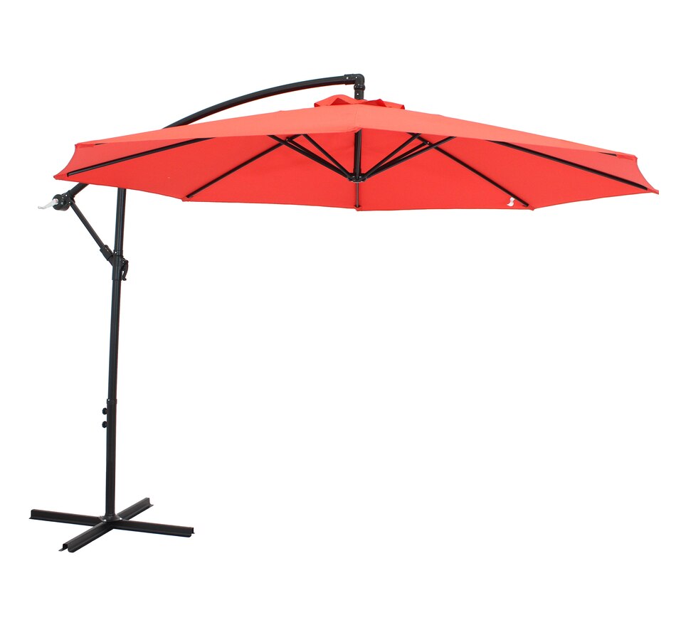 Provide style and shade for outdoor living spaces with this offset cantilever patio umbrella featuring a crank for easy accessibility. Constructed of water-resistant polyester, the umbrella canopy is designed for durability and lasting use. The umbrella features a steel base and pole that provide a sturdy frame for resistance to wind. This outdoor patio accessory is easy to set up and adjust with the cantilever and crank. This umbrella is a great addition to any patio, deck, backyard, or any other outdoor living space to keep cool on hot days. A heavy base is required to properly support the cross base to keep this umbrella securely in place (base not included).