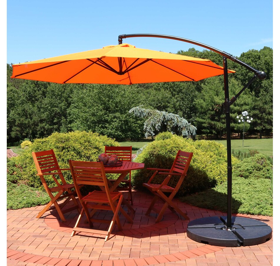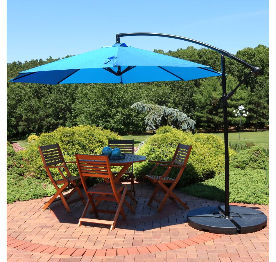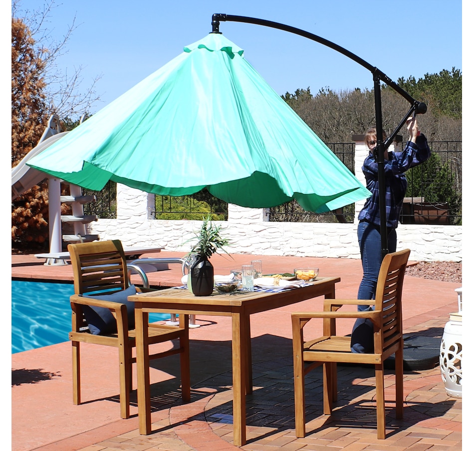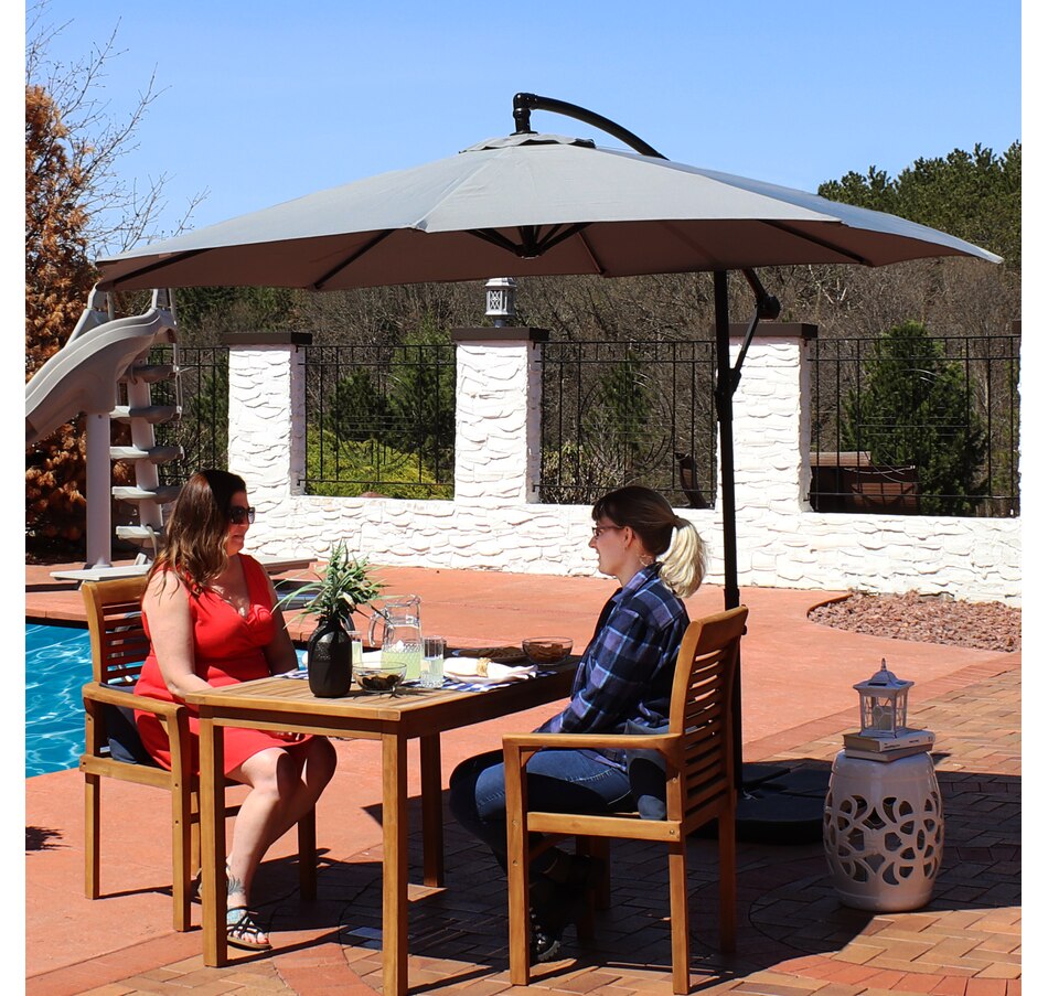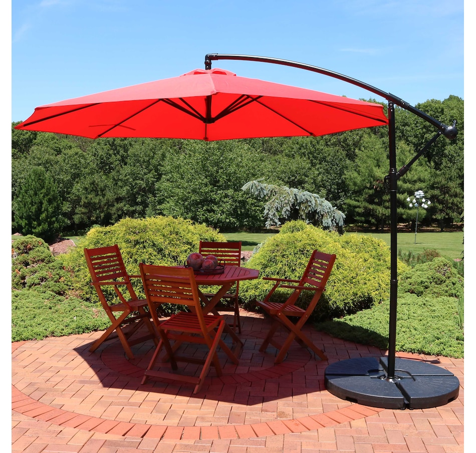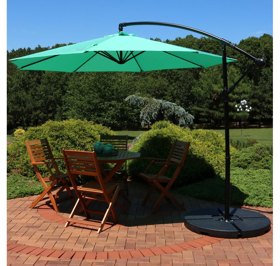 Provide style and shade for outdoor living spaces with this offset cantilever patio umbrella featuring a crank for easy accessibility. Constructed of water-resistant polyester, the umbrella canopy is designed for durability and lasting use. The umbrella features a steel base and pole that provide a sturdy frame for resistance to wind. This outdoor patio accessory is easy to set up and adjust with the cantilever and crank. This umbrella is a great addition to any patio, deck, backyard, or any other outdoor living space to keep cool on hot days. A heavy base is required to properly support the cross base to keep this umbrella securely in place (base not included).