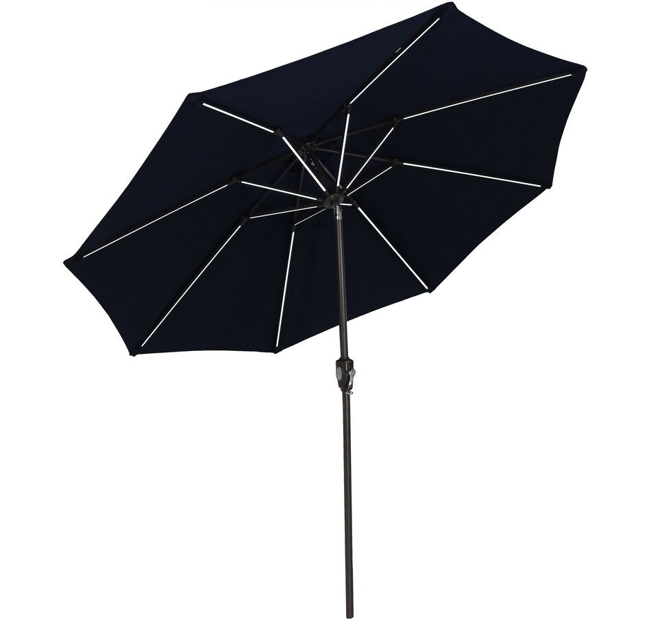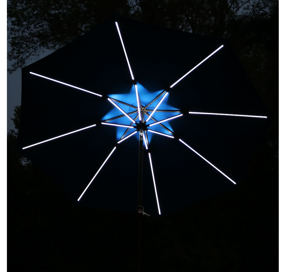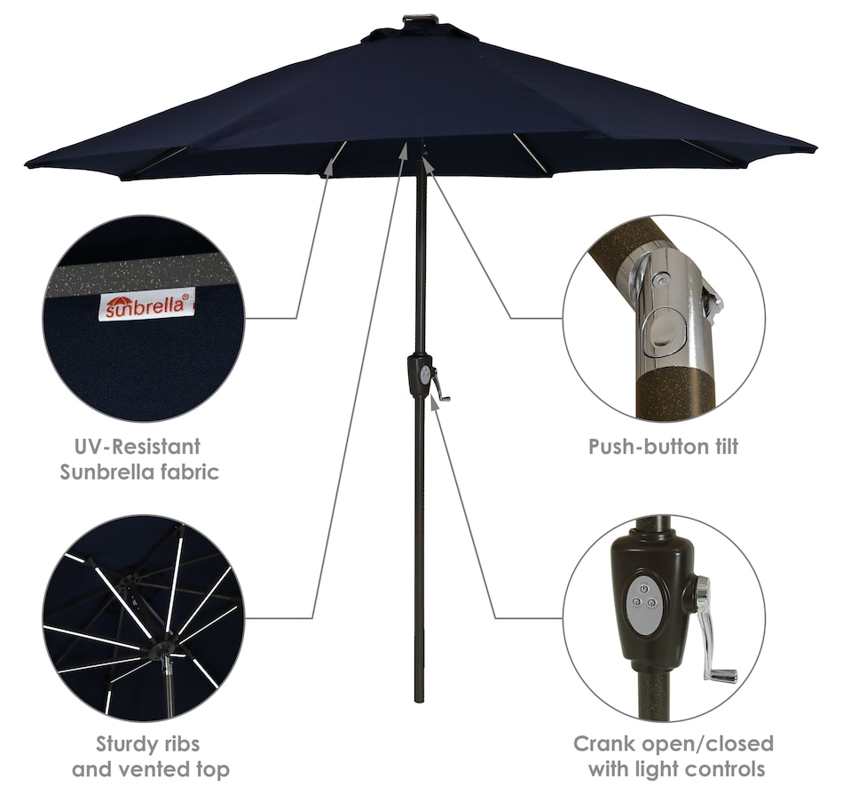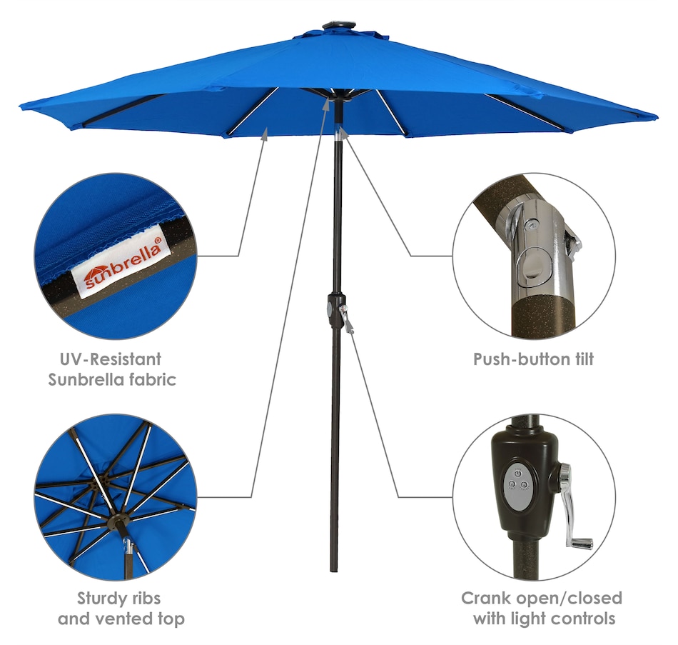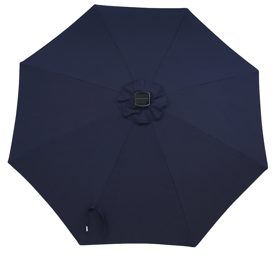 This solar Sunbrella outdoor patio market umbrella is great for any outdoor backyard or patio space. The 103" diameter patio umbrella canopy is engineered to last with 100% solution-dyed 220g acrylic Sunbrella fabric. Solution-dyed means that the fibers the fabric is made from are dyed before being woven which results in a more long-lasting, fade-, and stain-resistant color. The 2,000-hour color fastness means that this fabric will not fade as quickly as others. The pole and ribs are made from rust-resistant, powder-coated aluminum while the fittings are stainless steel. Solar-operated LED light bars are located along each of the 8 ribs. When fully charged, the solar lights will run up to 3-4 hours. To turn them on, simply use the buttons located on the umbrella pole. There are 3 different sections, choose any section to light up, a combination of 2, or have all on at once. The solar panel is located on top of the umbrella that is charged via direct sunlight during daylight hours. To use the auto-tilting option simply open the umbrella all the way and keep cranking it until the desired tilt angle is reached.