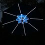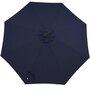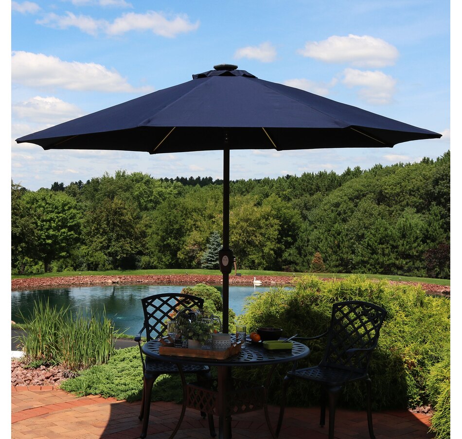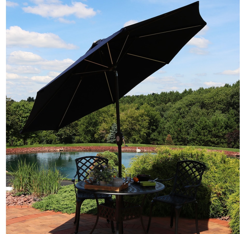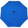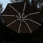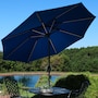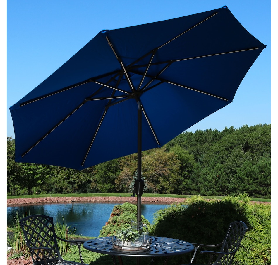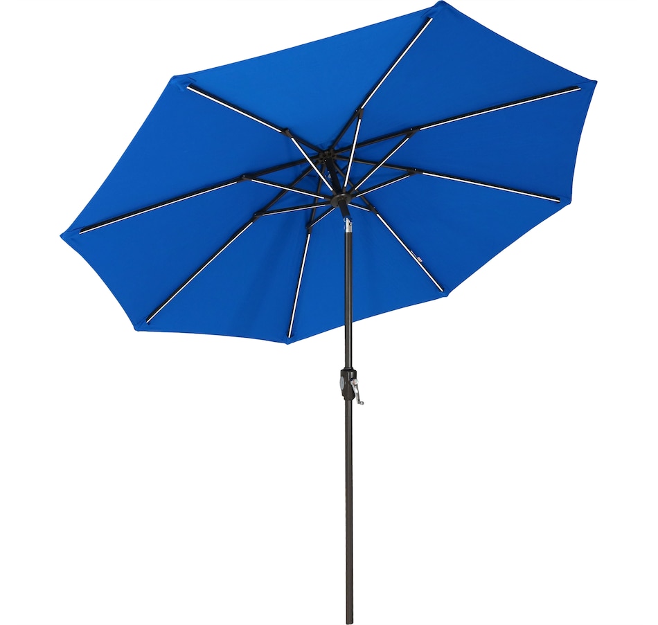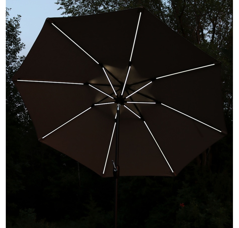 This solar Sunbrella outdoor patio market umbrella is great for any outdoor backyard or patio space. The 103" diameter patio umbrella canopy is engineered to last with 100% solution-dyed 220g acrylic Sunbrella fabric. Solution-dyed means that the fibers the fabric is made from are dyed before being woven which results in a more long-lasting, fade-, and stain-resistant color. The 2,000-hour color fastness means that this fabric will not fade as quickly as others. The pole and ribs are made from rust-resistant, powder-coated aluminum while the fittings are stainless steel. Solar-operated LED light bars are located along each of the 8 ribs. When fully charged, the solar lights will run up to 3-4 hours. To turn them on, simply use the buttons located on the umbrella pole. There are 3 different sections, choose any section to light up, a combination of 2, or have all on at once. The solar panel is located on top of the umbrella that is charged via direct sunlight during daylight hours. To use the auto-tilting option simply open the umbrella all the way and keep cranking it until the desired tilt angle is reached.