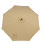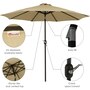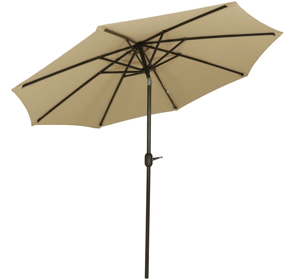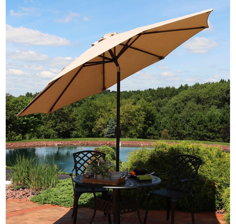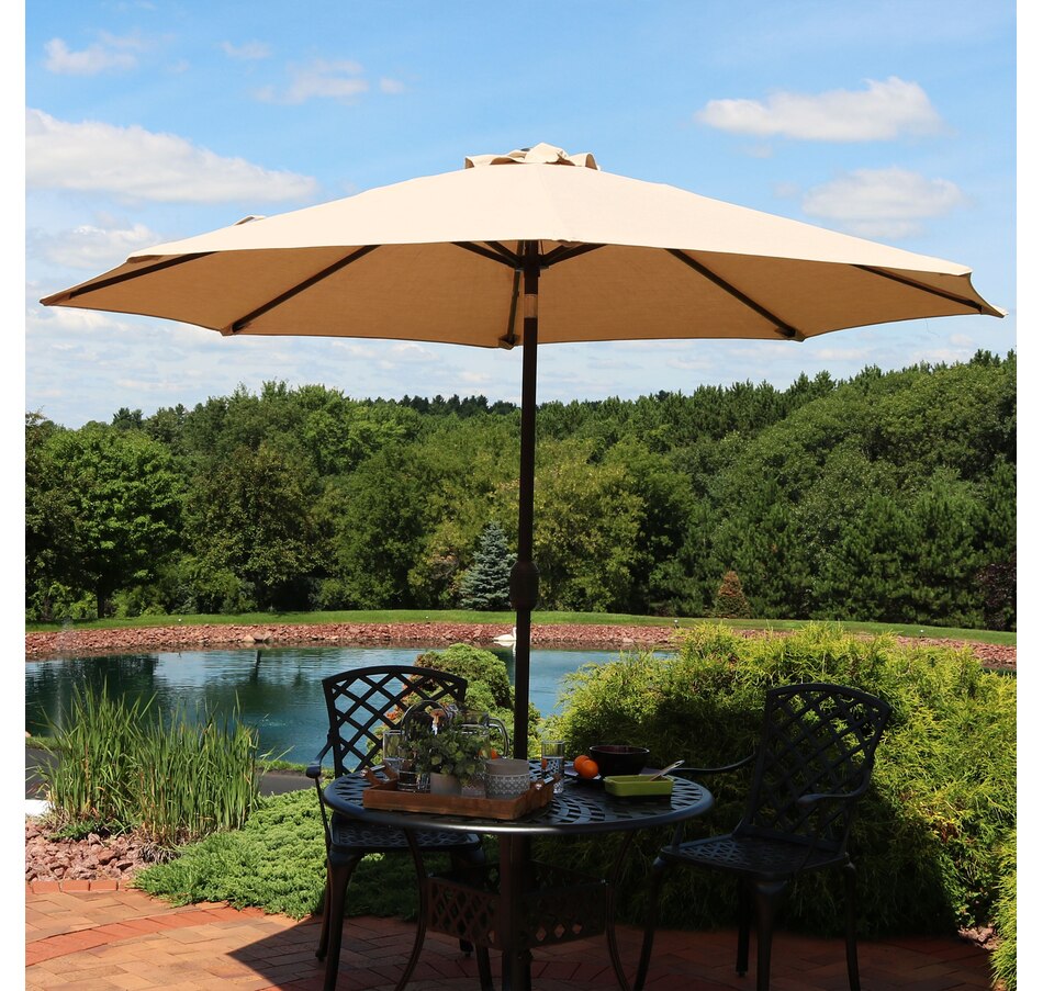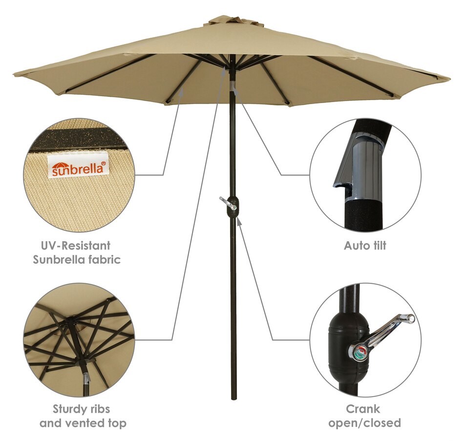 Bring vibrant, functional shade to outdoor spaces with this 9-foot market umbrella. Designed to enhance patios, decks, and backyards, it features a colorful canopy made from premium 220g solution-dyed acrylic Sunbrella fabric, offering fade resistance, UV protection, and water repellency with 2,000-hour color fastness. The rust-resistant, powder-coated aluminum pole and eight aluminum ribs provide lasting durability. The canopy opens smoothly with a crank handle and includes an auto-tilt function—simply continue cranking after fully opening to adjust the angle and maintain shade as the sun moves. A built-in wind vent at the top helps improve airflow and adds stability on breezy days. With a 1.5" diameter pole, this umbrella fits most standard bases and offers ample coverage for tables between 42 and 54 inches, shading 4 to 6 people comfortably. The two-piece construction allows for easy assembly and compact storage, while attached fabric ties keep the canopy neatly secured when closed.