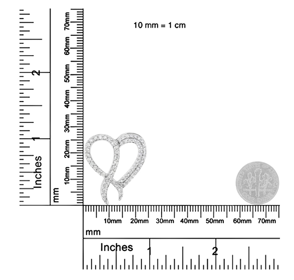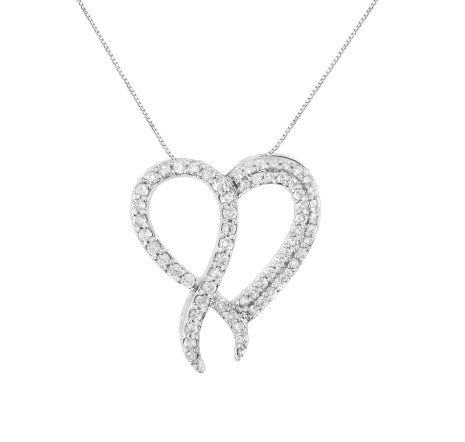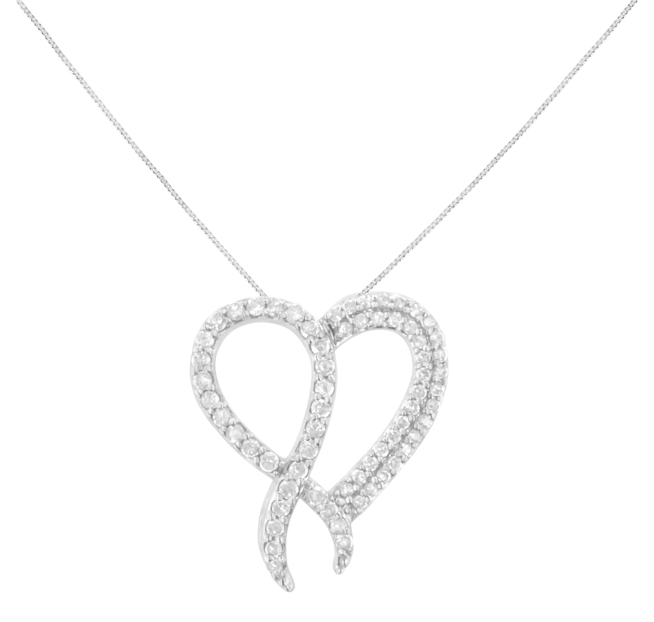 This elegant .925 sterling silver pendant has a gorgeous heart motif with a ribbon overlapping to one side. The necklace is studded with 1 ct tdw of beautiful, round-cut diamonds in a prong setting. This piece comes with a sterling silver 18" inch box chain.