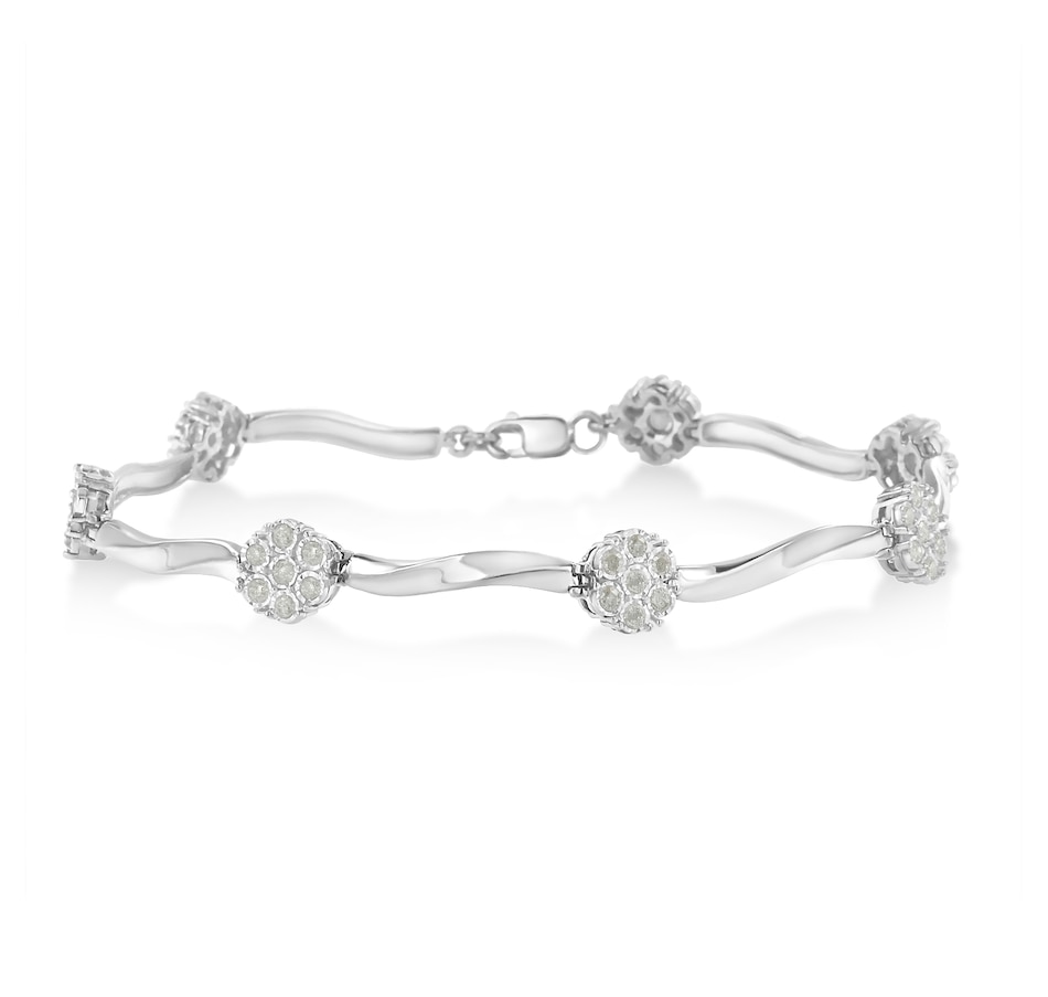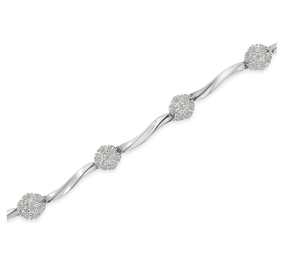 .925 Sterling Silver 1.0 Cttw Diamond Cluster Miracle-Set Station & Twisted Bar 7" Tennis Bracelet (H-I Color, I1-I2 Clarity)
