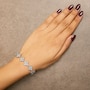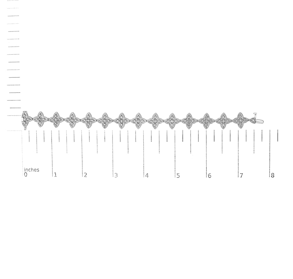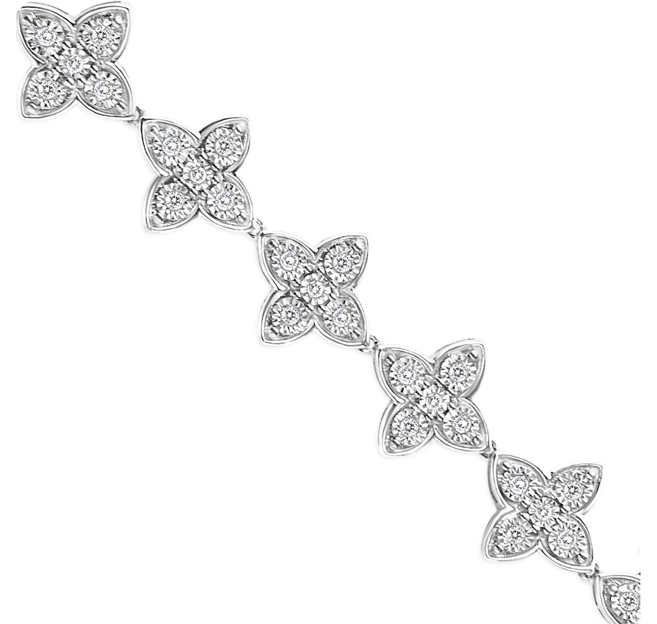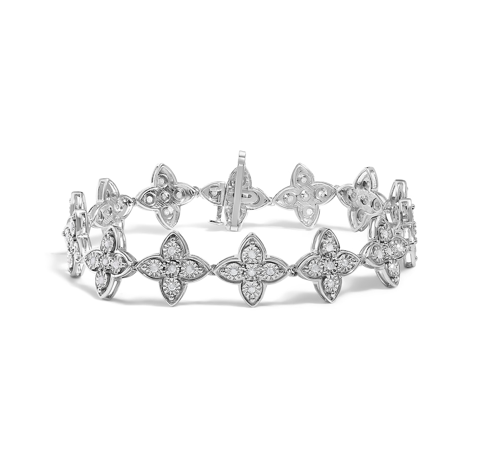 This sterling silver 1ct TDW diamond bracelet is absolutely breathtaking. Glimmering, promo quality, round cut diamonds in a miracle setting sit inside a flower shaped link. 14 flowers connected with each other create this beautiful bracelet that secures with a box with clasp mechanism. Promo quality diamonds are on the lowest of diamond color and quality scale. Round-cut, promo quality diamonds are milky and cloudy in nature. They have asymmetrical ball shape and are filled with inclusions.