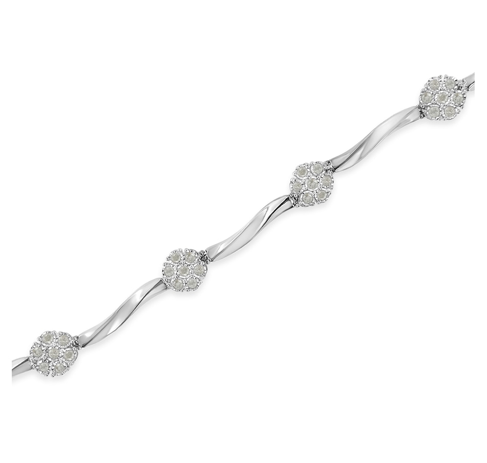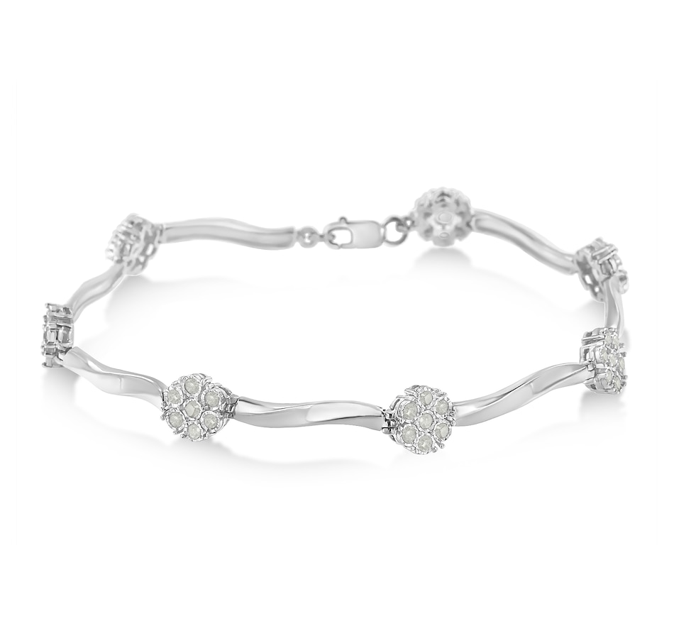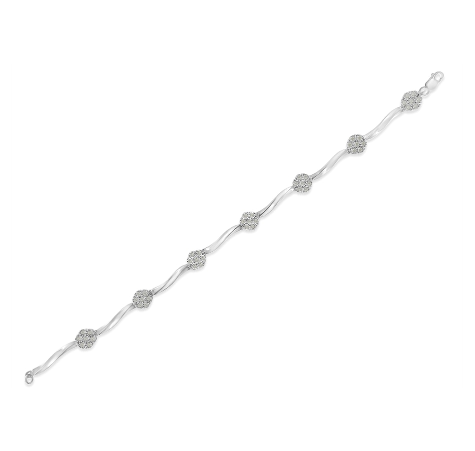 Elegant and timeless, this gorgeous sterling silver floral link bracelet features 1.0 carat total weight of round cut diamonds. The tennis bracelet features round, flower shaped cluster links along with an elongated S wave link. The round links are set with one carat total weight of petite genuine round near colorless I-J color, I3 clarity diamonds. The diamonds are each set in the center of a miracle plate mounting that amplifies and reflects the natural beauty of the stone. The 7” bracelet fastens with an easy to operate and secure lobster claw clasp and is crafted of real 92.5% sterling silver for a shine for years to come. This classic bracelet makes a great gift for a formal dress occasion! Whether worn for daytime glamour or evening sparkle, this bracelet is gorgeously versatile. Give her a gift that will perfectly complement her favorite ensemble.