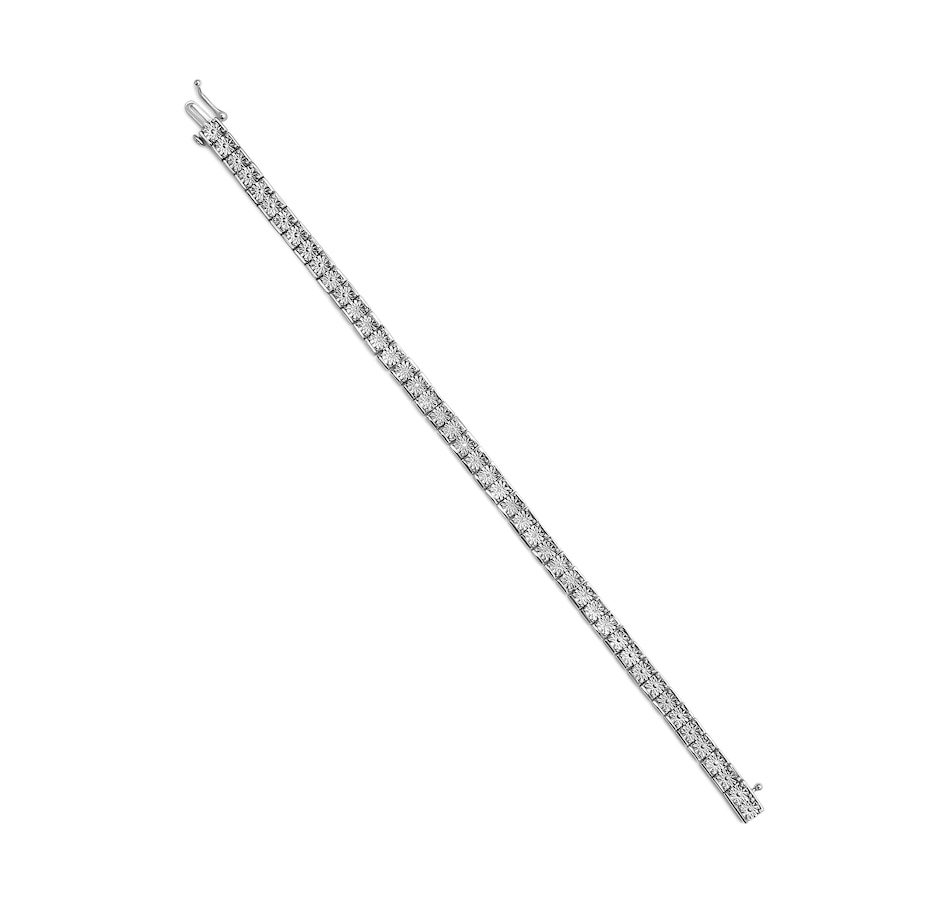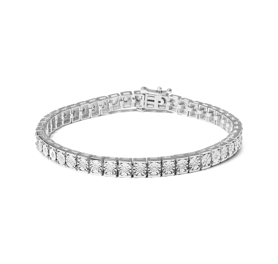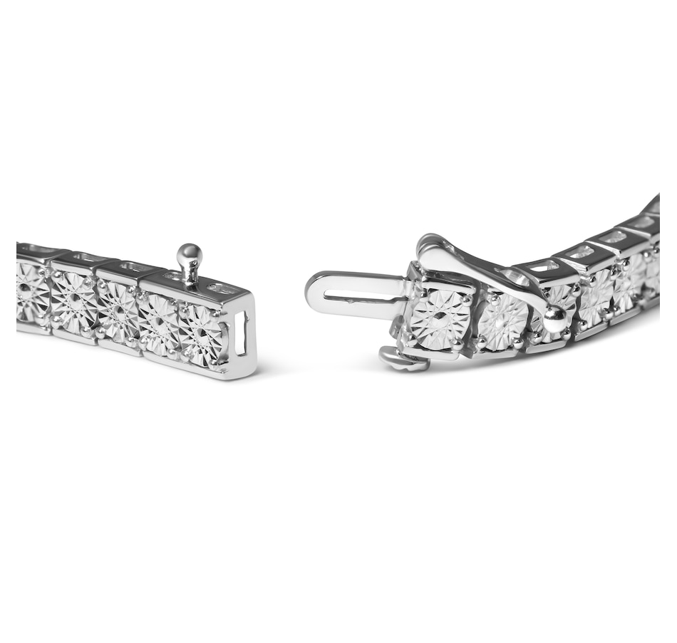 Enhance your jewelry collection with a stunning and elegant addition. This beautiful sterling silver tennis bracelet features a breathtaking display of 22 natural round cut diamonds, weighing in at a total of 1/10 carats. Expertly set in a miracle setting, the diamonds radiate with a warm I-J color and a clarity of I2-I3, creating a sparkling contrast against the gleaming silver band. Measuring 7.25 inches in length, the bracelet is secured with a sturdy box clasp for added peace of mind. Whether dressing up for a special occasion or simply accenting your everyday look, this sterling silver diamond tennis bracelet is the perfect way to add a touch of timeless beauty and luxury to your wardrobe.