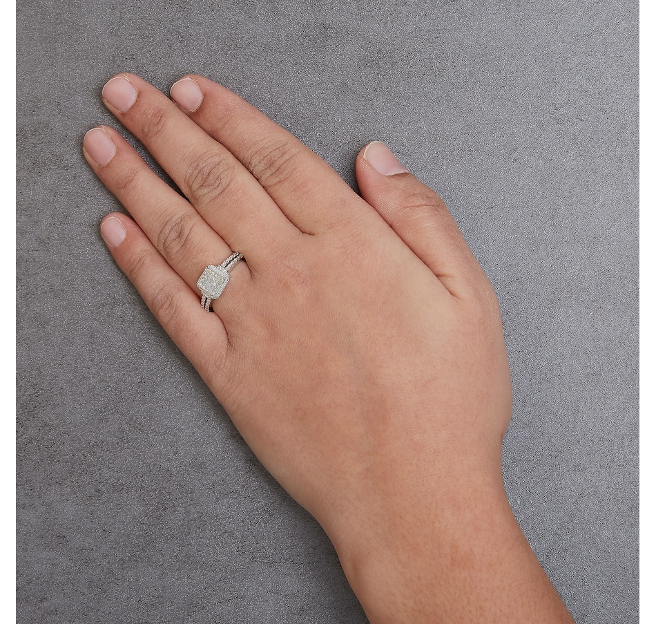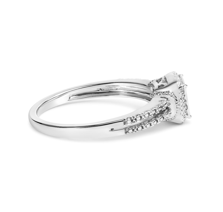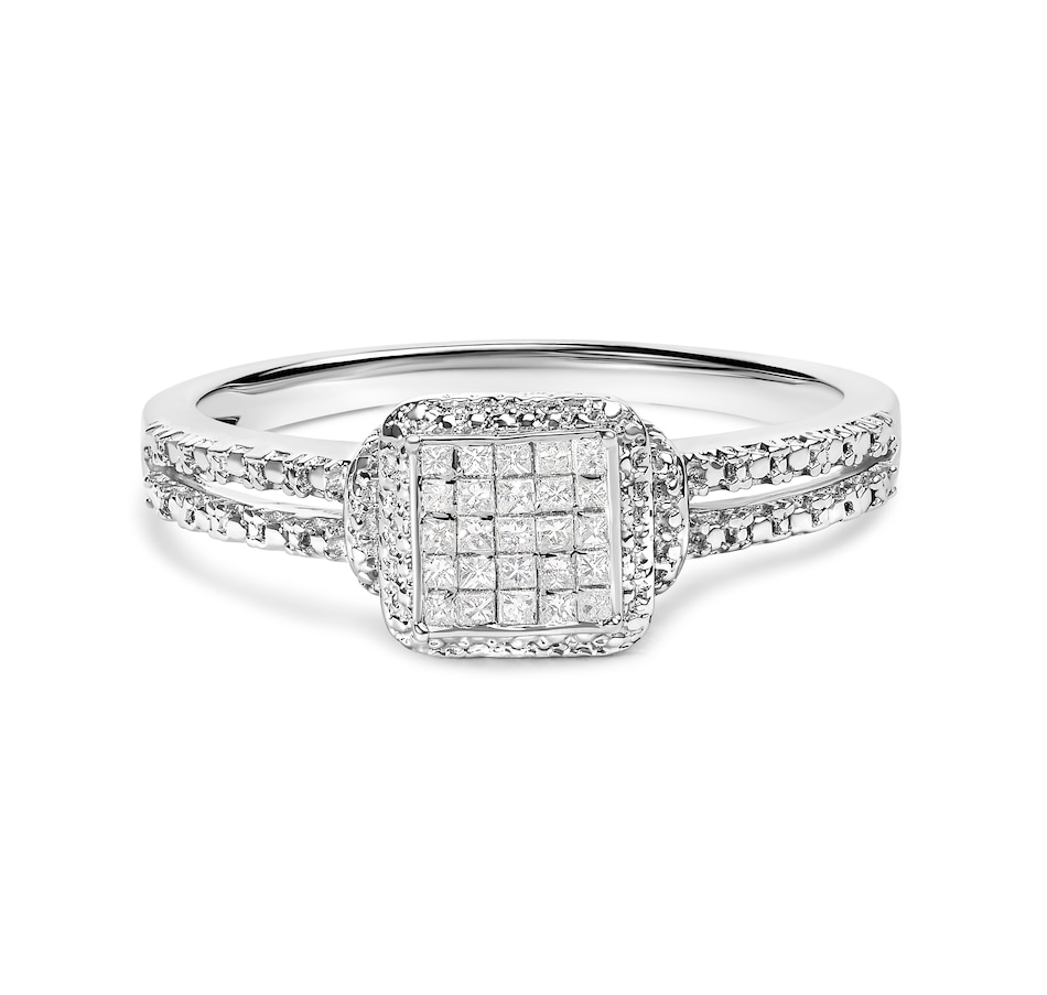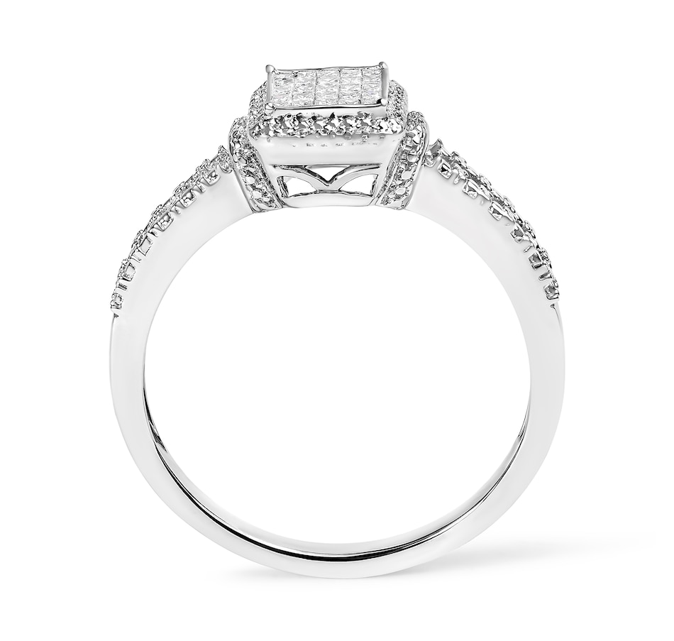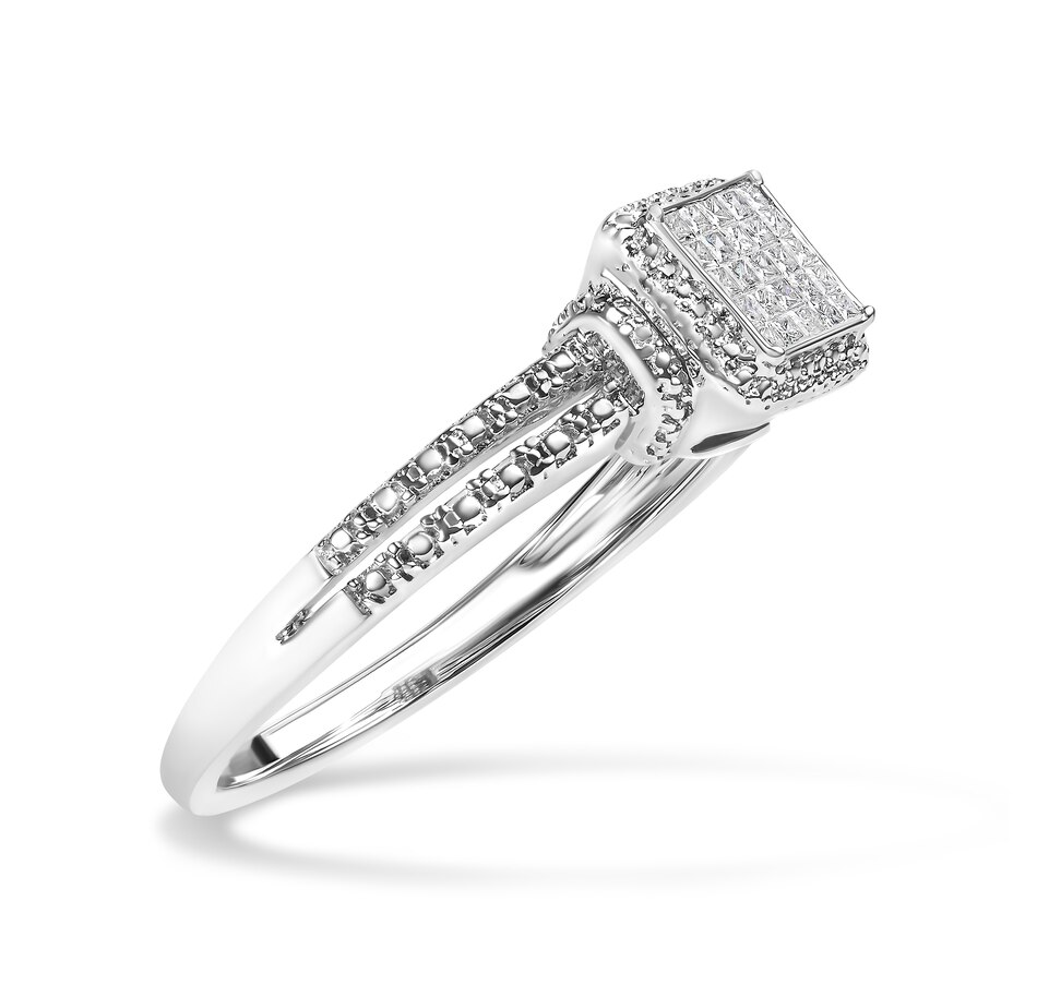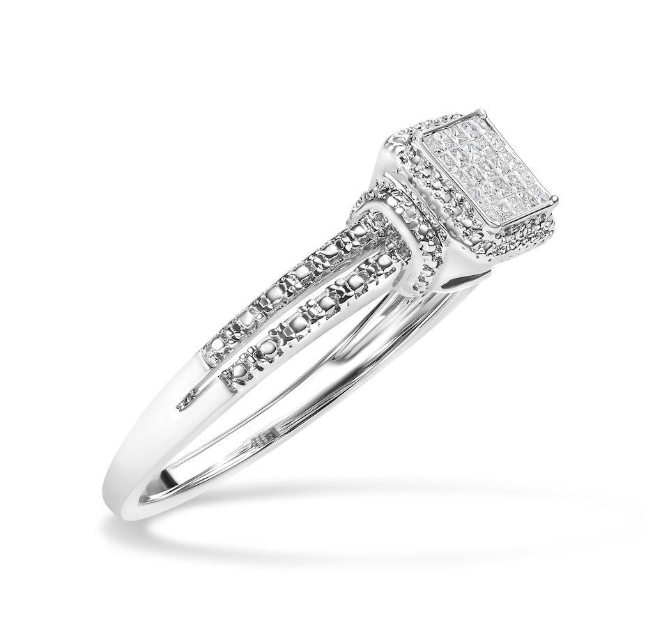 Whether you’re wearing it as a fashion piece or as an engagement ring, this piece will definitely be a conversation starter. Crafted in .925 Sterling Silver, the ring is adorned with 25 princess-cut diamonds in an invisible setting that total up to 1/4 cttw in the center. Beading details — that surround the stones to the band — take the design to the next level. The piece is completed with a double beaded shank for extra bit of elegance.