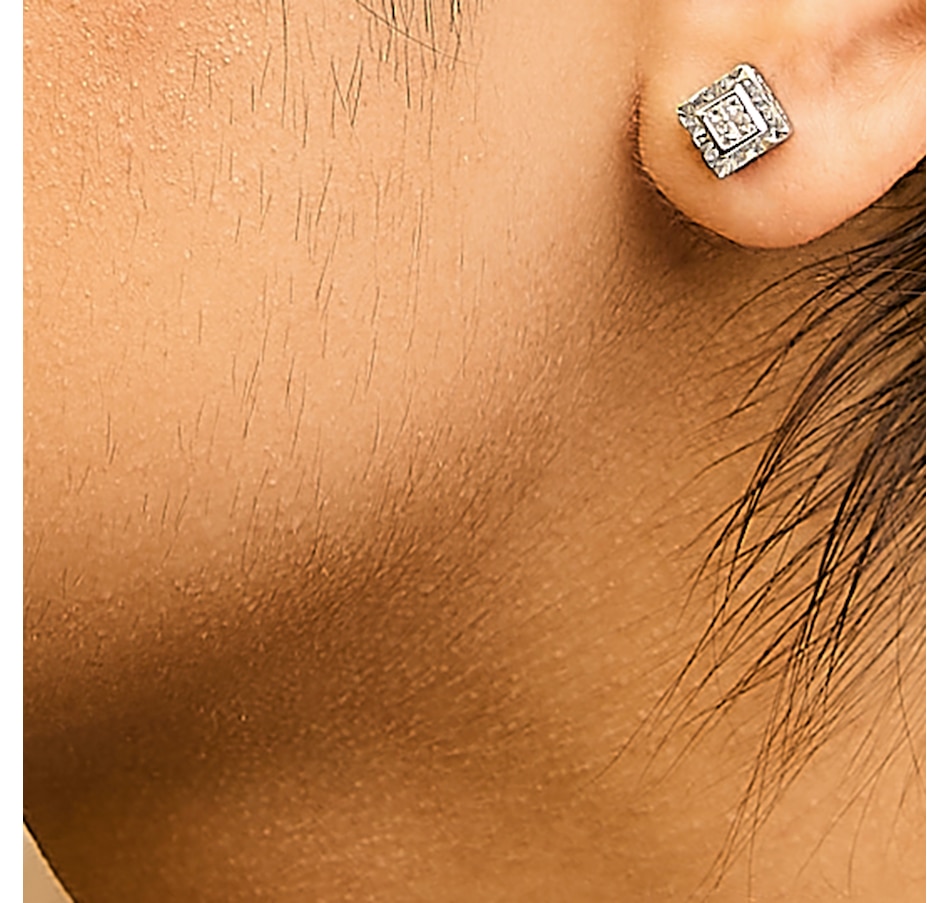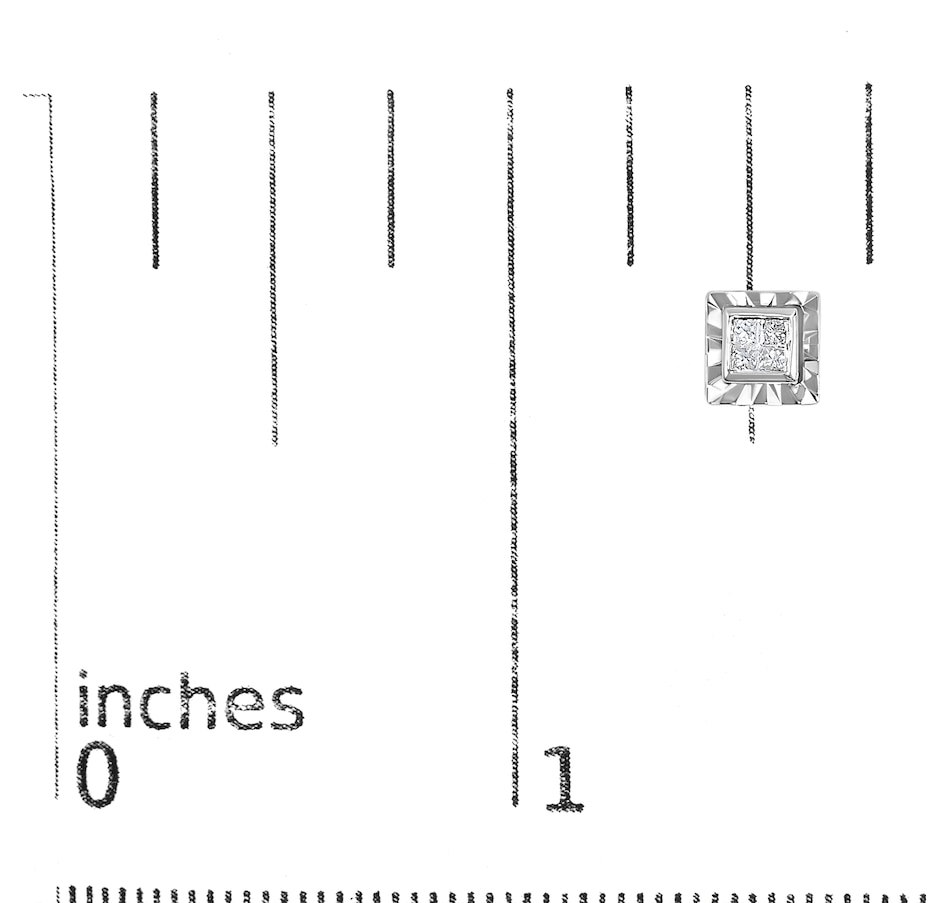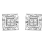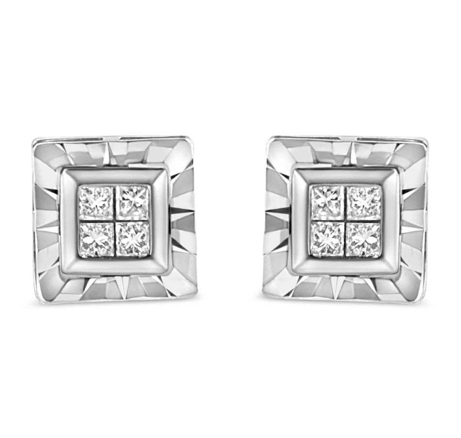 You will love these elaborately designed stud earrings set in cool .925 sterling silver. The outer square of these composite studs display a textured silver look, followed by a band of silver outlining four princess-cut diamonds at the center. These diamonds are invisible set and have a total carat weight of 1/6 cttw. Wear these earrings to any event and be dazzled by compliments.
